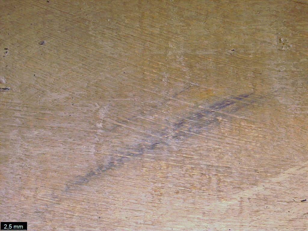 Chips of what looks like fragments of charcoal are partly embedded in the light brown paint of the foreground and - slightly less - in the light green field above. They may derive from an underdrawing executed in charcoal or, alternatively, from a contamination of the paint on the palette.