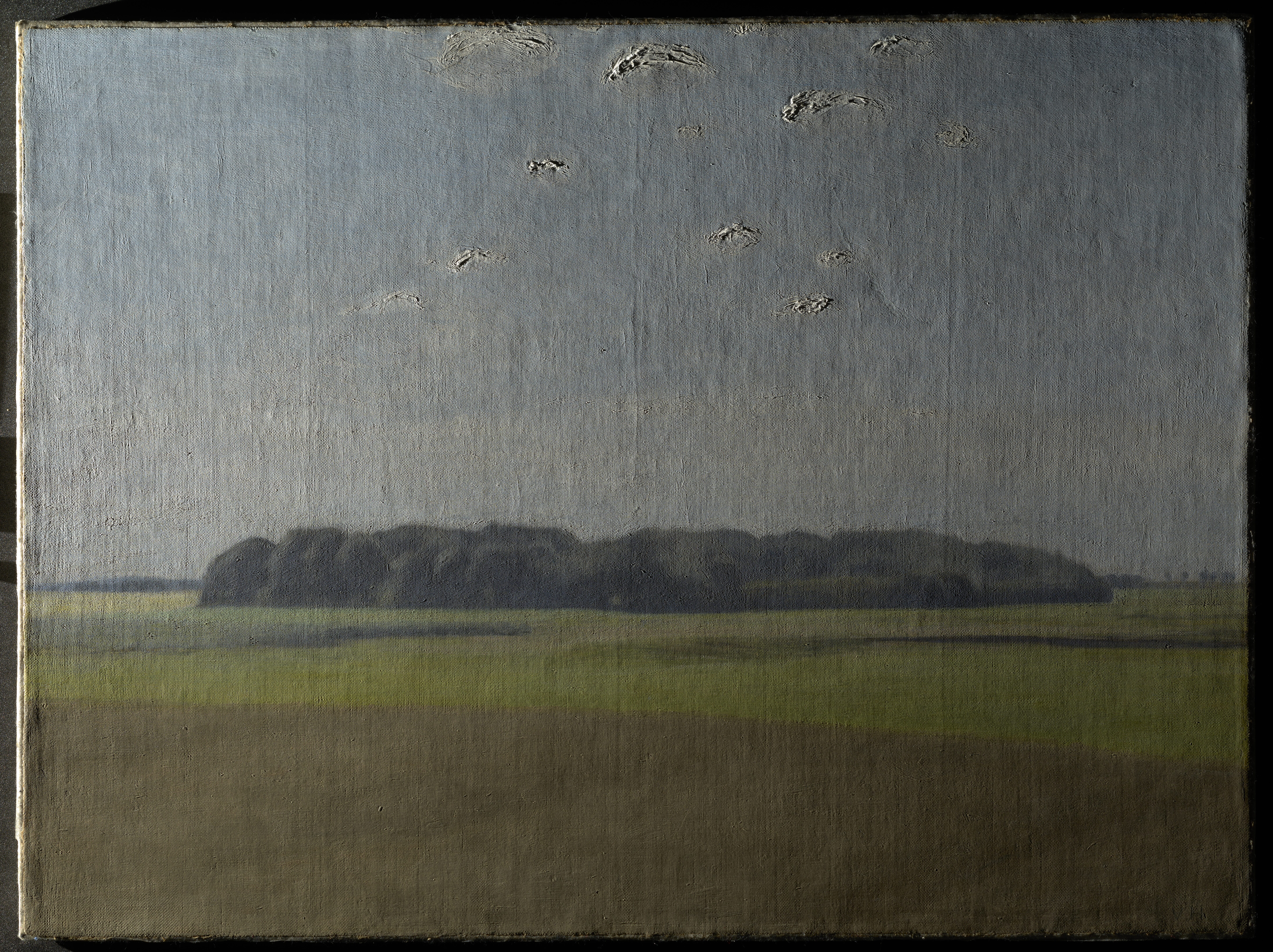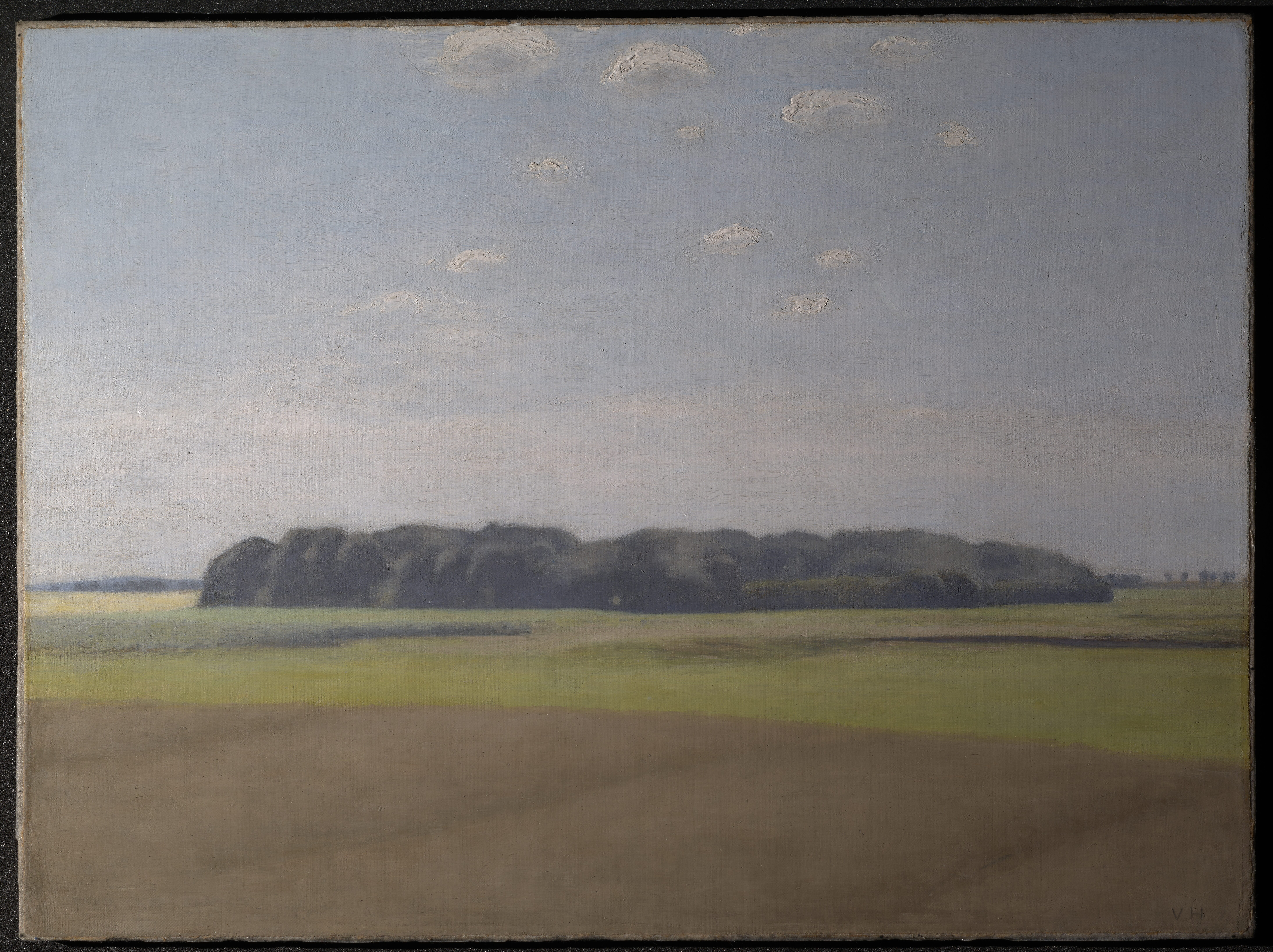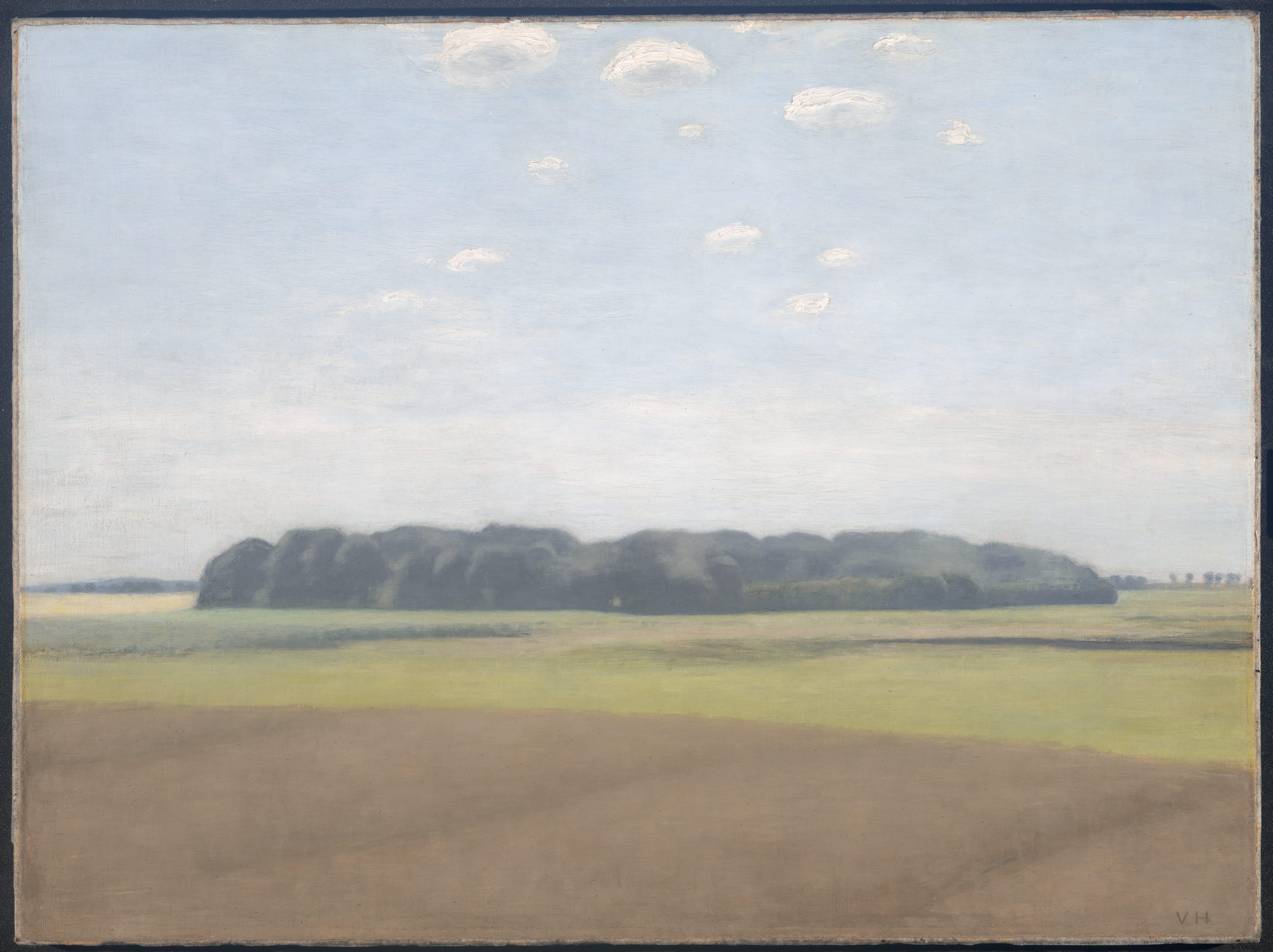 I Forgrunden en bred Strækning brun Pløjejord. Luften blaalig med smaa hvidlige Klodeskyer.