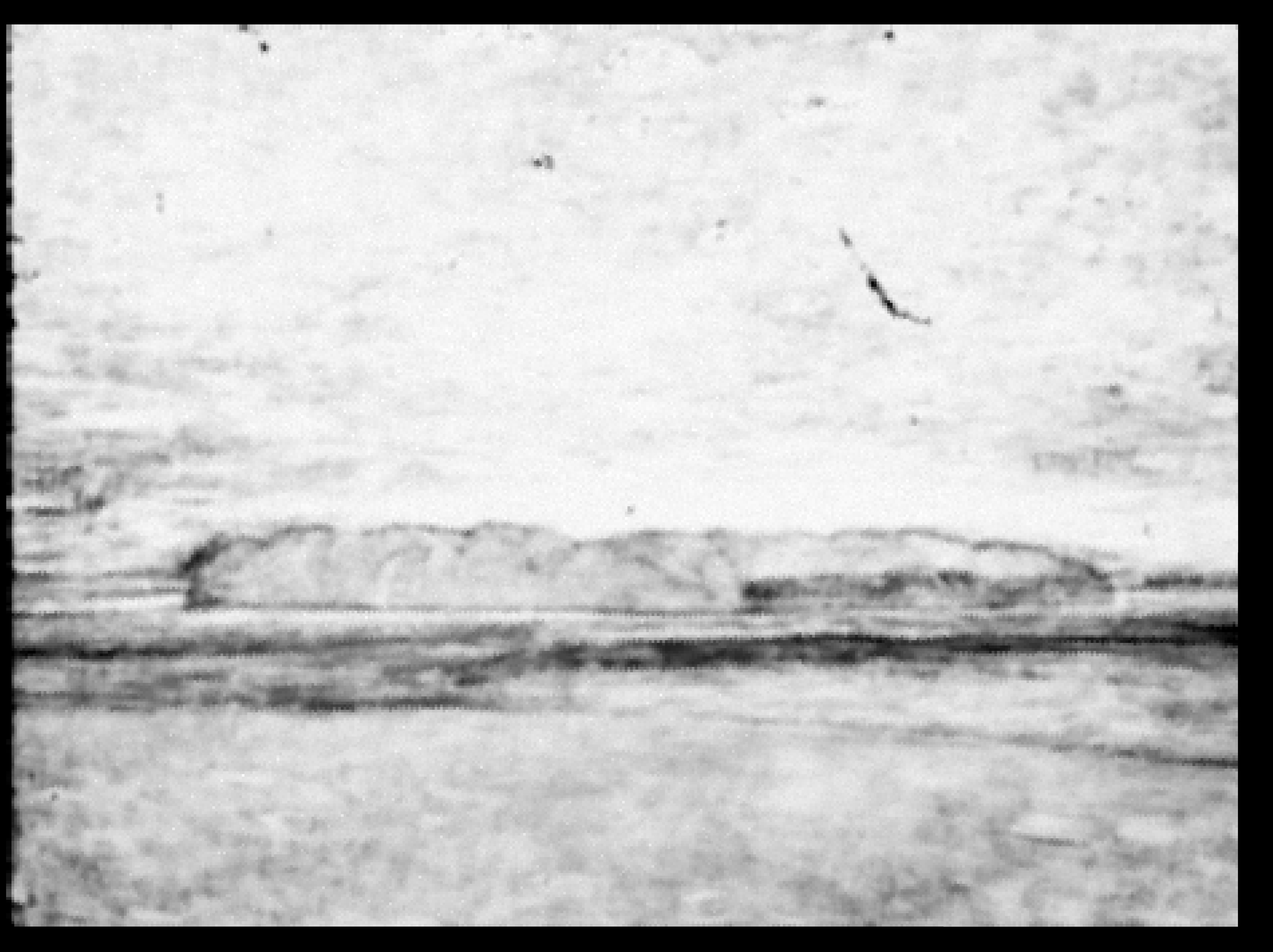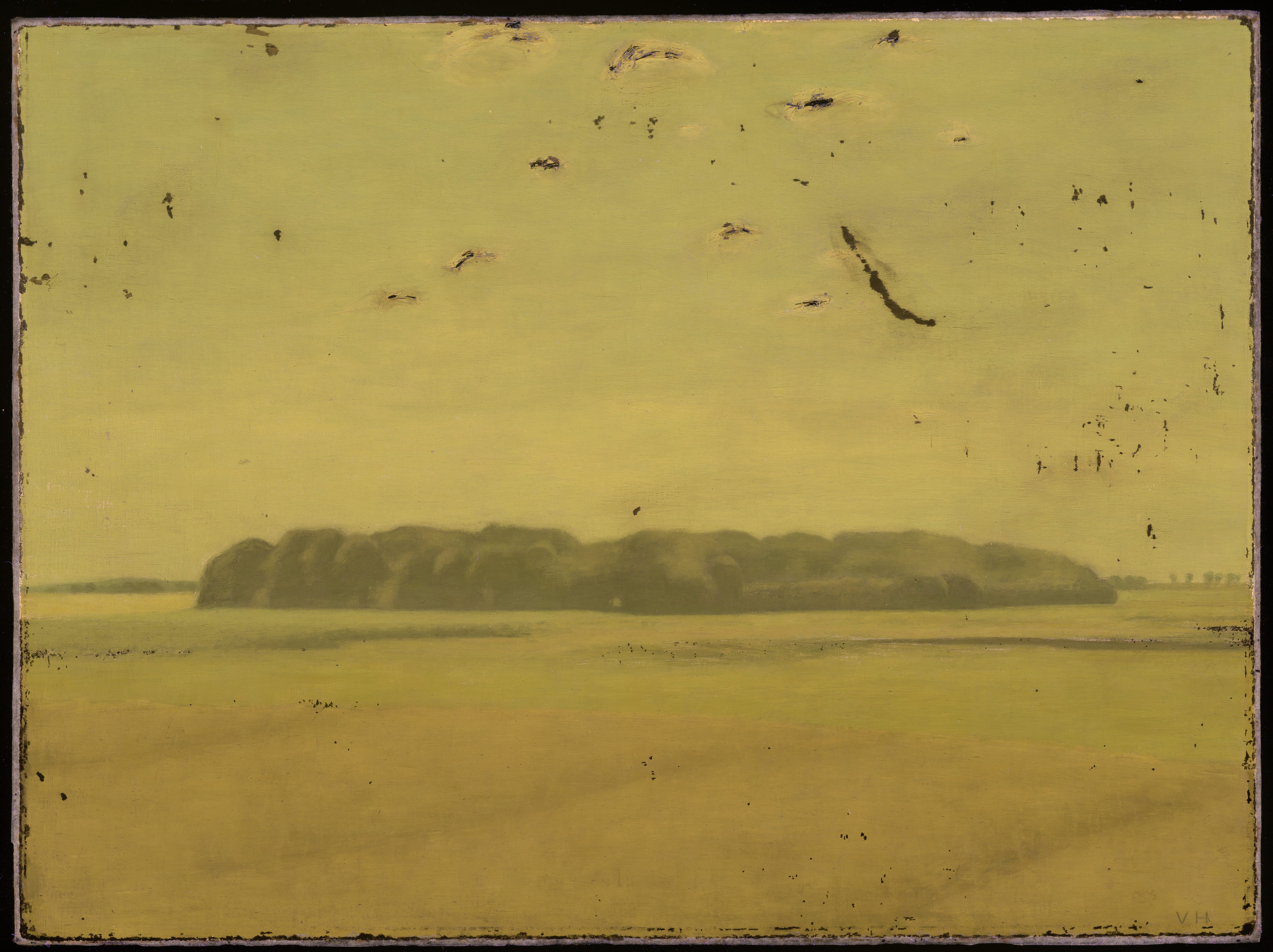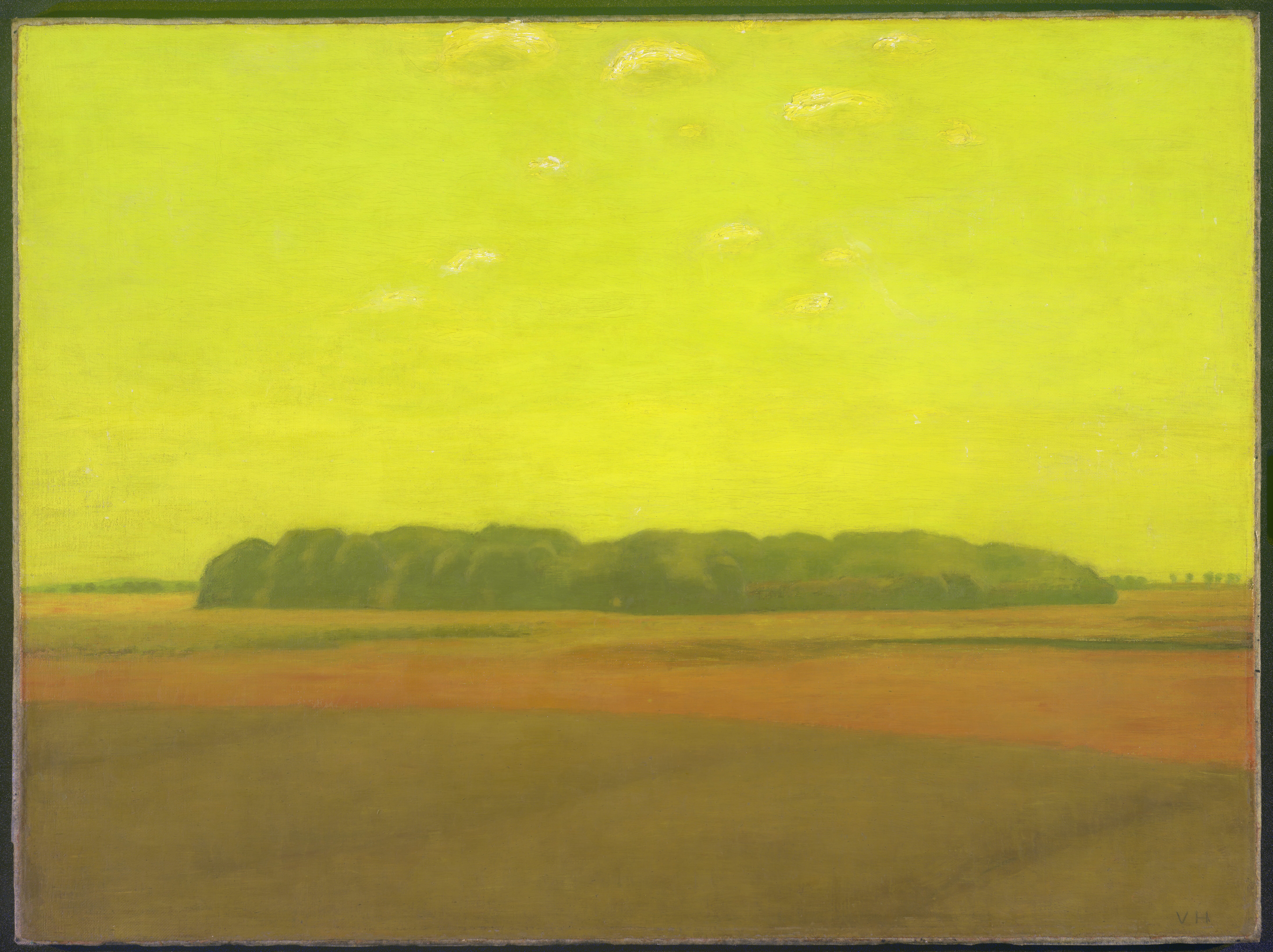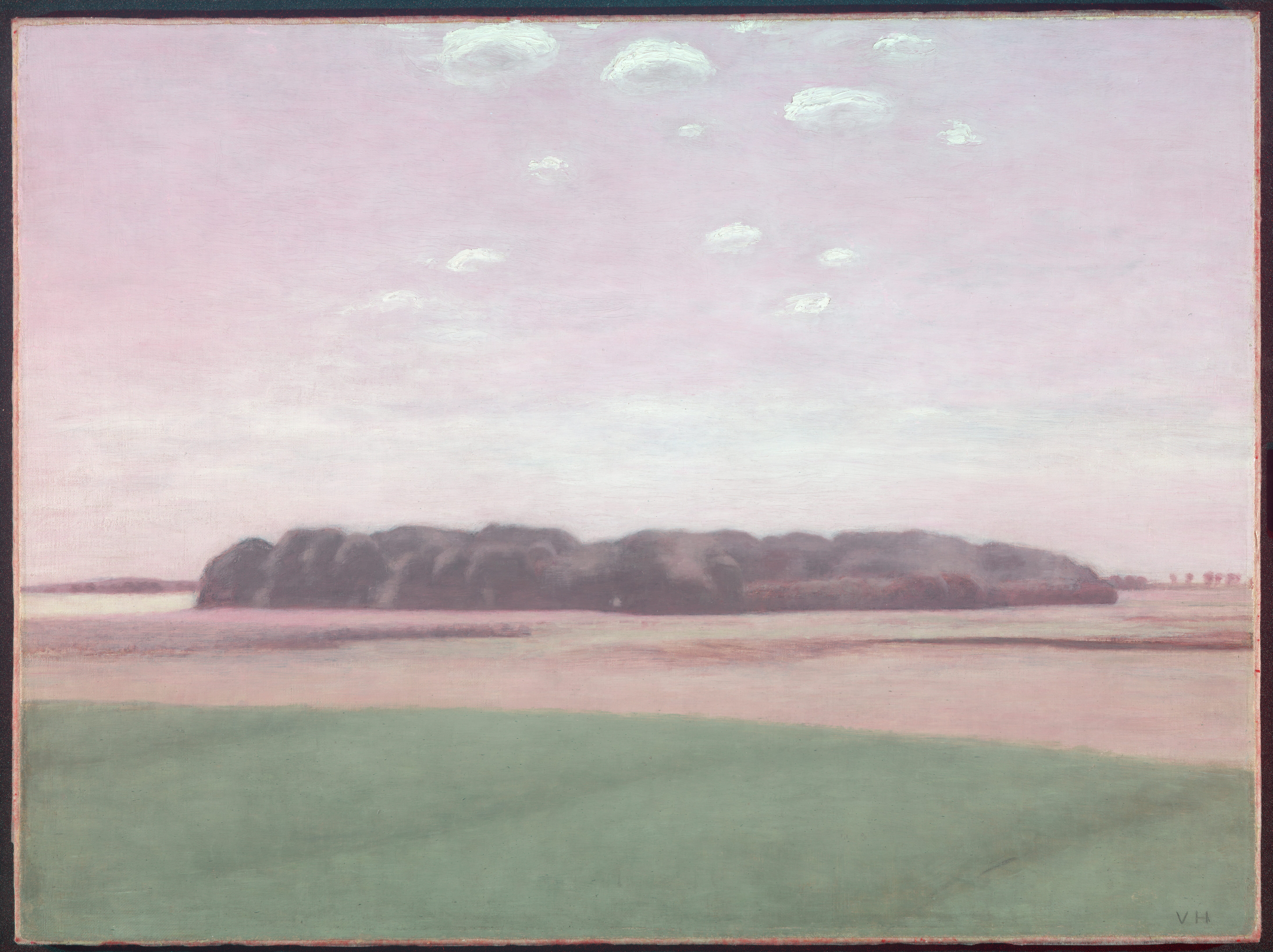 I Forgrunden en bred Strækning brun Pløjejord. Luften blaalig med smaa hvidlige Klodeskyer.