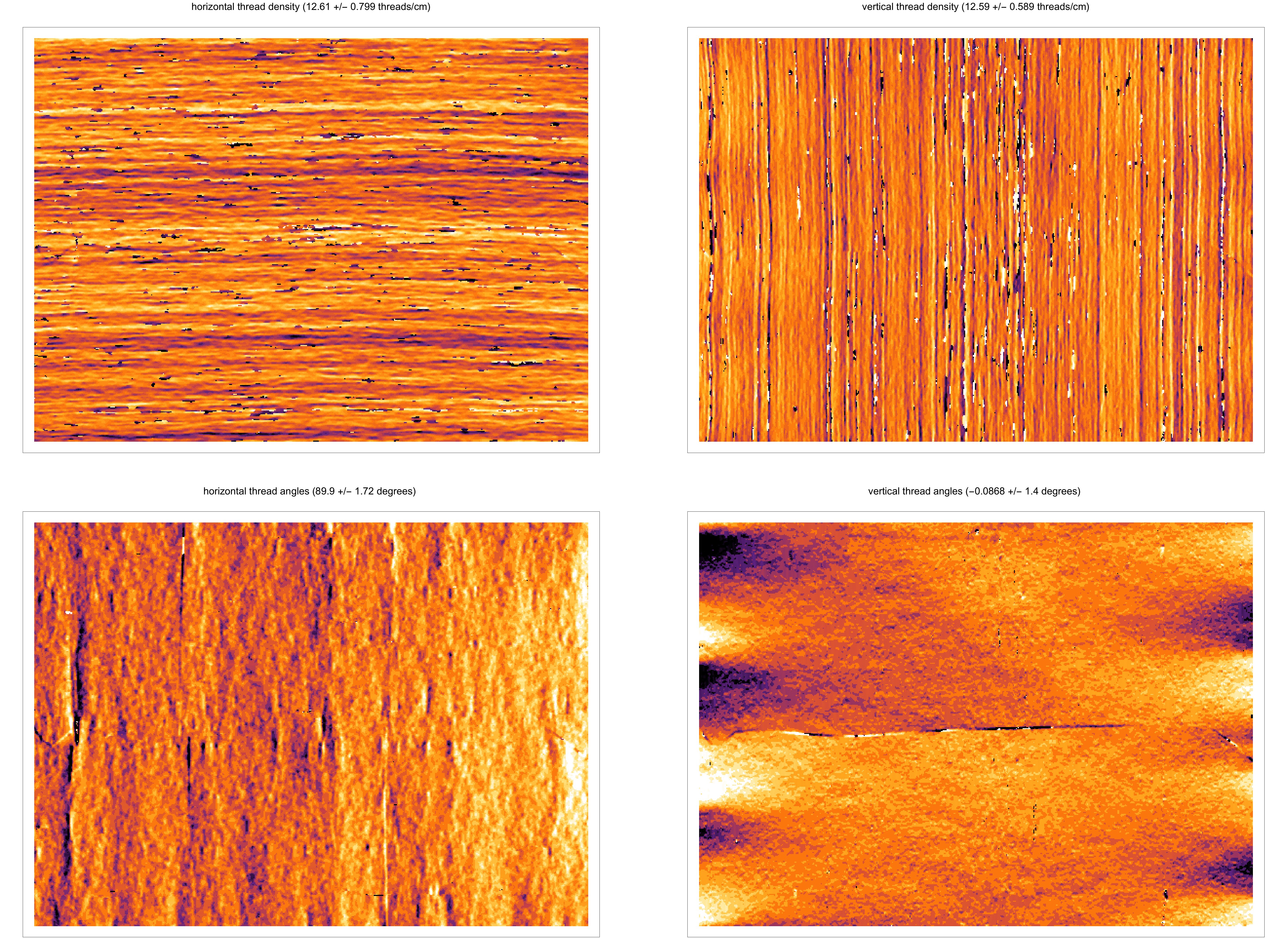 Weave maps are detailed visualisations of the thread patterns in a canvas, created by applying thread counting on high-resolution x-radiographs. These are used for analysing the structure of the canvas and to compare canvases used in different paintings. A comparison between weave maps can sometimes determine if two or more pieces of canvas derive from the same batch and thereby shed light on the place and period in which a painting has been created.