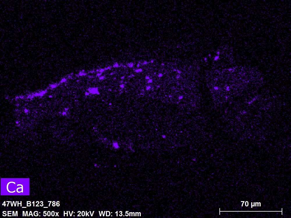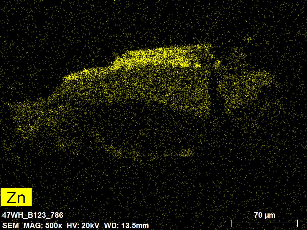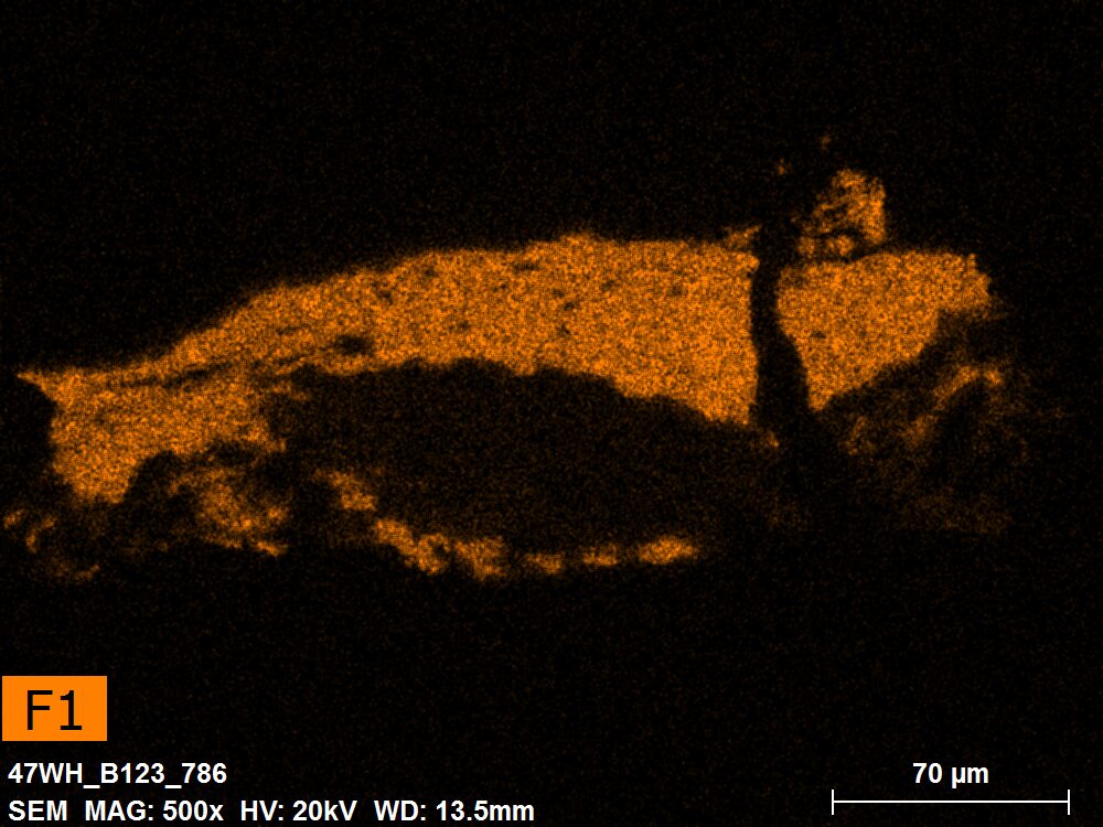 SEM-EDXS is a technique that provides highly detailed images at the microscopic level while simultaneously identifying the elemental composition of a sample. It is particularly valuable for studying the stratigraphy of paint cross sections at very fine scales, for the chemical characterisation of pigments, fillers and degradation products, and for detecting trace elements that may indicate very specific materials. Below, the elements listed in parentheses refer to minor elements whose relative abundance is below 10% of the total signal. The F1 map below represents the Pb M line. Read more under SEM-EDXS in the glossary.