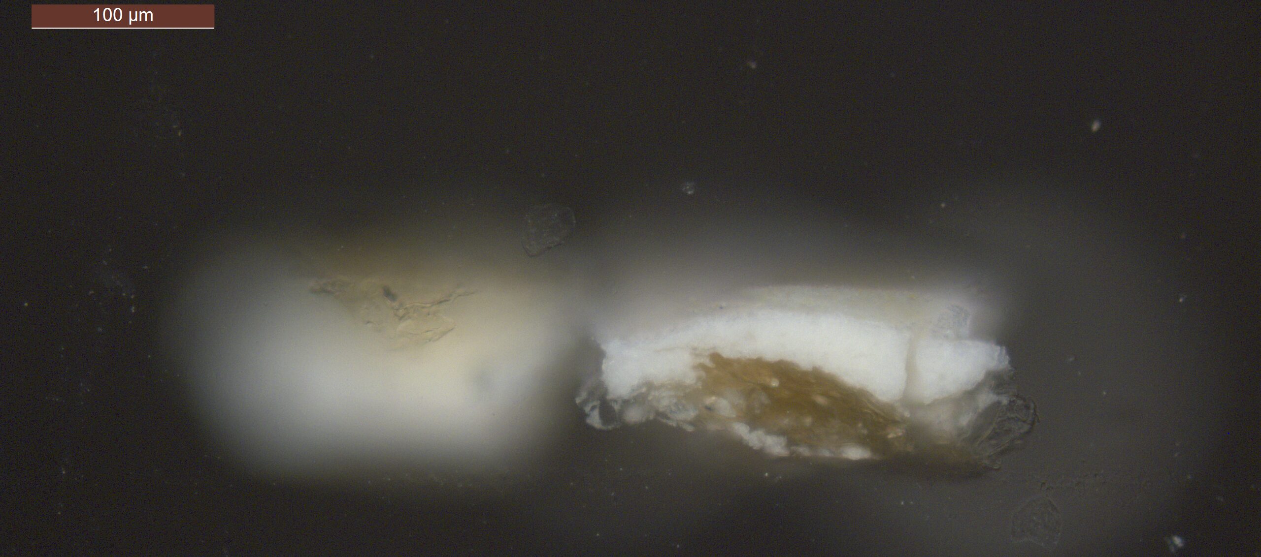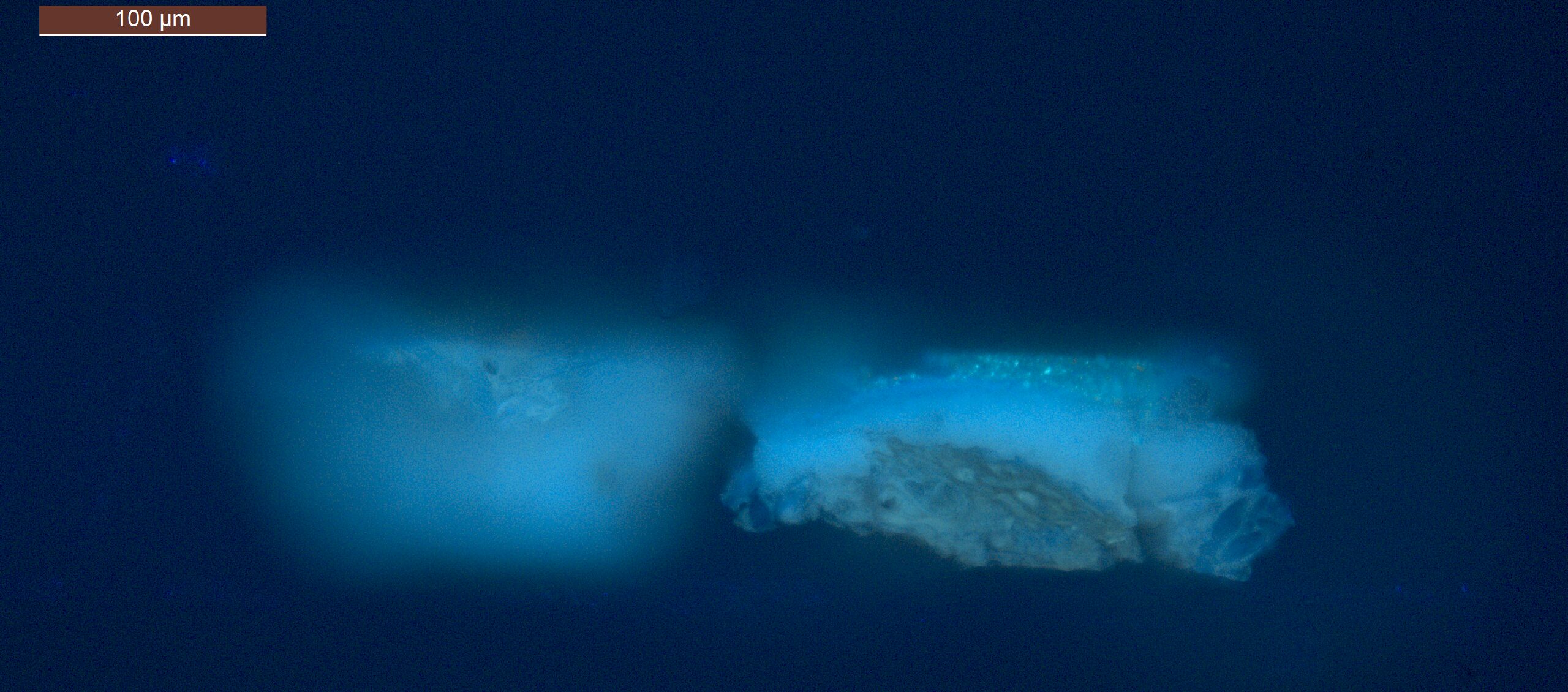 Optical microscopy uses visible light and lenses to magnify and examine the surface and structure of a painting. When applied to cross sections of paint samples, it allows for detailed observation of a painting’s stratigraphy (layer structure) and pigment particles. It is often employed with various illumination techniques, such as dark field and UV fluorescence, to enhance the analysis. Layer number 1 in the results section below the images refers to the layer at the bottom of the cross section.