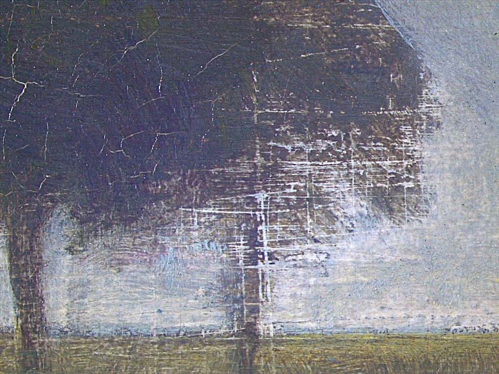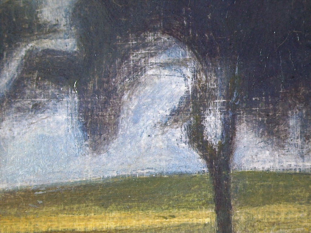 A black linear underdrawing is visible sometimes thin and sometimes a bit thicker jumping over the structure of the ground and is visible in the horisontal lines from left to right where the water meets the green rushes and it is difining the narrow strip of the road as well. It is also visible in the tree tops locally. The waves of the lake have an underdrawing throughout visible through the thin upper layers of paint, where traces of the black has also been picked up and mixed with the paint.