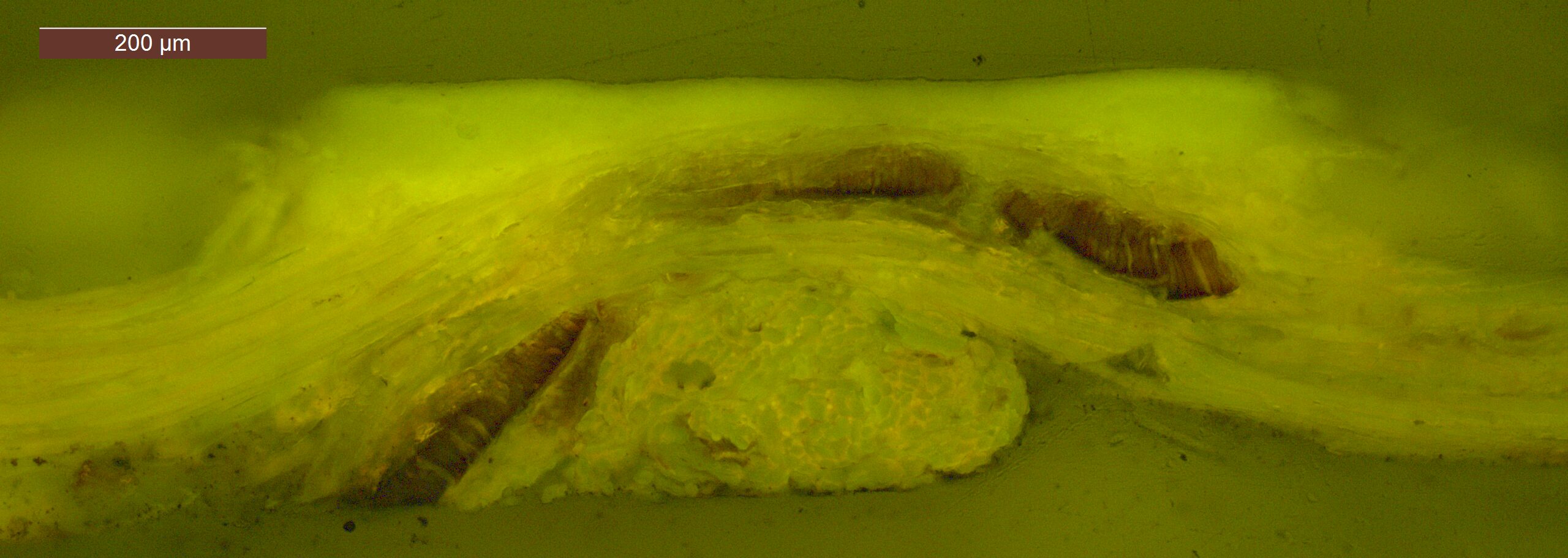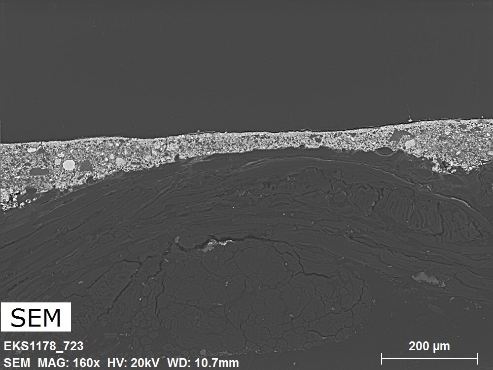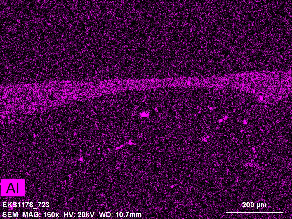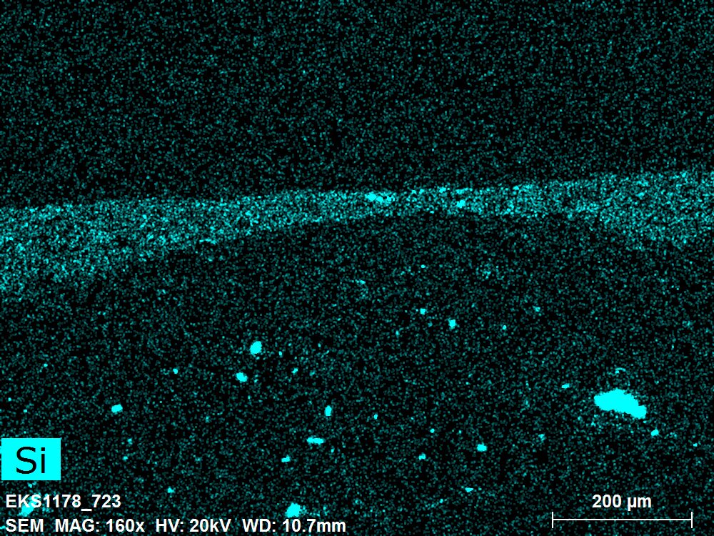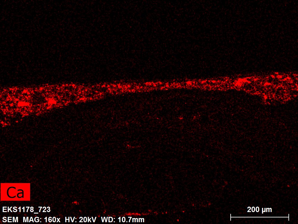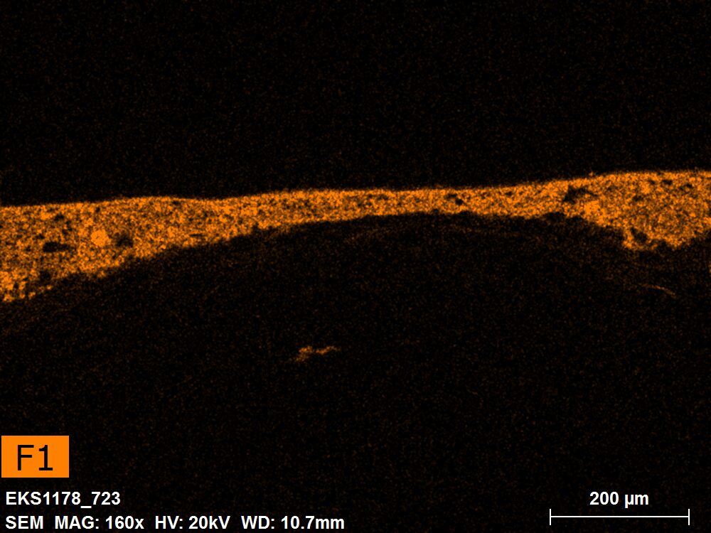 SEM-EDXS is a technique that provides highly detailed images at the microscopic level while simultaneously identifying the elemental composition of a sample. It is particularly valuable for studying the stratigraphy of paint cross sections at very fine scales, for the chemical characterisation of pigments, fillers and degradation products, and for detecting trace elements that may indicate very specific materials. Below, the elements listed in parentheses refer to minor elements whose relative abundance is below 10% of the total signal. The F1 map below represents the Pb M line. Read more under SEM-EDXS in the glossary.