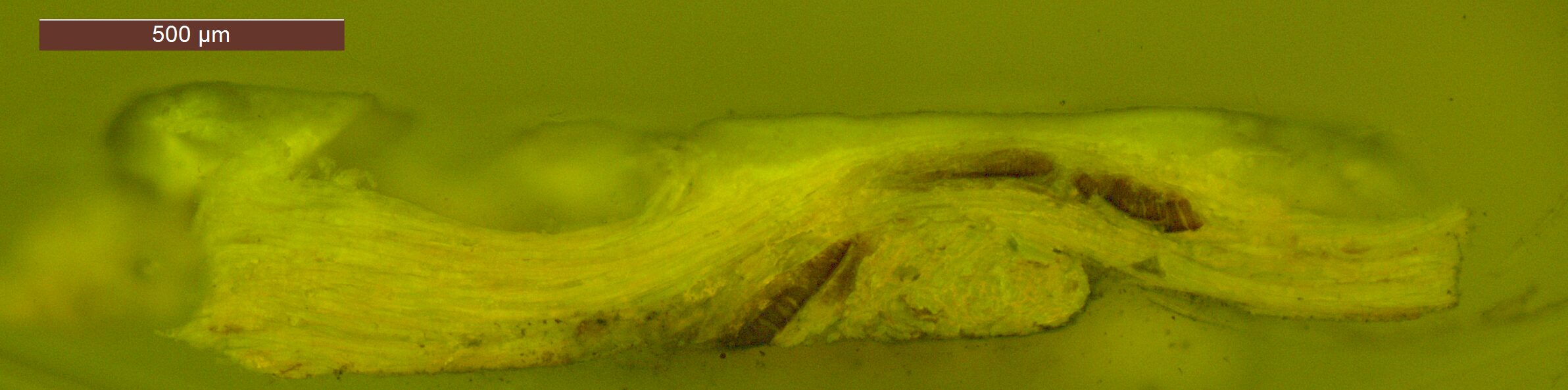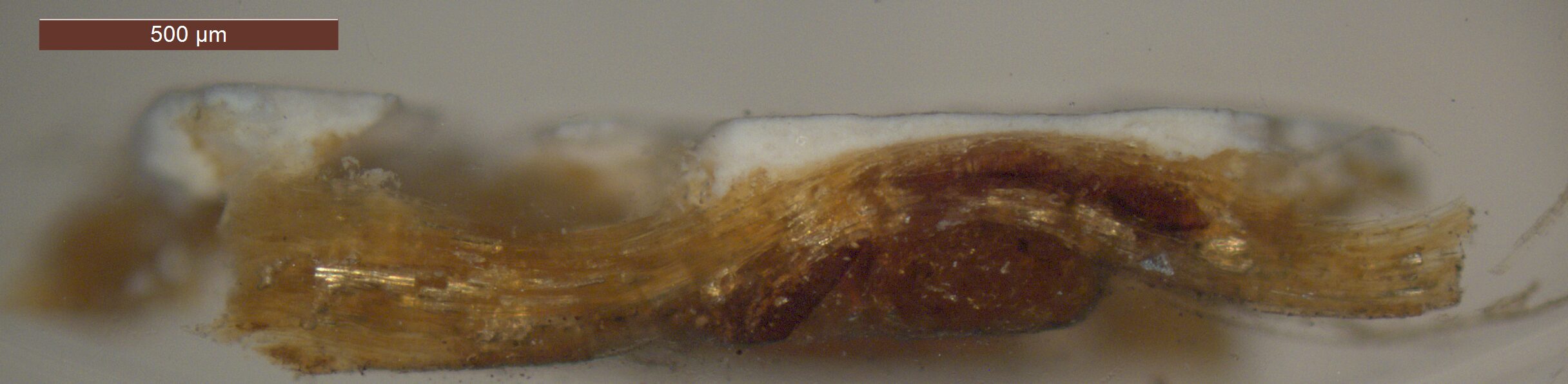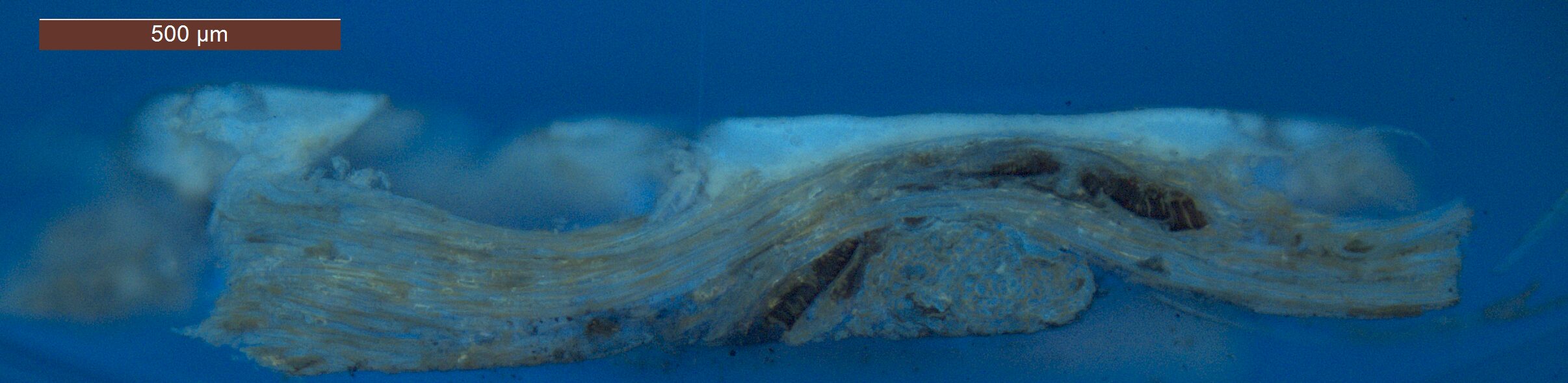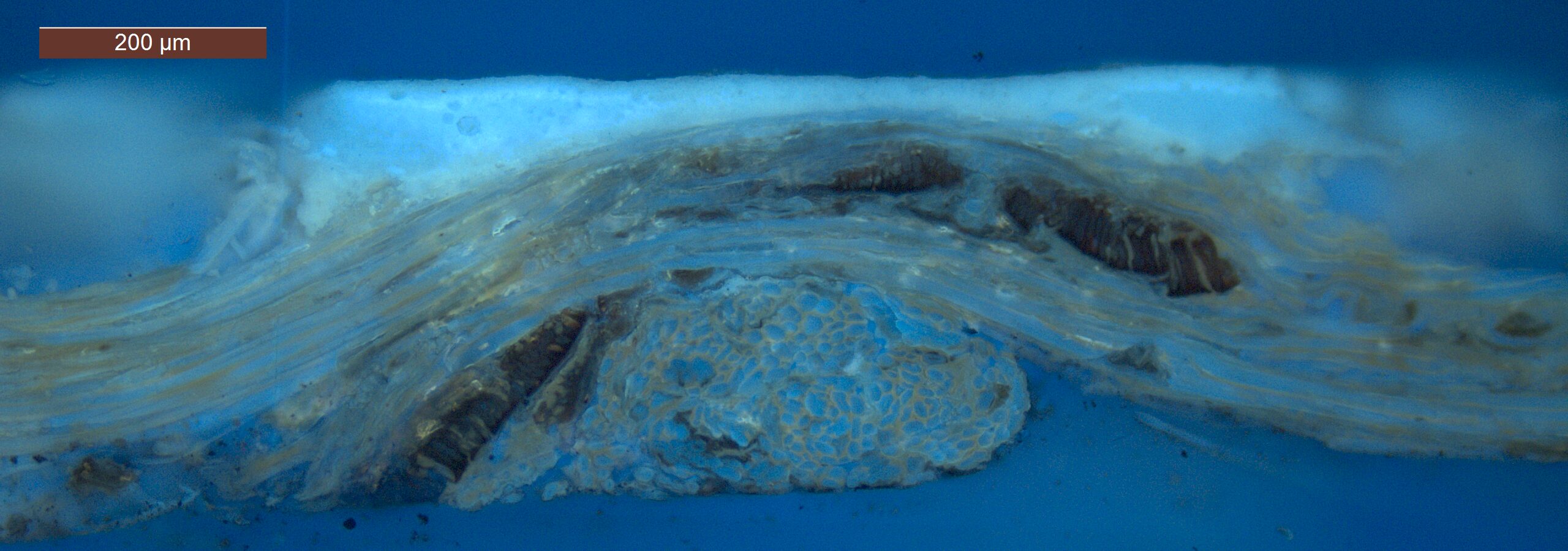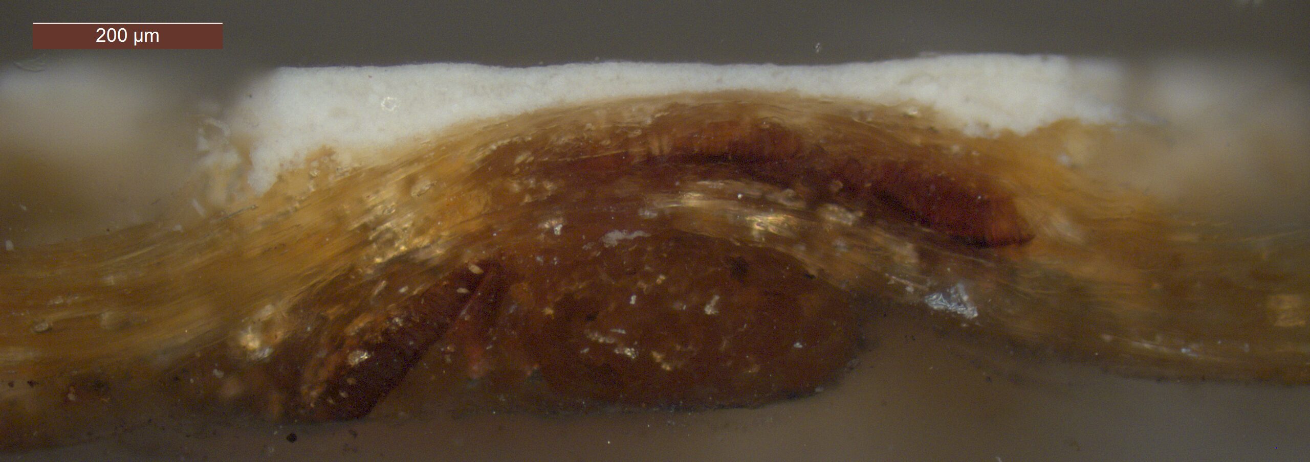 Optical microscopy uses visible light and lenses to magnify and examine the surface and structure of a painting. When applied to cross sections of paint samples, it allows for detailed observation of a painting’s stratigraphy (layer structure) and pigment particles. It is often employed with various illumination techniques, such as dark field and UV fluorescence, to enhance the analysis. Layer number 1 in the results section below the images refers to the layer at the bottom of the cross section.