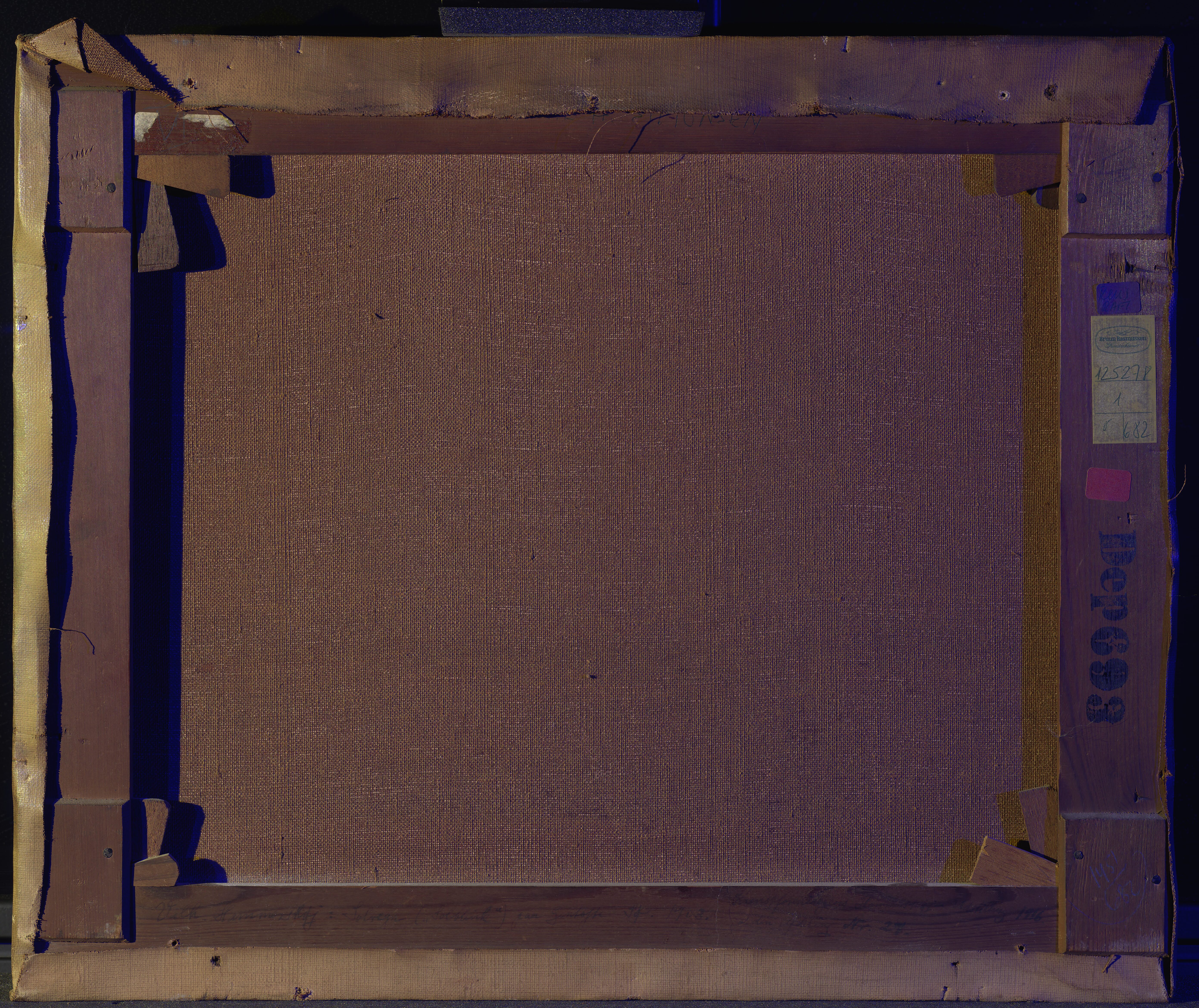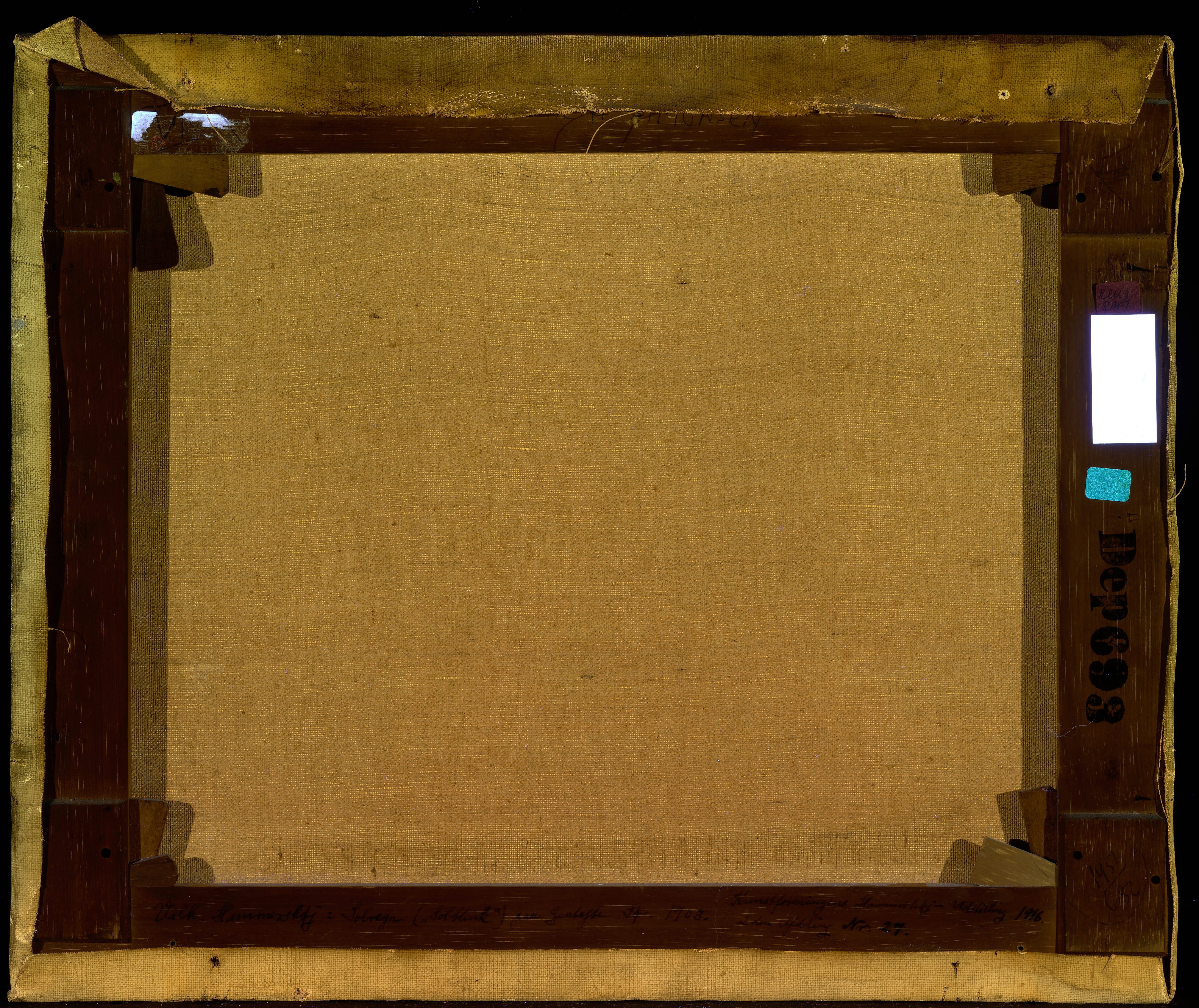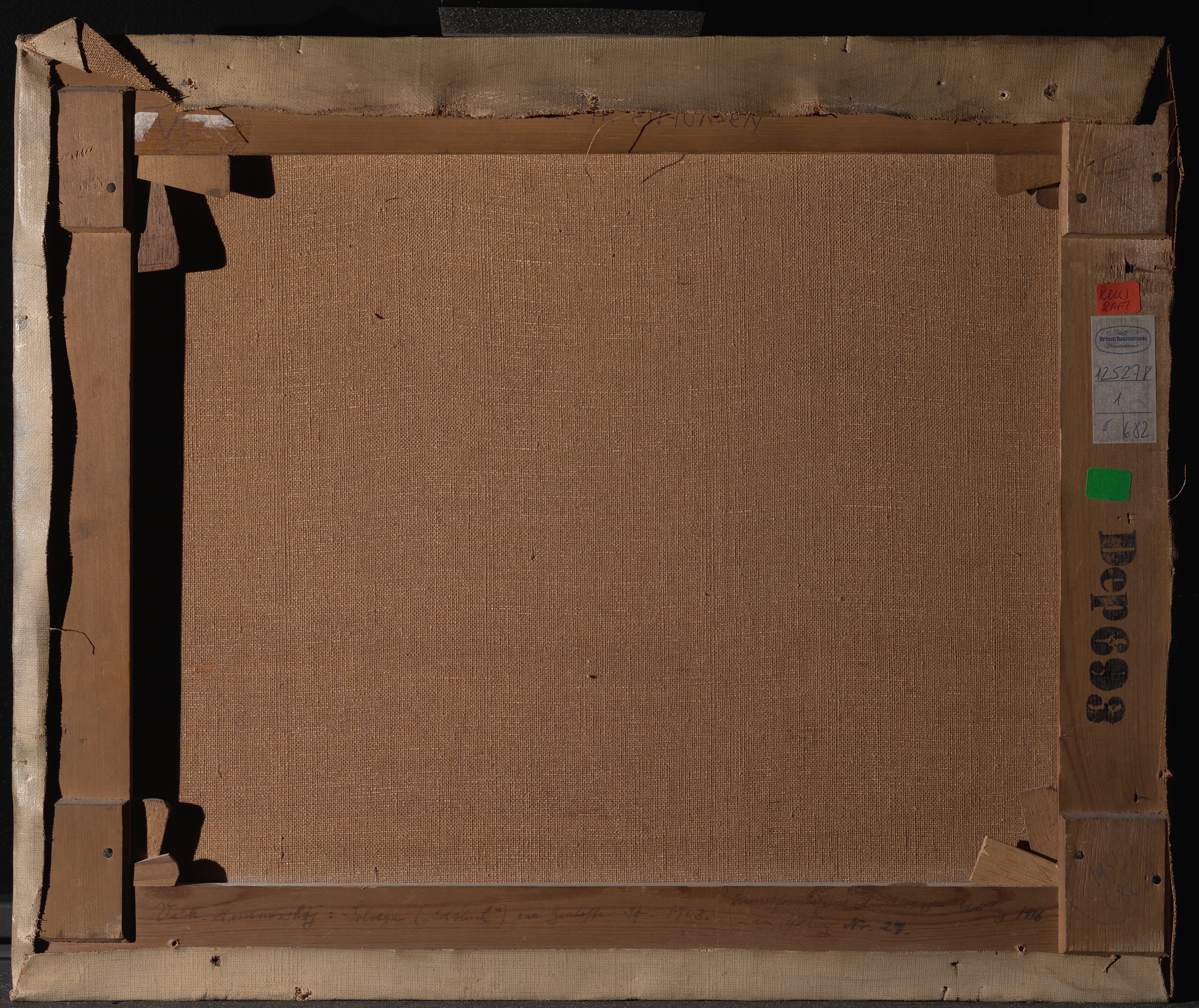The size of the stretcher matches the standard size ‘Figure, No. 8’ (rotated 90 degrees) in the catalogue ranges from Lefranc & Cie c. 1863 and Bourgeois aîné, 1888. However, in the catalogue 1893 from Kultorvets Farvehandel where the stretcher was purchased (judging by the supplier’s stamp) the size is listed as no. 13. On top bar an Inscription in blue ballpoint reads: 'Birgitte H. Simonesen'. On the bottom bar, an inscription in brown ink reads: 'Vilh. Hammershøi: ("Solblink") paa Gentofte Sø. 1903. Kunstforeningens Hammershøi -Udstilling 1916. 2den Afdeling. Nr. 27'. On the bottom righ-hand corner is, in pencil (encircled): '1451/680'.