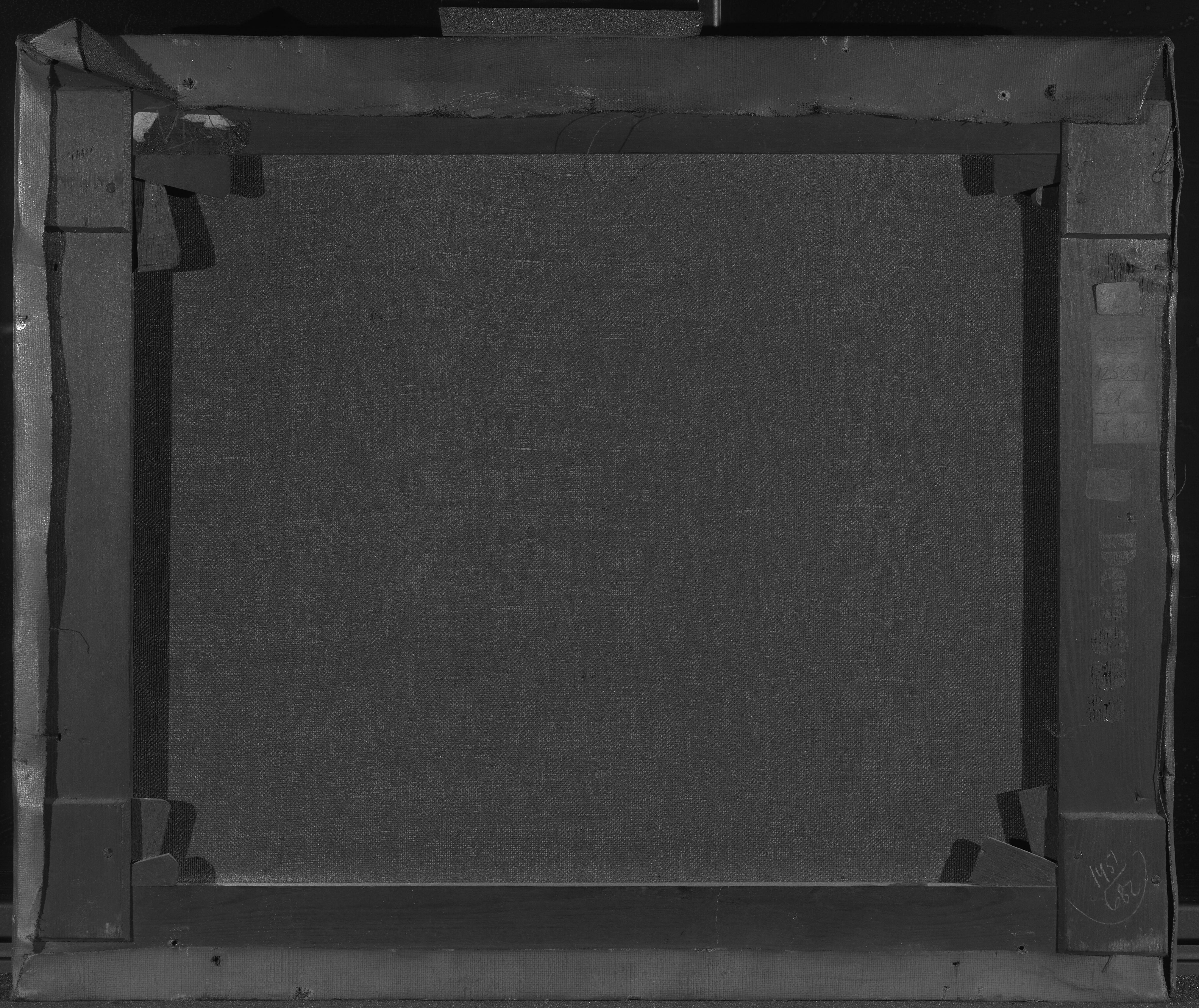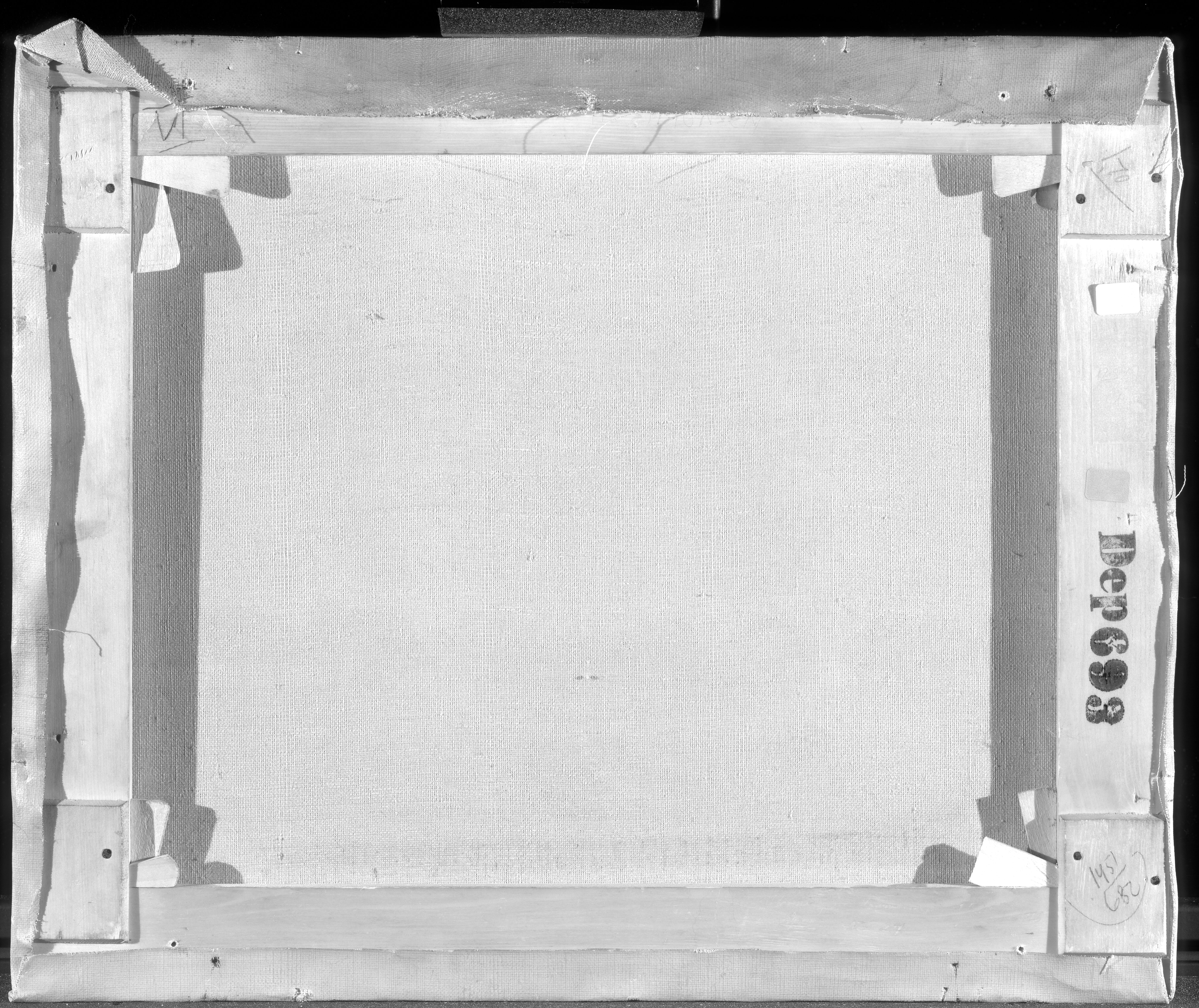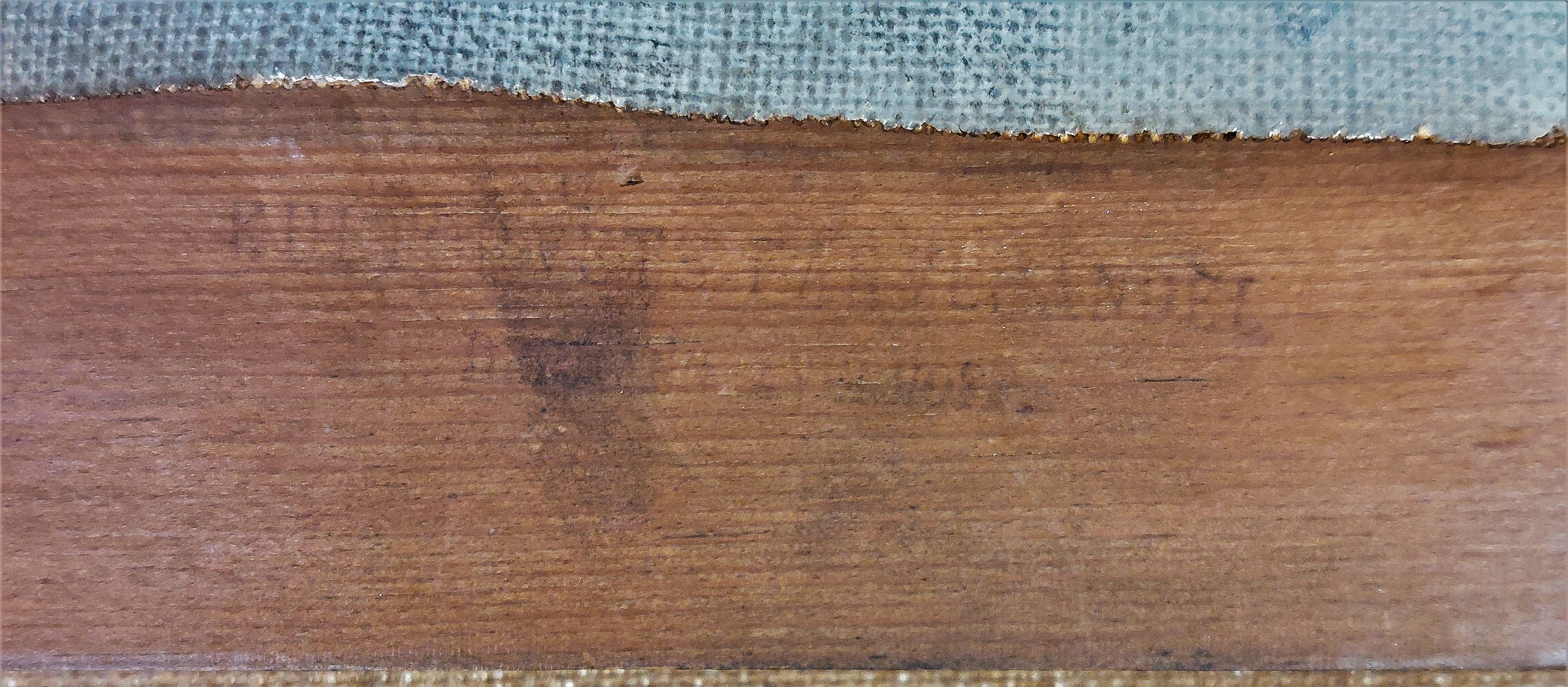 The size of the stretcher matches the standard size ‘Figure, No. 8’ (rotated 90 degrees) in the catalogue ranges from Lefranc & Cie c. 1863 and Bourgeois aîné, 1888. However, in the catalogue 1893 from Kultorvets Farvehandel where the stretcher was purchased (judging by the supplier’s stamp) the size is listed as no. 13. On top bar an Inscription in blue ballpoint reads: 'Birgitte H. Simonesen'. On the bottom bar, an inscription in brown ink reads: 'Vilh. Hammershøi: ("Solblink") paa Gentofte Sø. 1903. Kunstforeningens Hammershøi -Udstilling 1916. 2den Afdeling. Nr. 27'. On the bottom righ-hand corner is, in pencil (encircled): '1451/680'.
