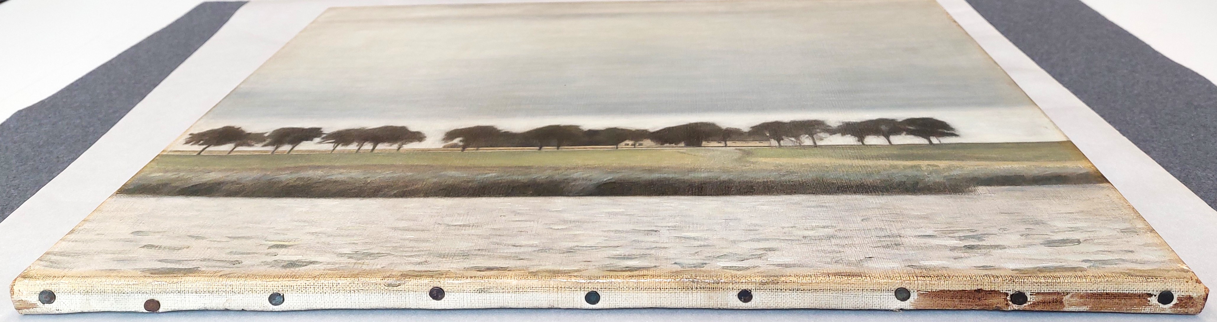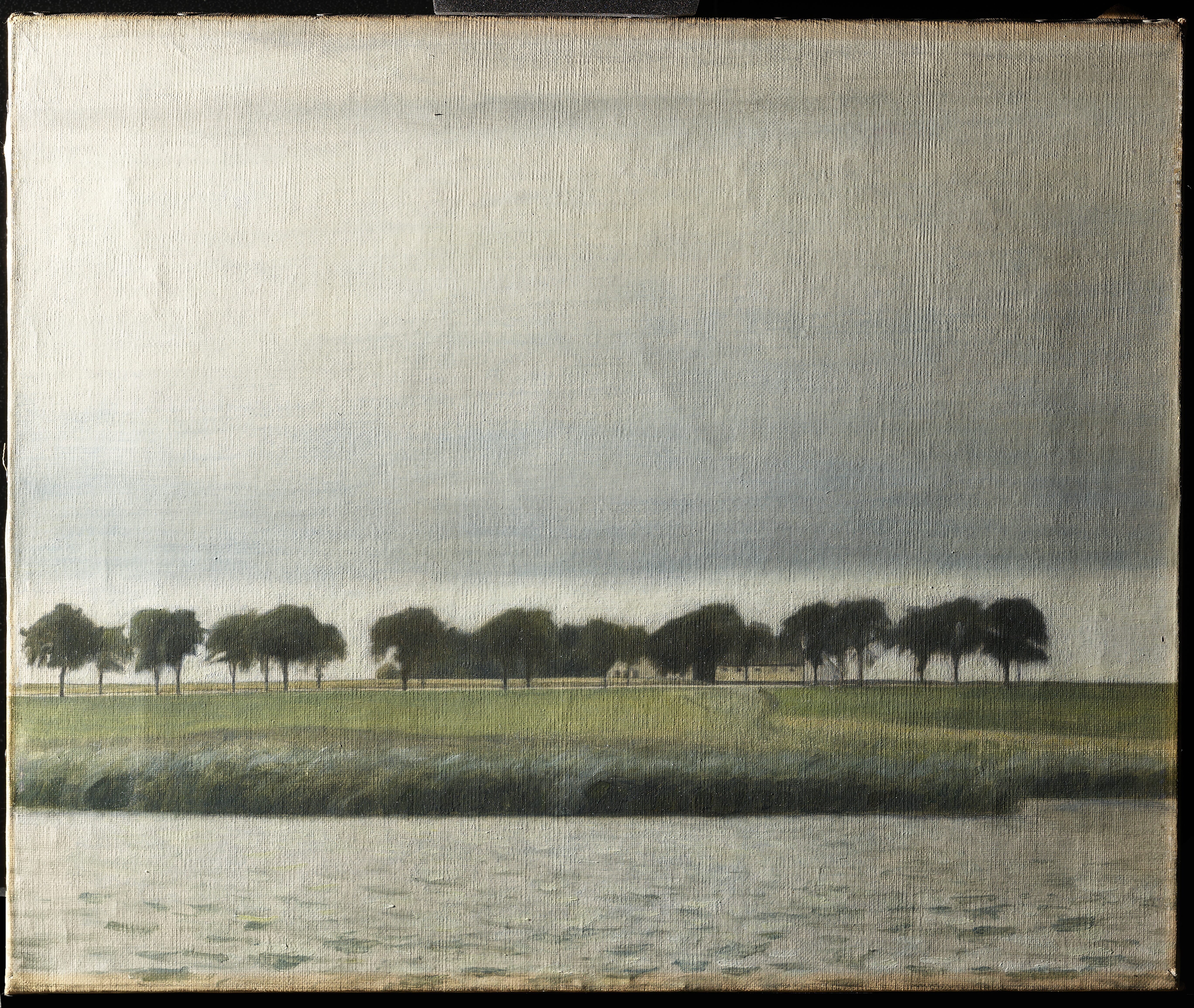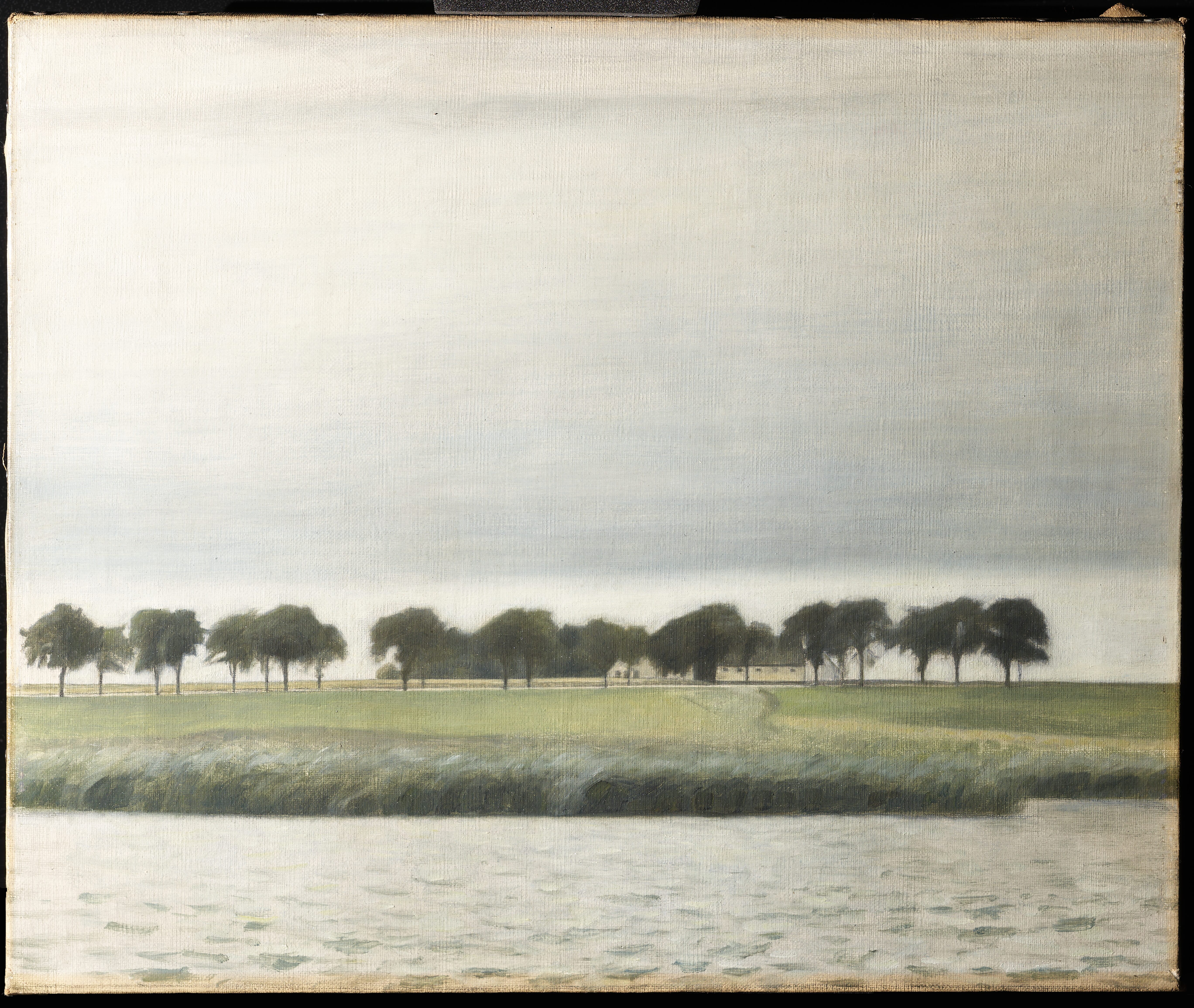 The predominant direction of the rather long brush strokes in the sky and the ground is horizontal, with shorter horizontal brushstrokes distinctive of the water. The brushwork is more differentiated in the trees and the rushes, guided by the individual shapes of the details in these areas.