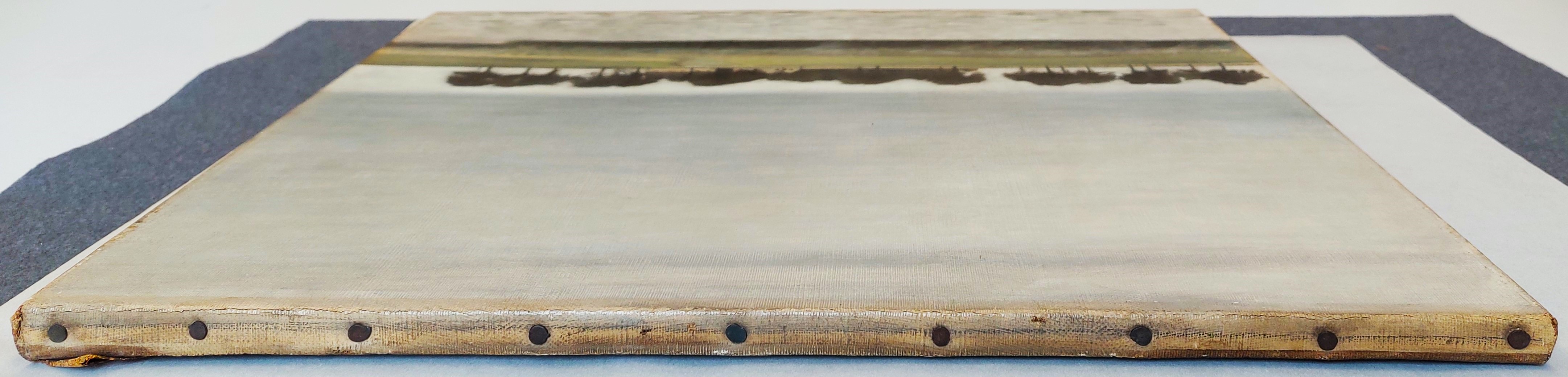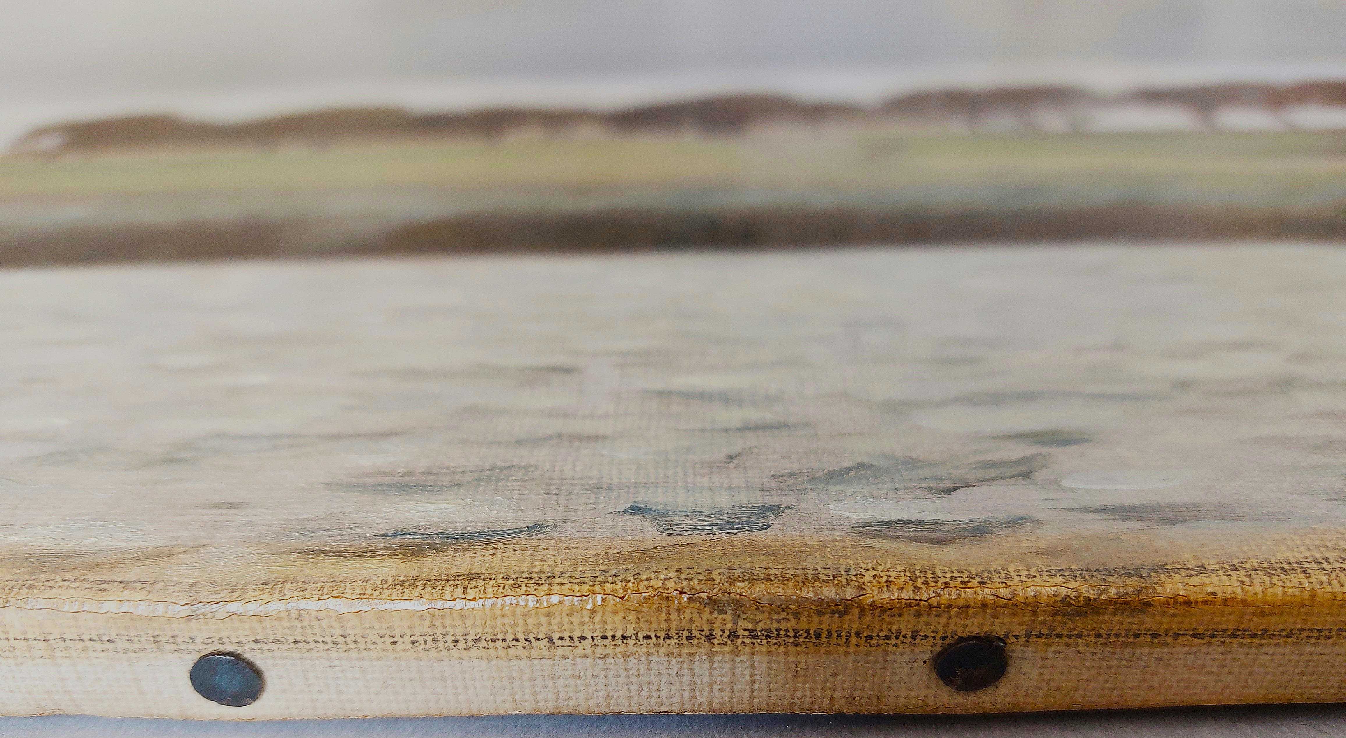 The paint was applied with an open brushwork locally, leaving the ground and underpaint perceptible in several areas of the water, the rushes, and the distant road.