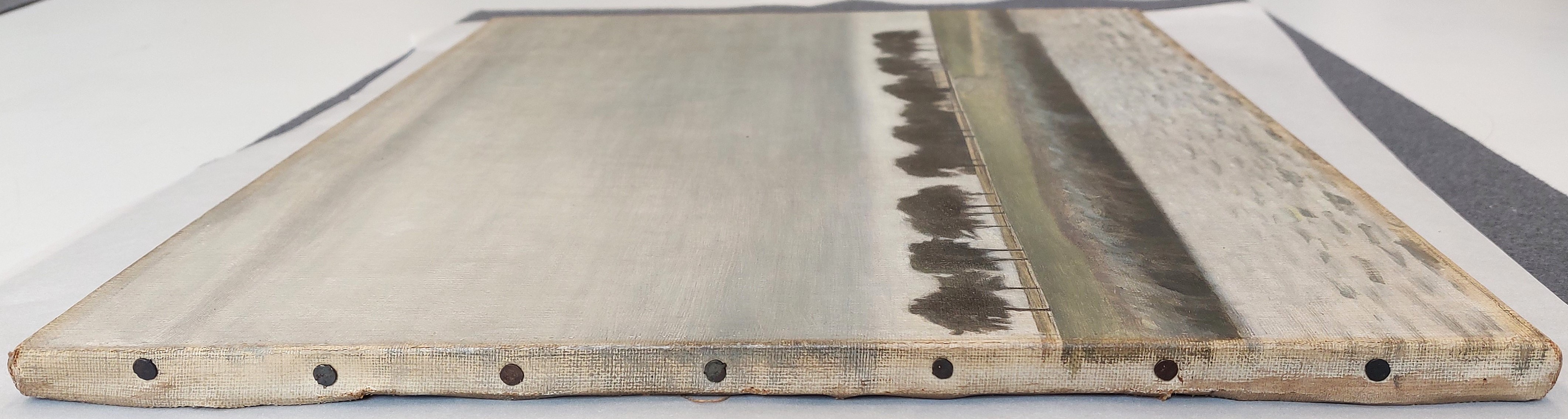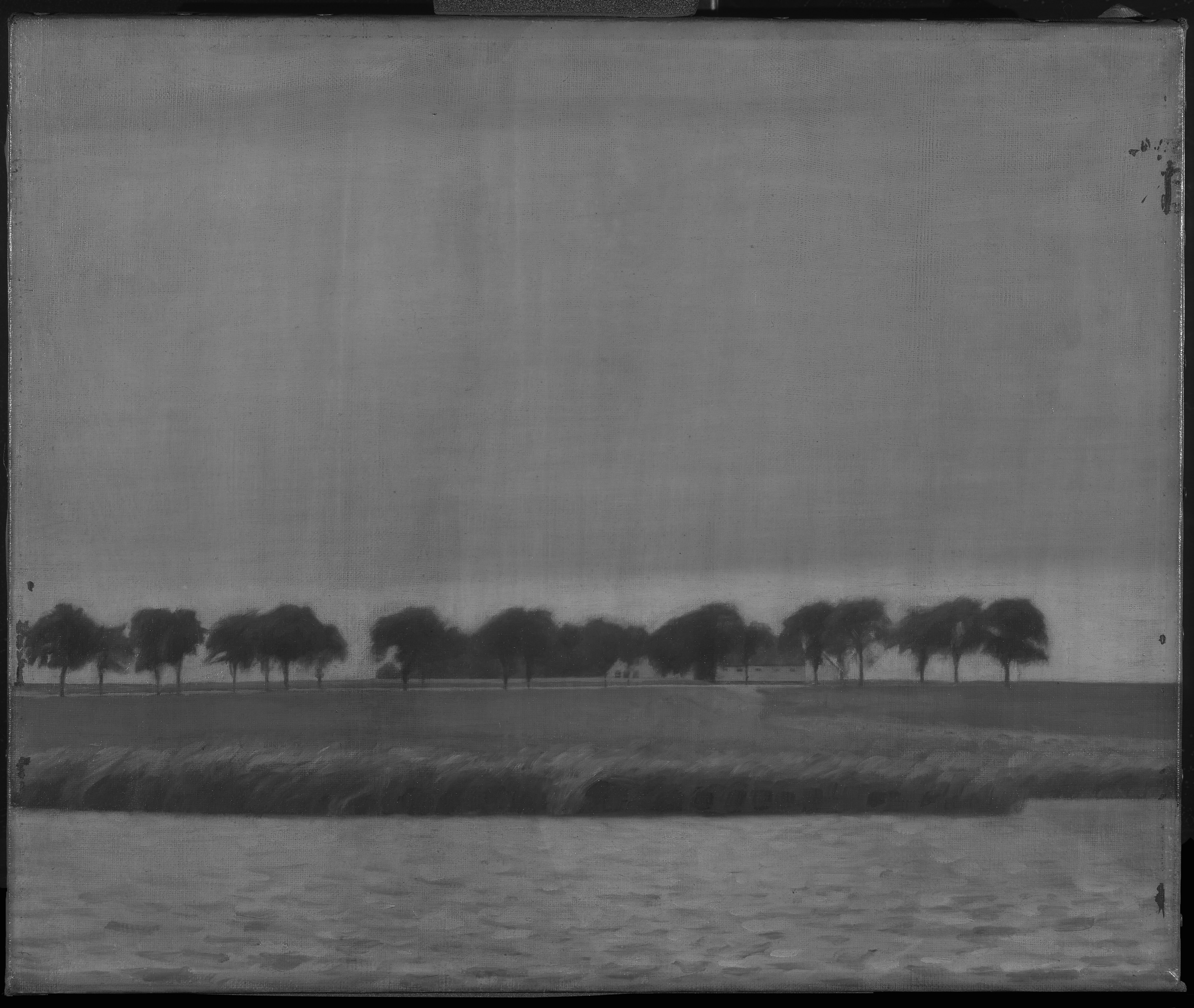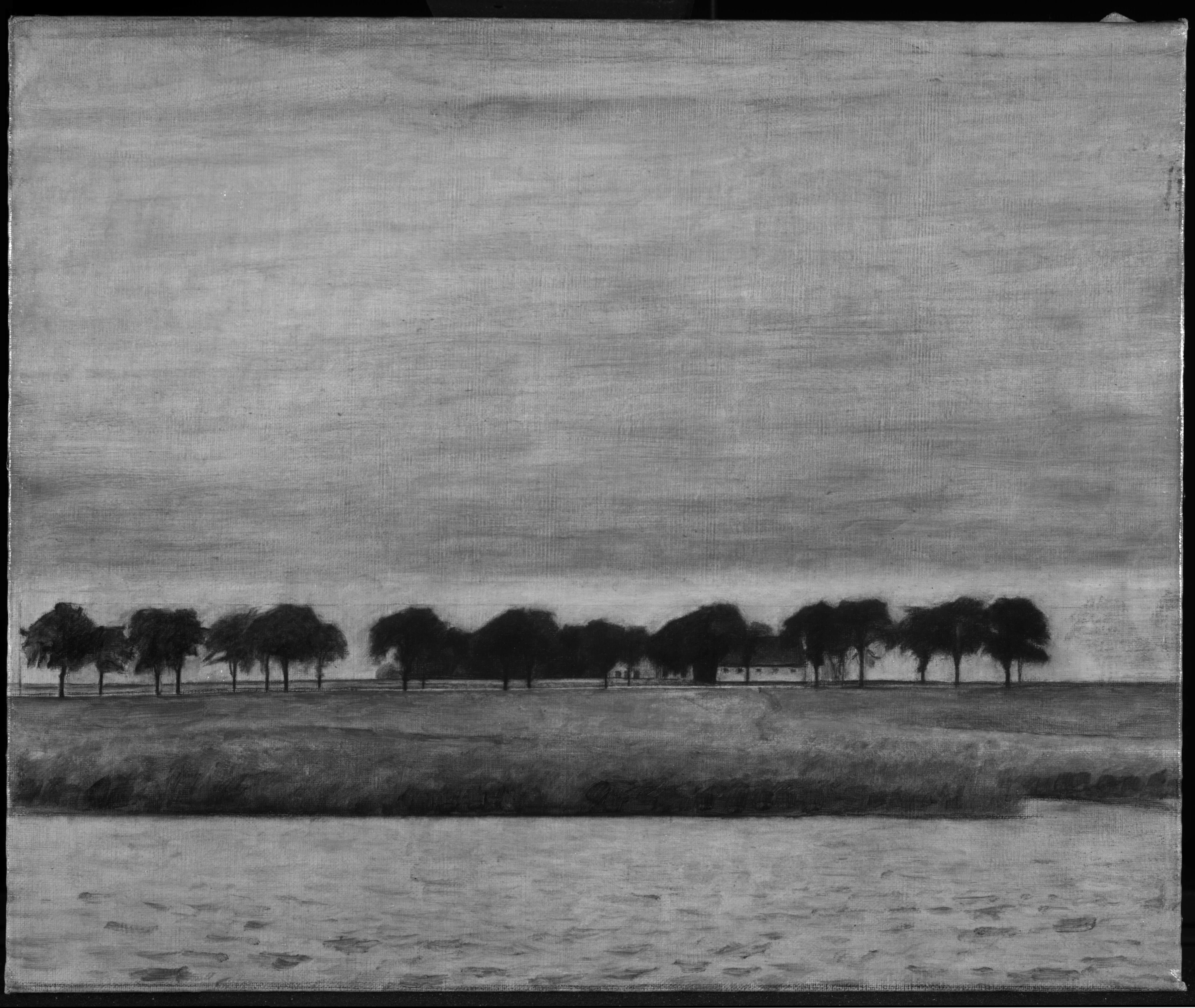 A black line in pencil or crayon, demarcating the composition, is found on the tacking edges. Horizontal lines are marking the landscape, the road, and the base of the rushes. In addition, a horizontal line runs along the treetops from side to side. Outlines in the farmhouse and the trunks and branches of the individual trees are also underdrawn.