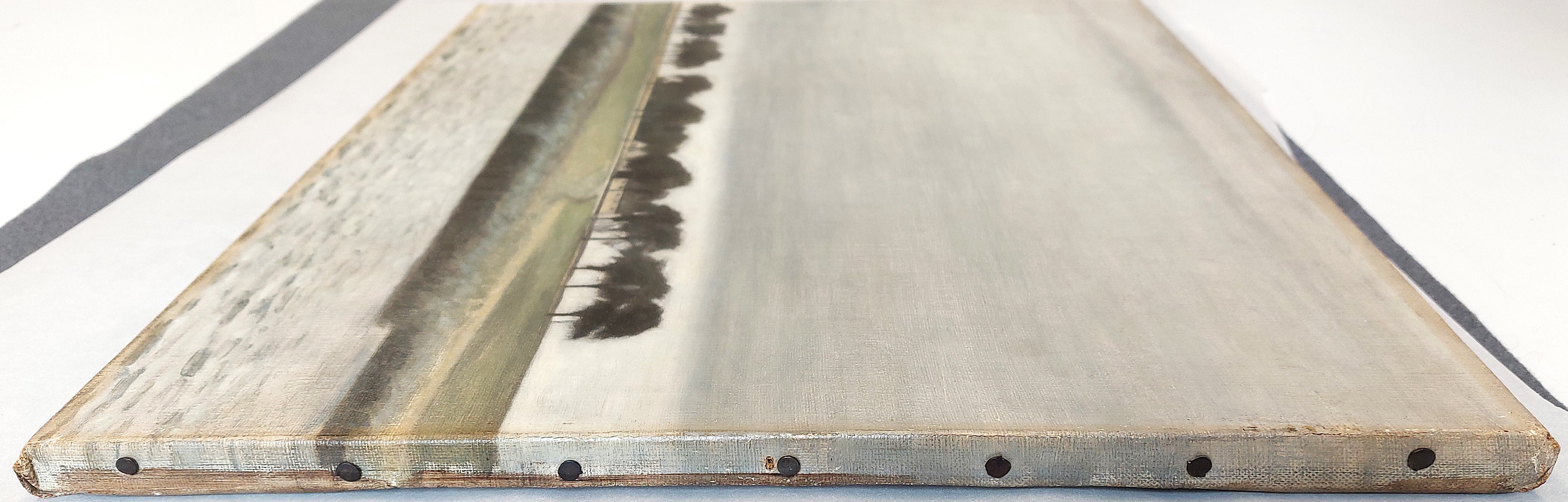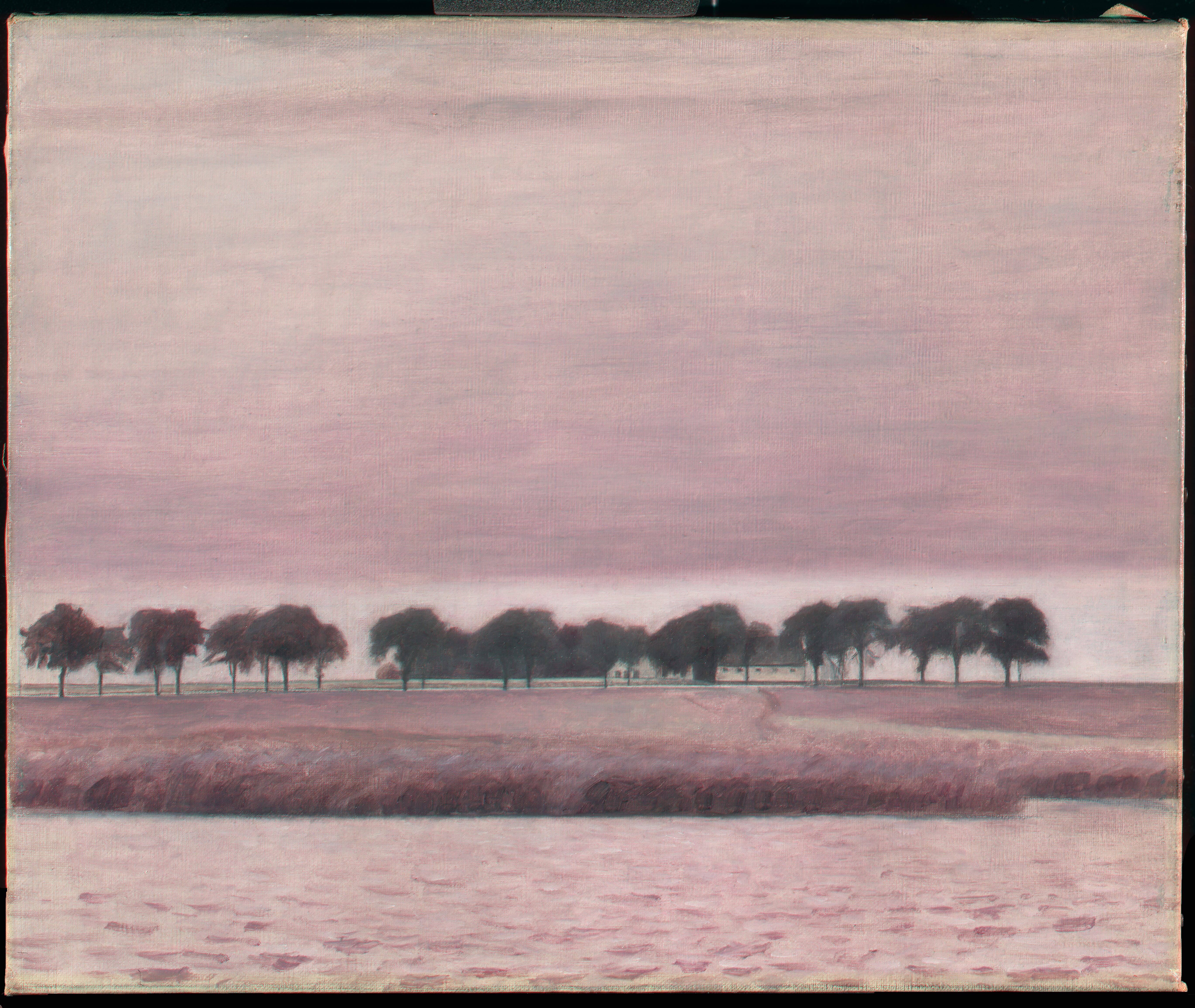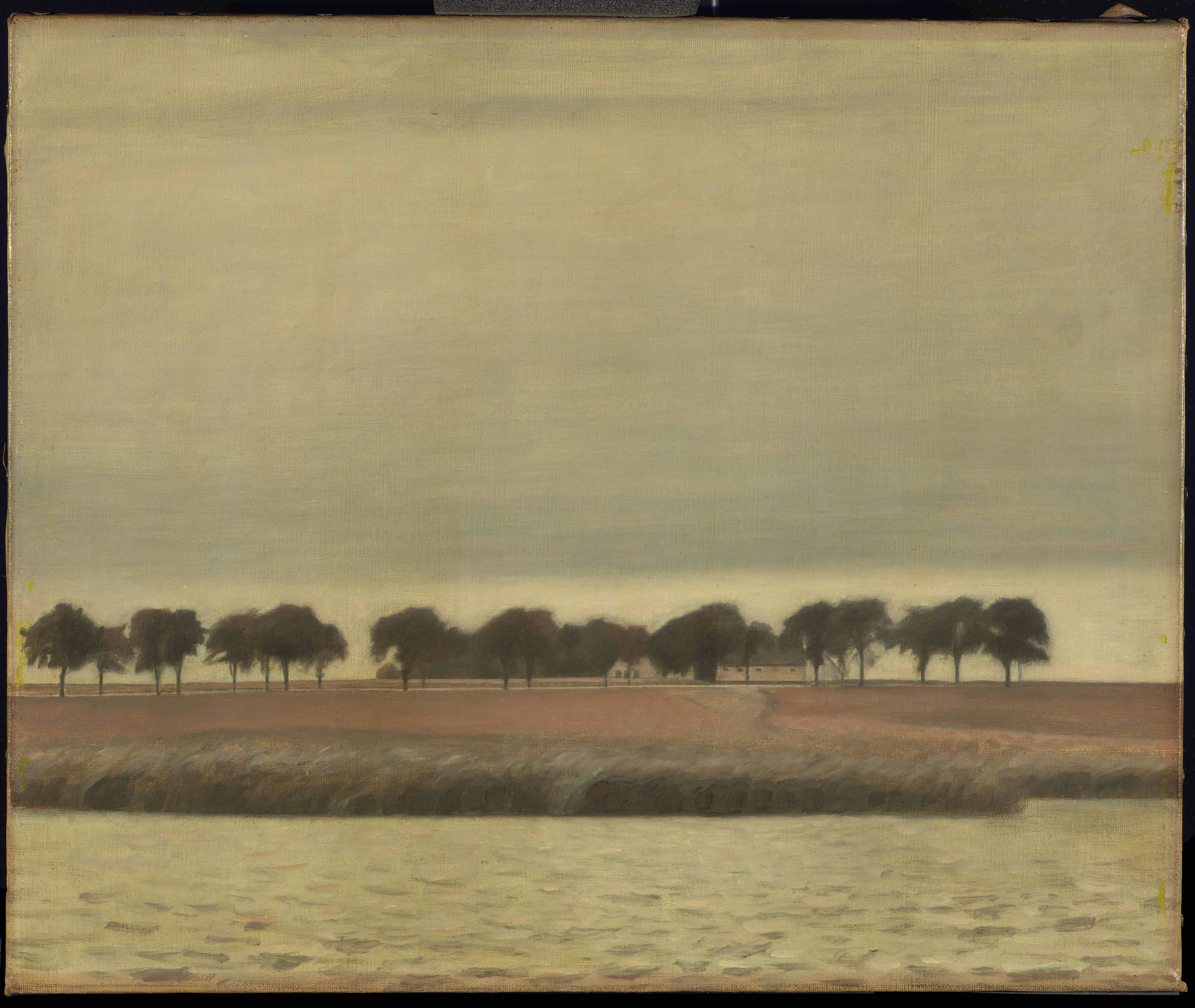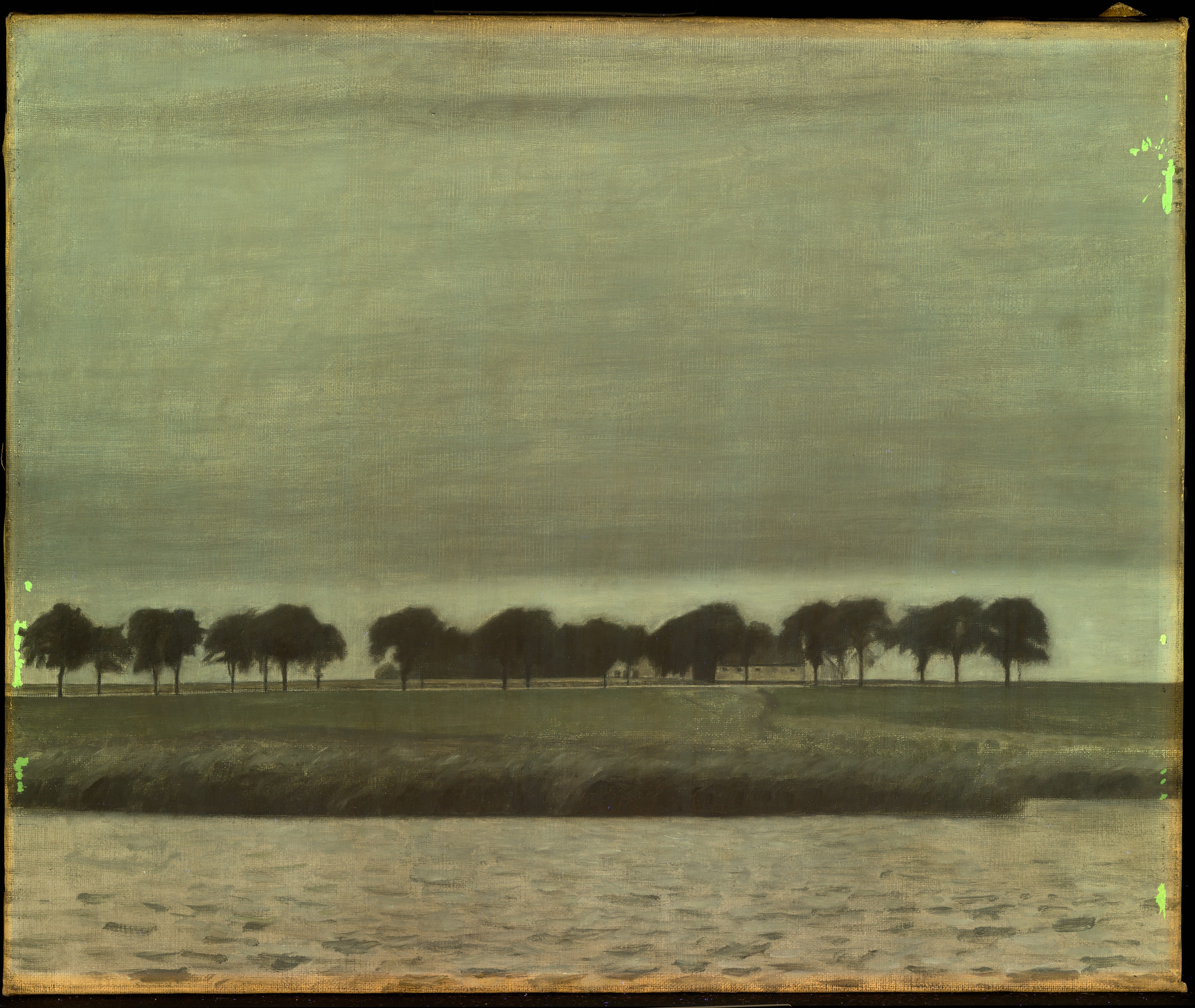 A black line in pencil or crayon, demarcating the composition, is found on the tacking edges. Horizontal lines are marking the landscape, the road, and the base of the rushes. In addition, a horizontal line runs along the treetops from side to side. Outlines in the farmhouse and the trunks and branches of the individual trees are also underdrawn.