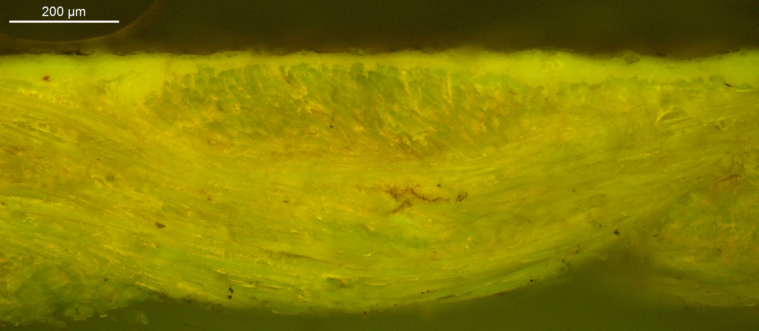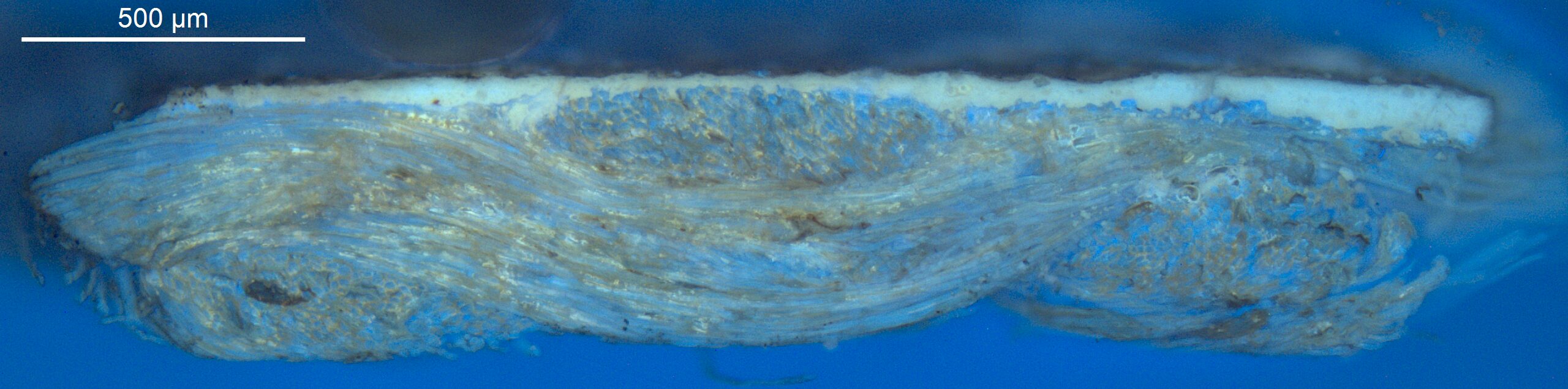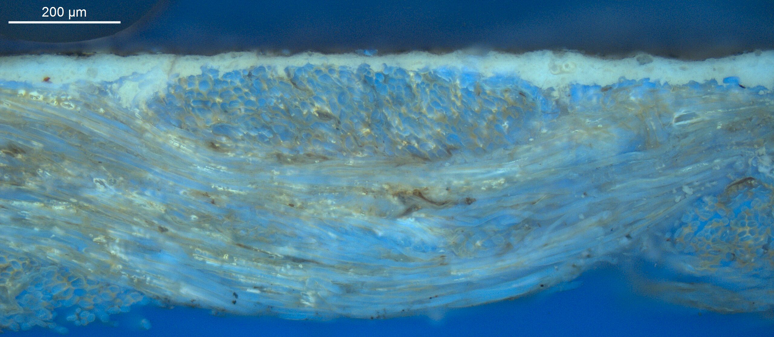 A transparant dark yellow layer with an intense orange UV fluorescence is found on the bottom tacking edge. Could it be an insulating layer on top of the underdrawing, applied to avoid picking up the black pigment, or alternatively, a preparatory layer to improve the adherence of the paint to the saturated ground?