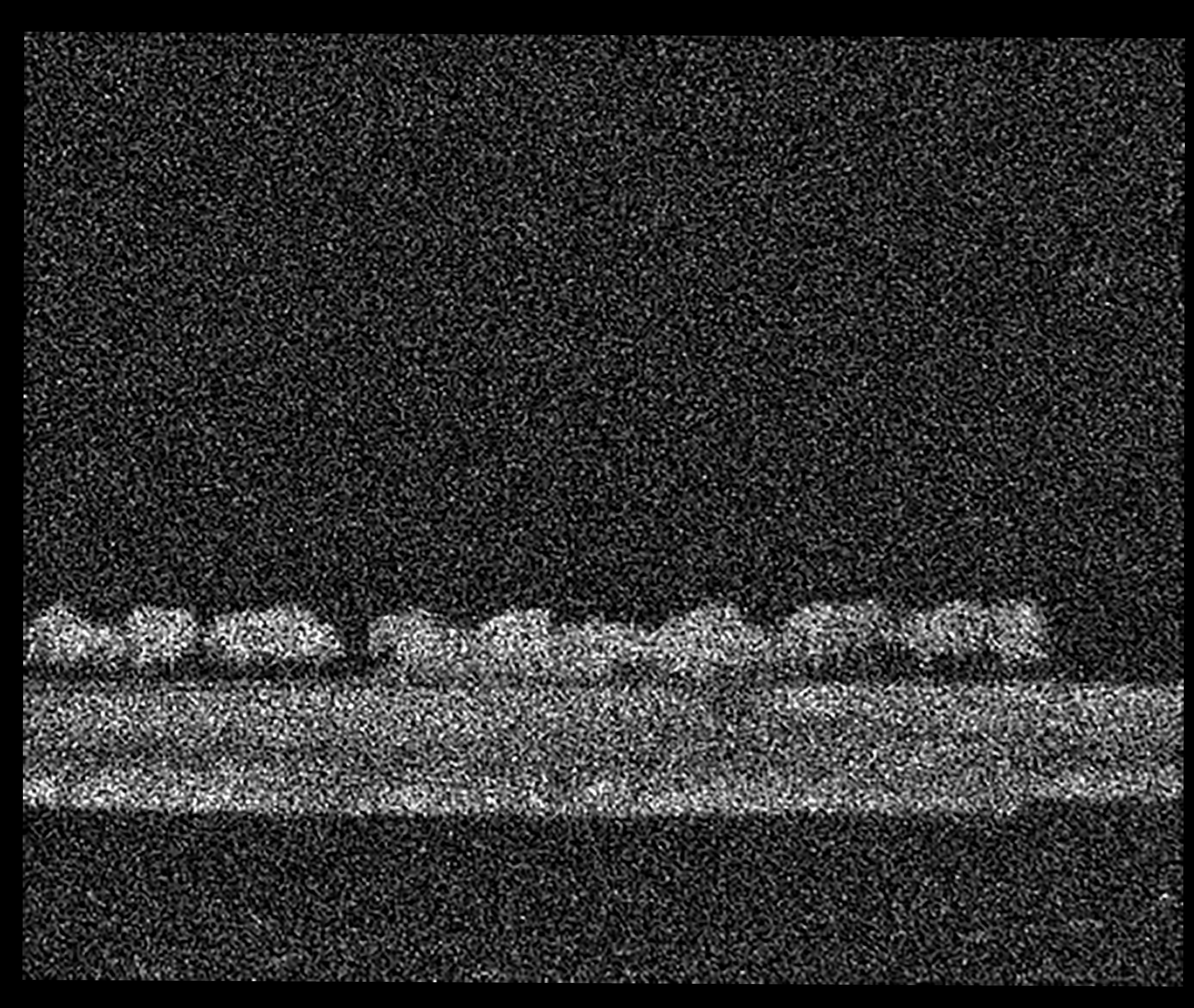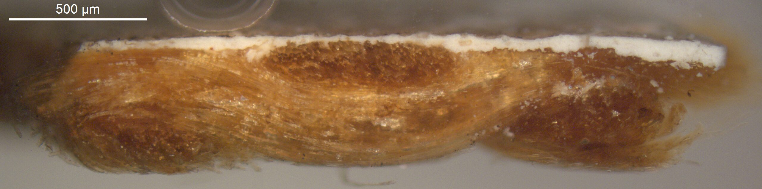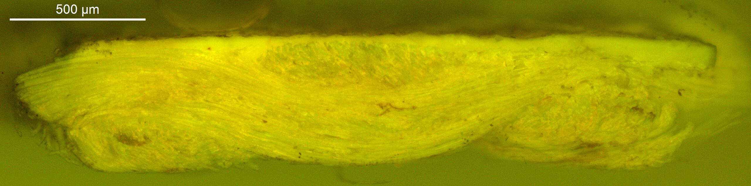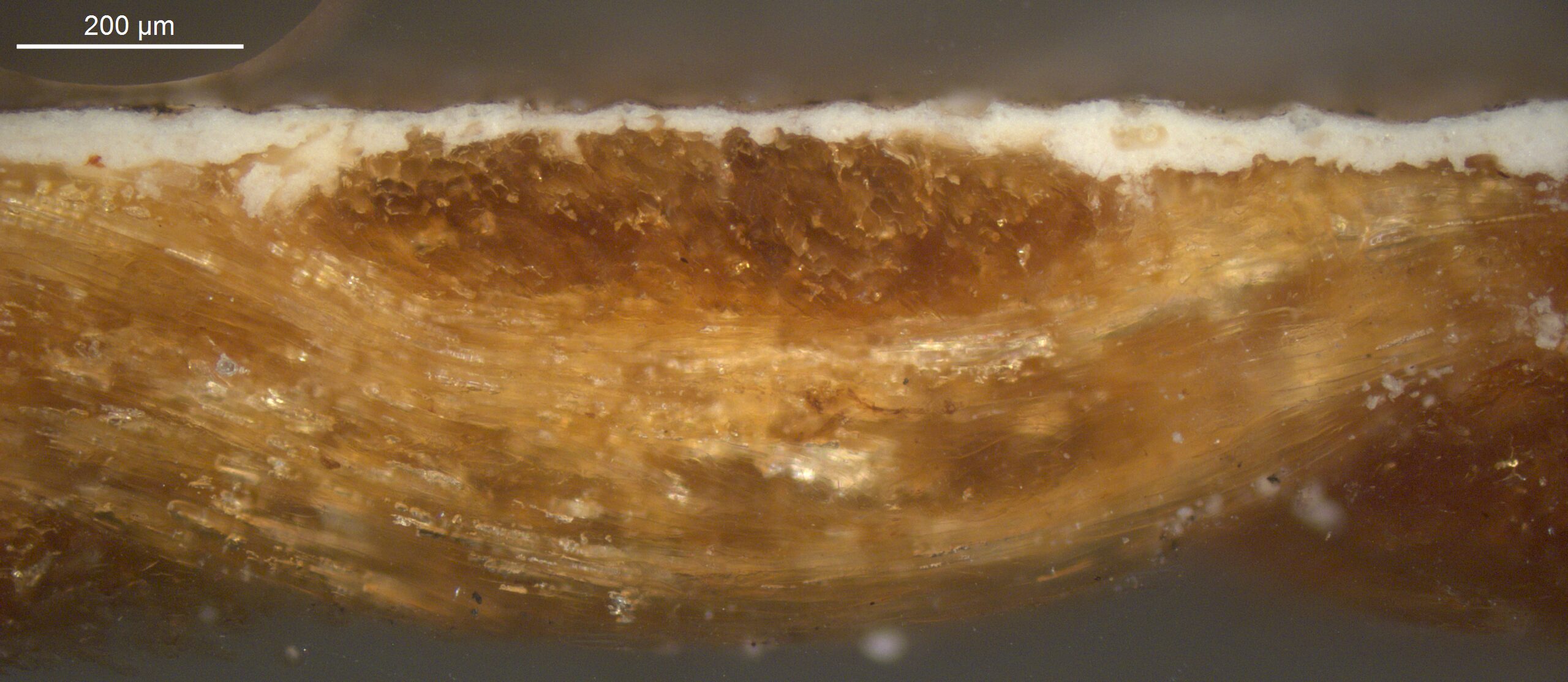 A transparant dark yellow layer with an intense orange UV fluorescence is found on the bottom tacking edge. Could it be an insulating layer on top of the underdrawing, applied to avoid picking up the black pigment, or alternatively, a preparatory layer to improve the adherence of the paint to the saturated ground?