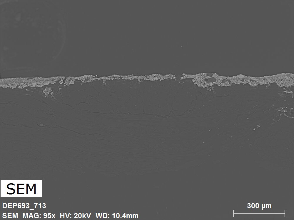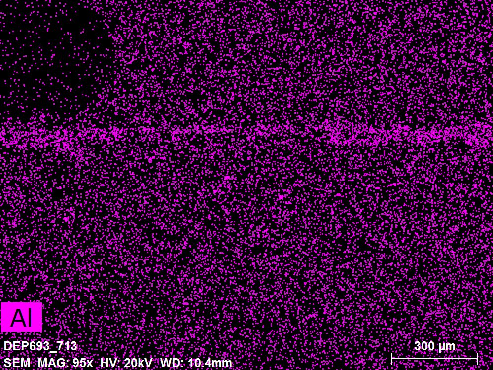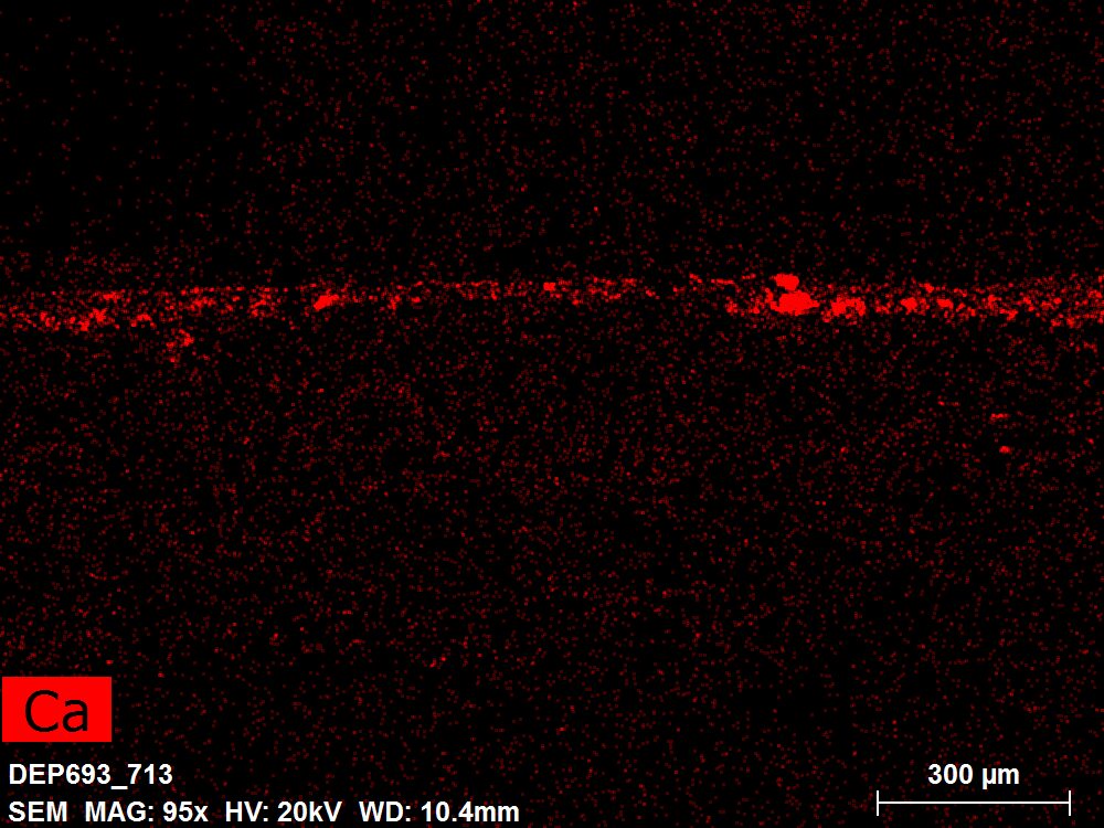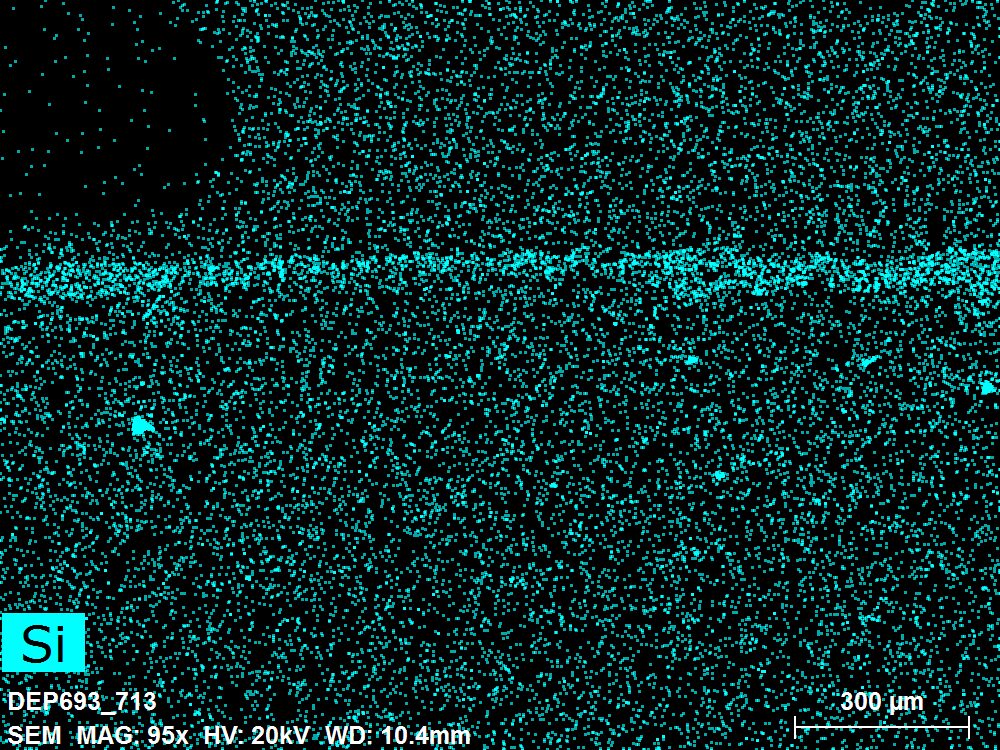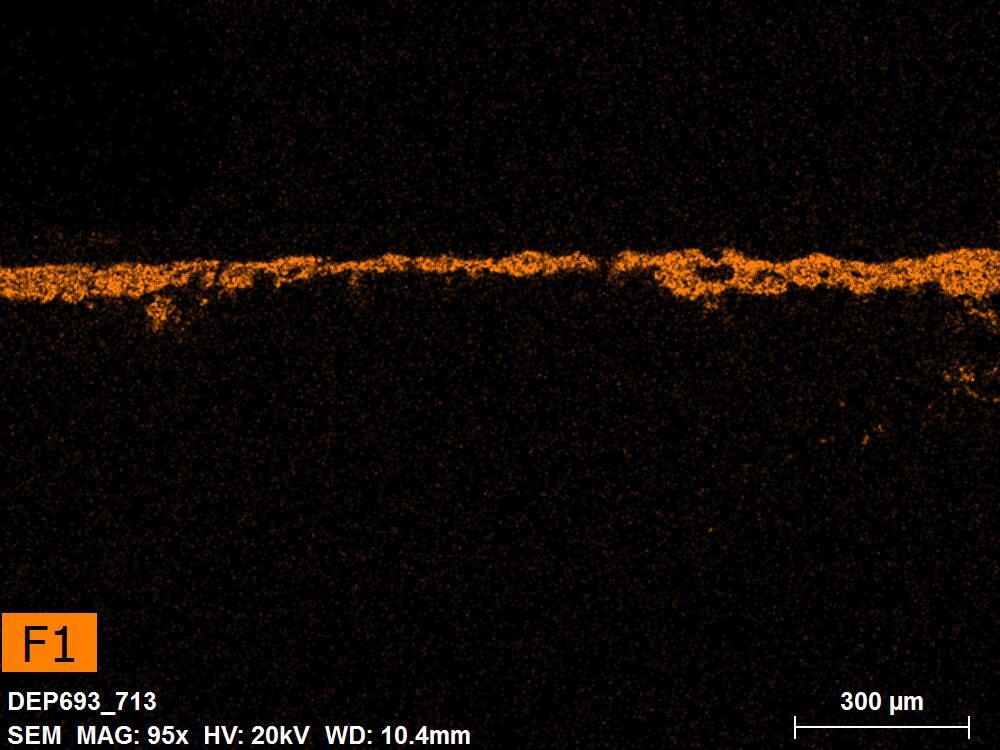 SEM-EDXS is a technique that provides highly detailed images at the microscopic level while simultaneously identifying the elemental composition of a sample. It is particularly valuable for studying the stratigraphy of paint cross sections at very fine scales, for the chemical characterisation of pigments, fillers and degradation products, and for detecting trace elements that may indicate very specific materials. Below, the elements listed in parentheses refer to minor elements whose relative abundance is below 10% of the total signal. The F1 map below represents the Pb M line. Read more under SEM-EDXS in the glossary.