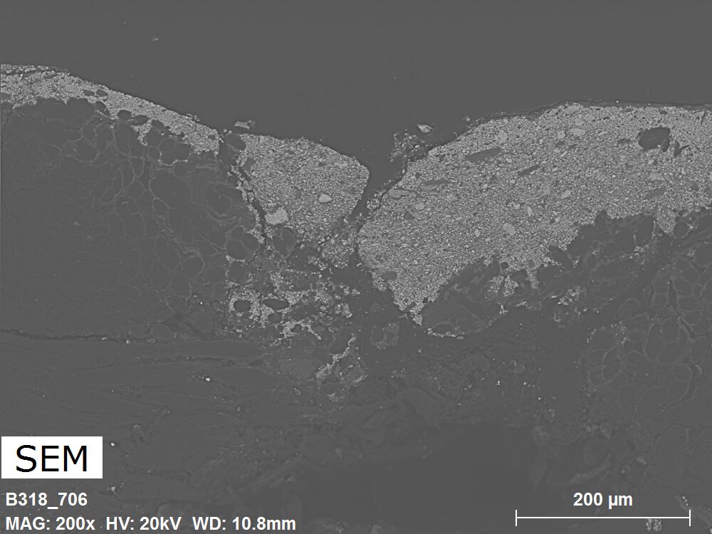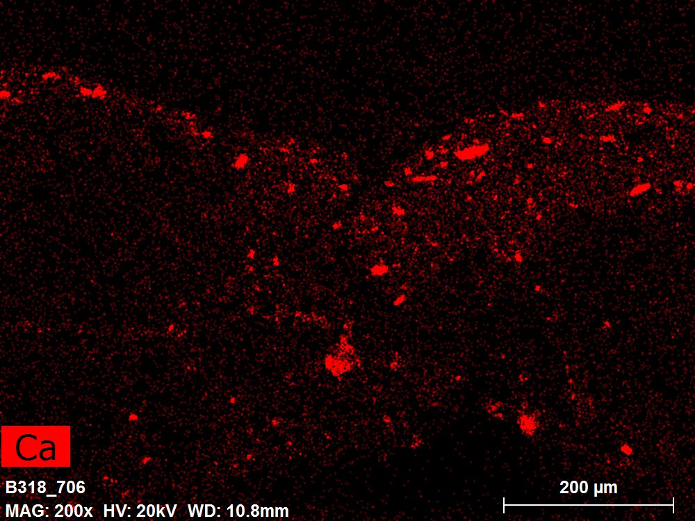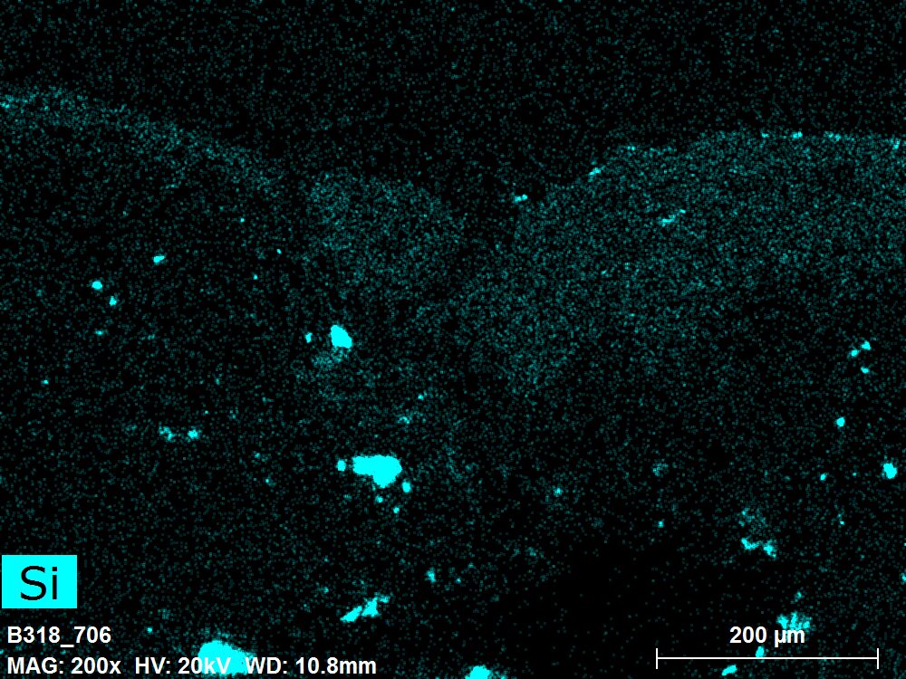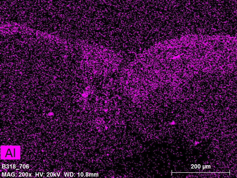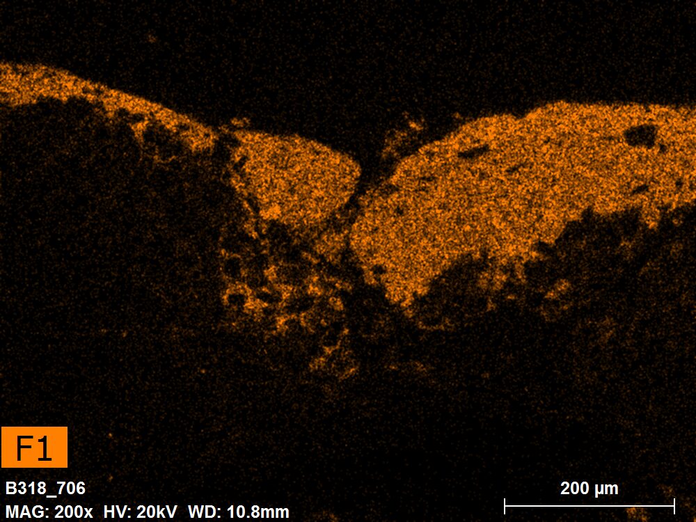 SEM-EDXS is a technique that provides highly detailed images at the microscopic level while simultaneously identifying the elemental composition of a sample. It is particularly valuable for studying the stratigraphy of paint cross sections at very fine scales, for the chemical characterisation of pigments, fillers and degradation products, and for detecting trace elements that may indicate very specific materials. Below, the elements listed in parentheses refer to minor elements whose relative abundance is below 10% of the total signal. The F1 map below represents the Pb M line. Read more under SEM-EDXS in the glossary.