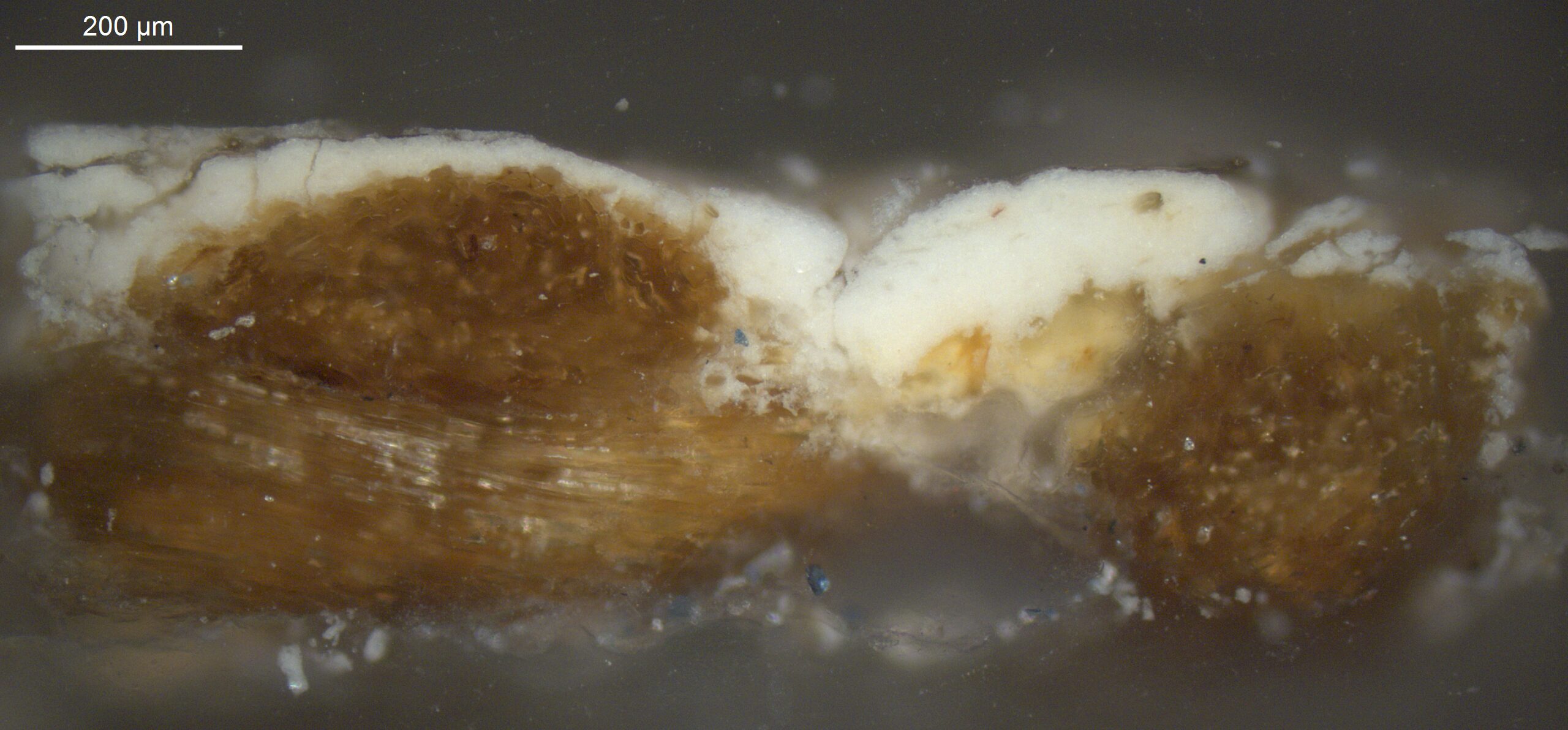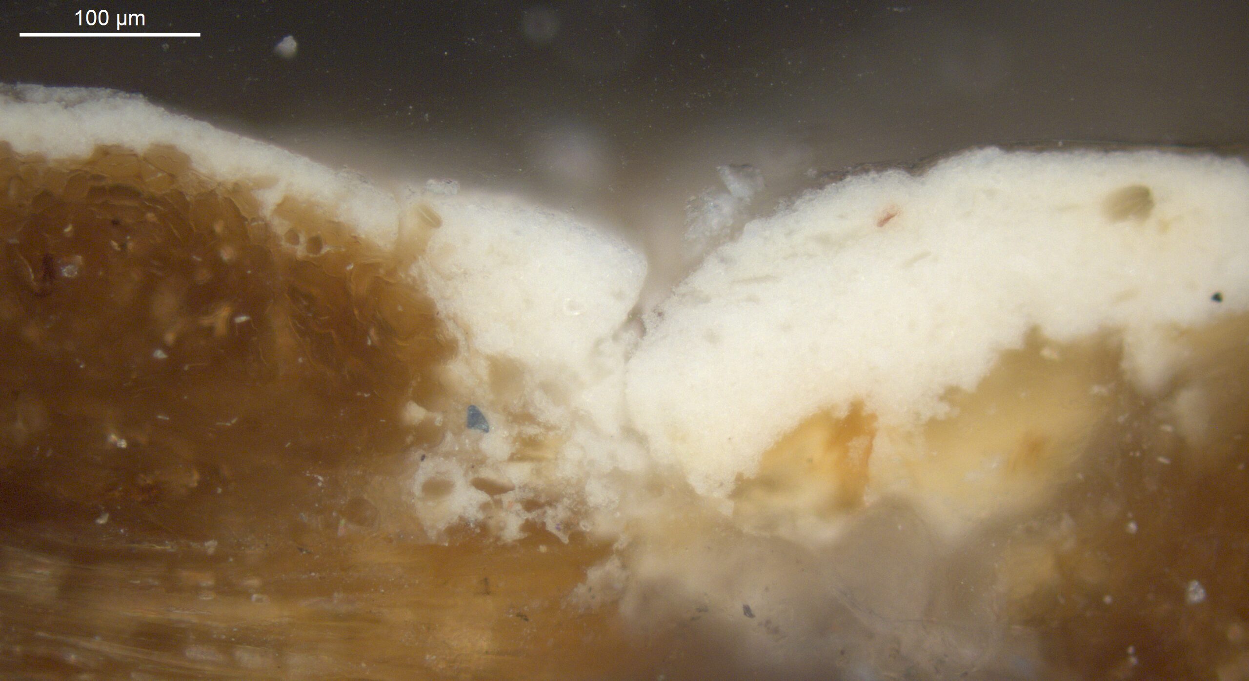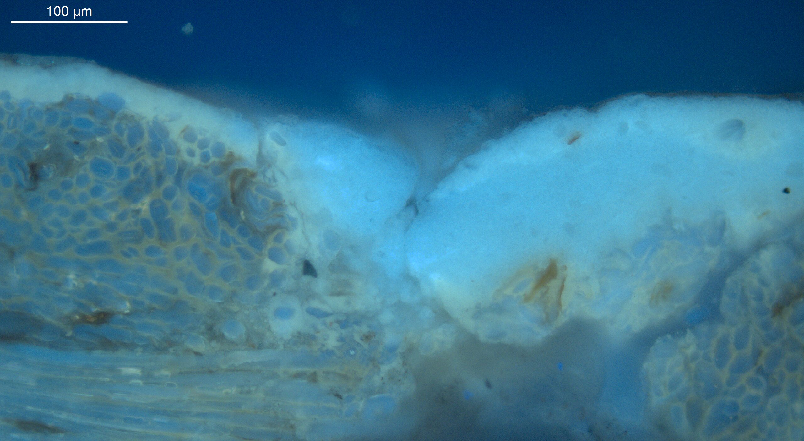 Optical microscopy uses visible light and lenses to magnify and examine the surface and structure of a painting. When applied to cross sections of paint samples, it allows for detailed observation of a painting’s stratigraphy (layer structure) and pigment particles. It is often employed with various illumination techniques, such as dark field and UV fluorescence, to enhance the analysis. Layer number 1 in the results section below the images refers to the layer at the bottom of the cross section.
