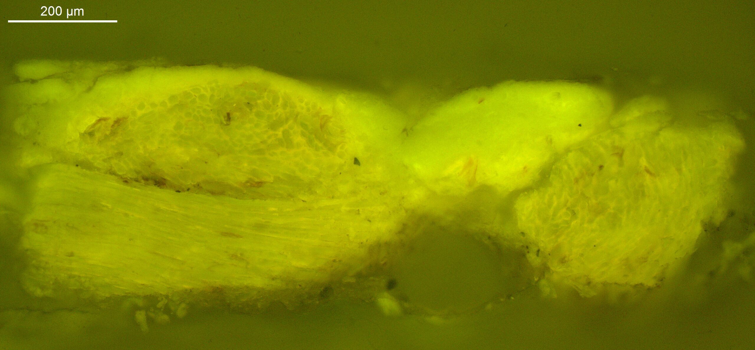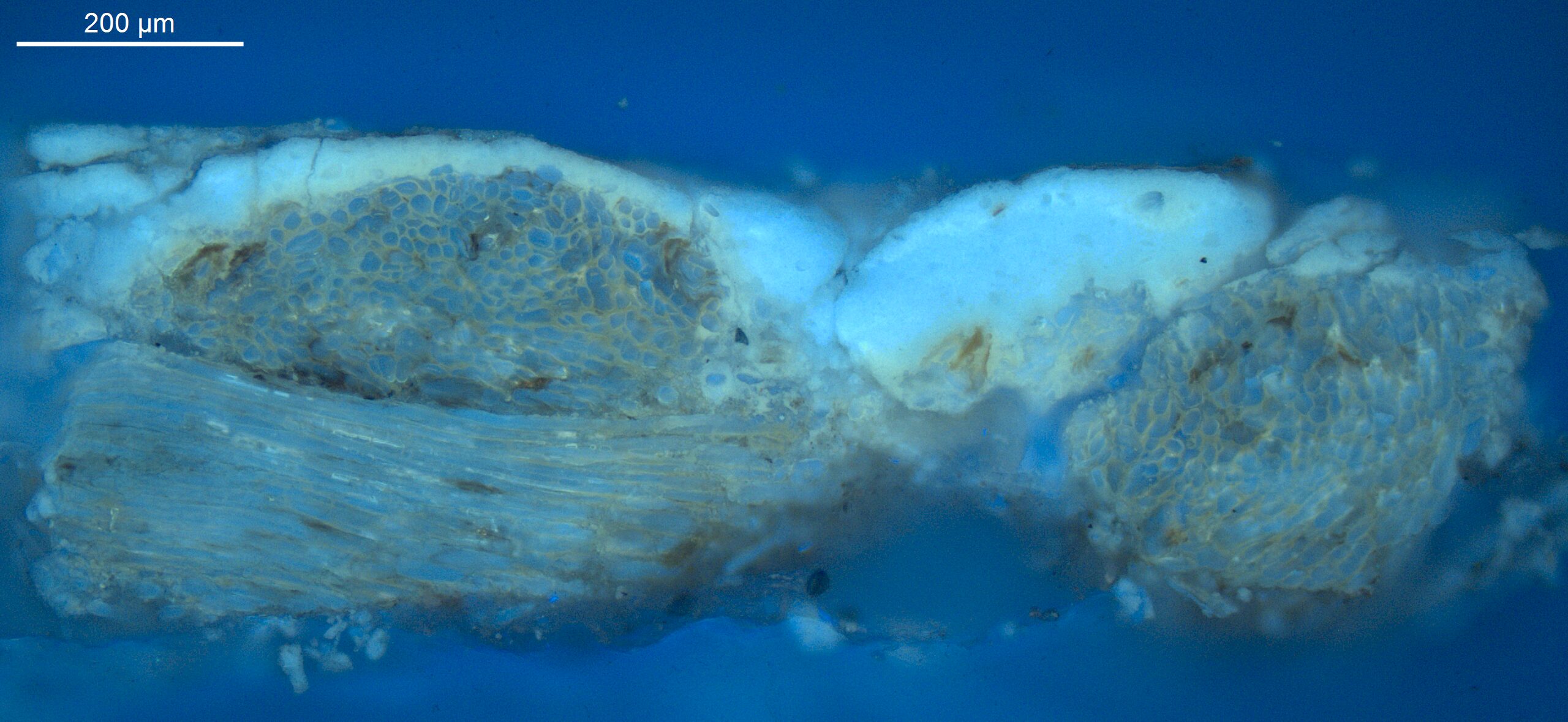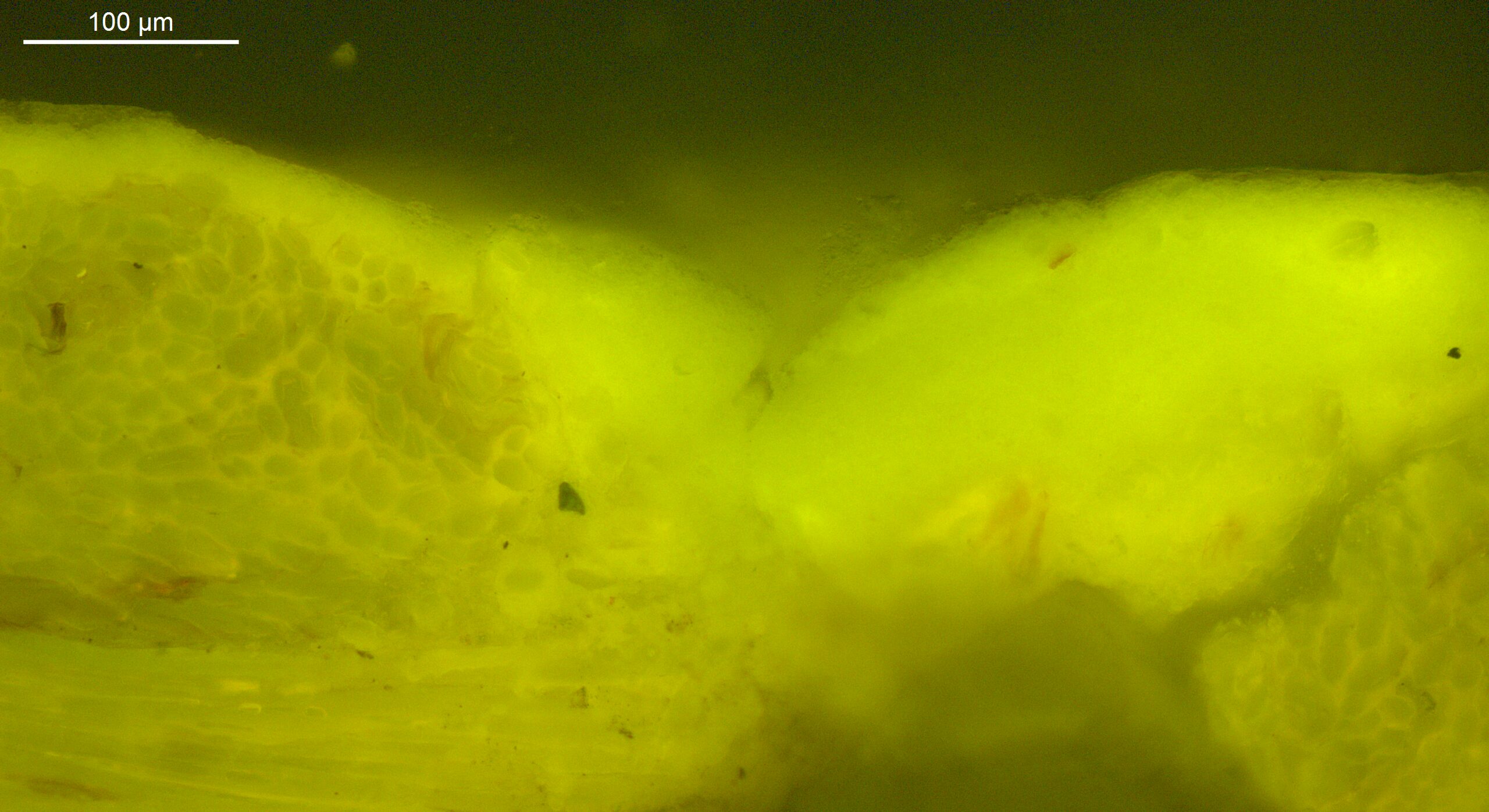 Optical microscopy uses visible light and lenses to magnify and examine the surface and structure of a painting. When applied to cross sections of paint samples, it allows for detailed observation of a painting’s stratigraphy (layer structure) and pigment particles. It is often employed with various illumination techniques, such as dark field and UV fluorescence, to enhance the analysis. Layer number 1 in the results section below the images refers to the layer at the bottom of the cross section.
