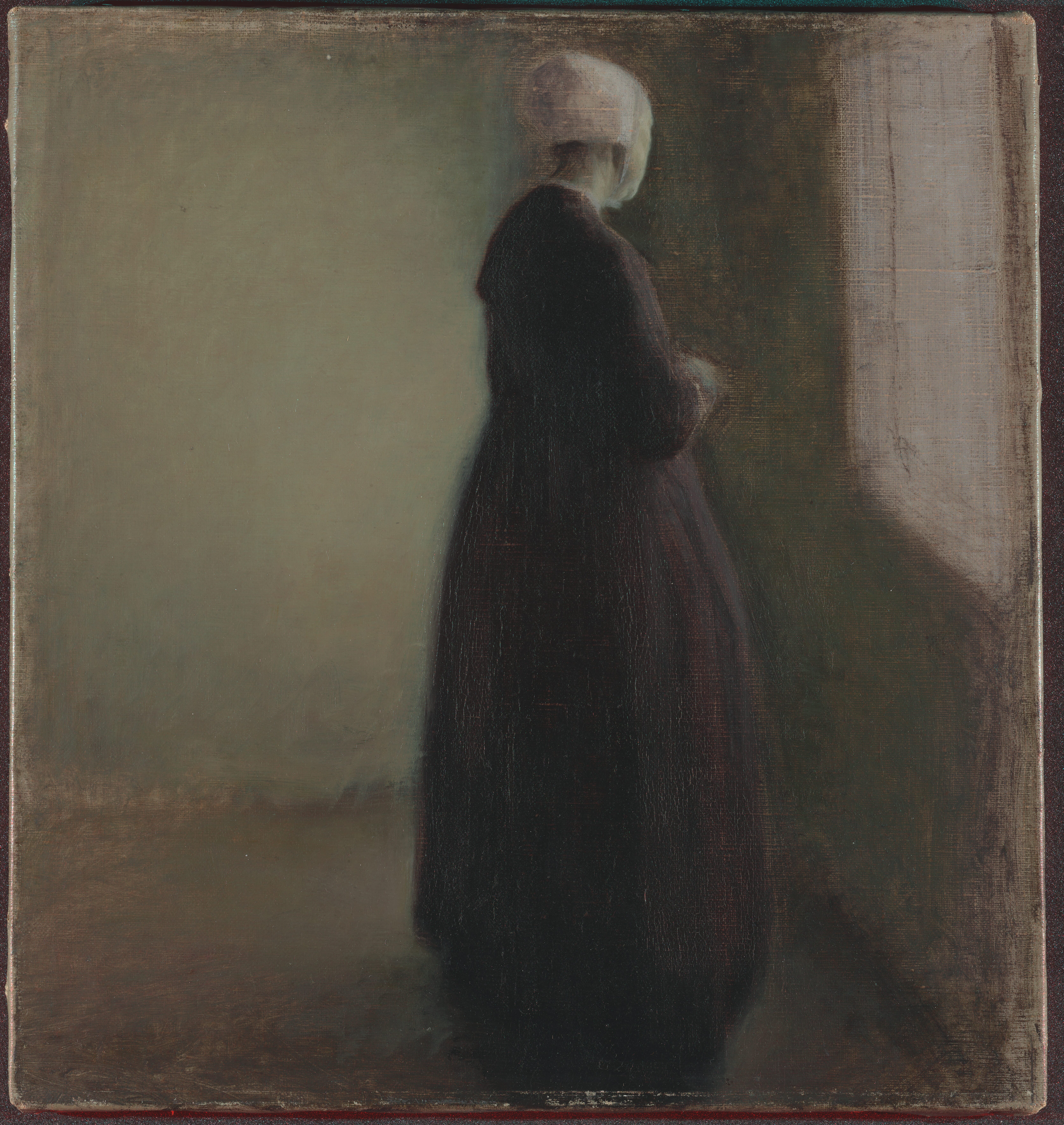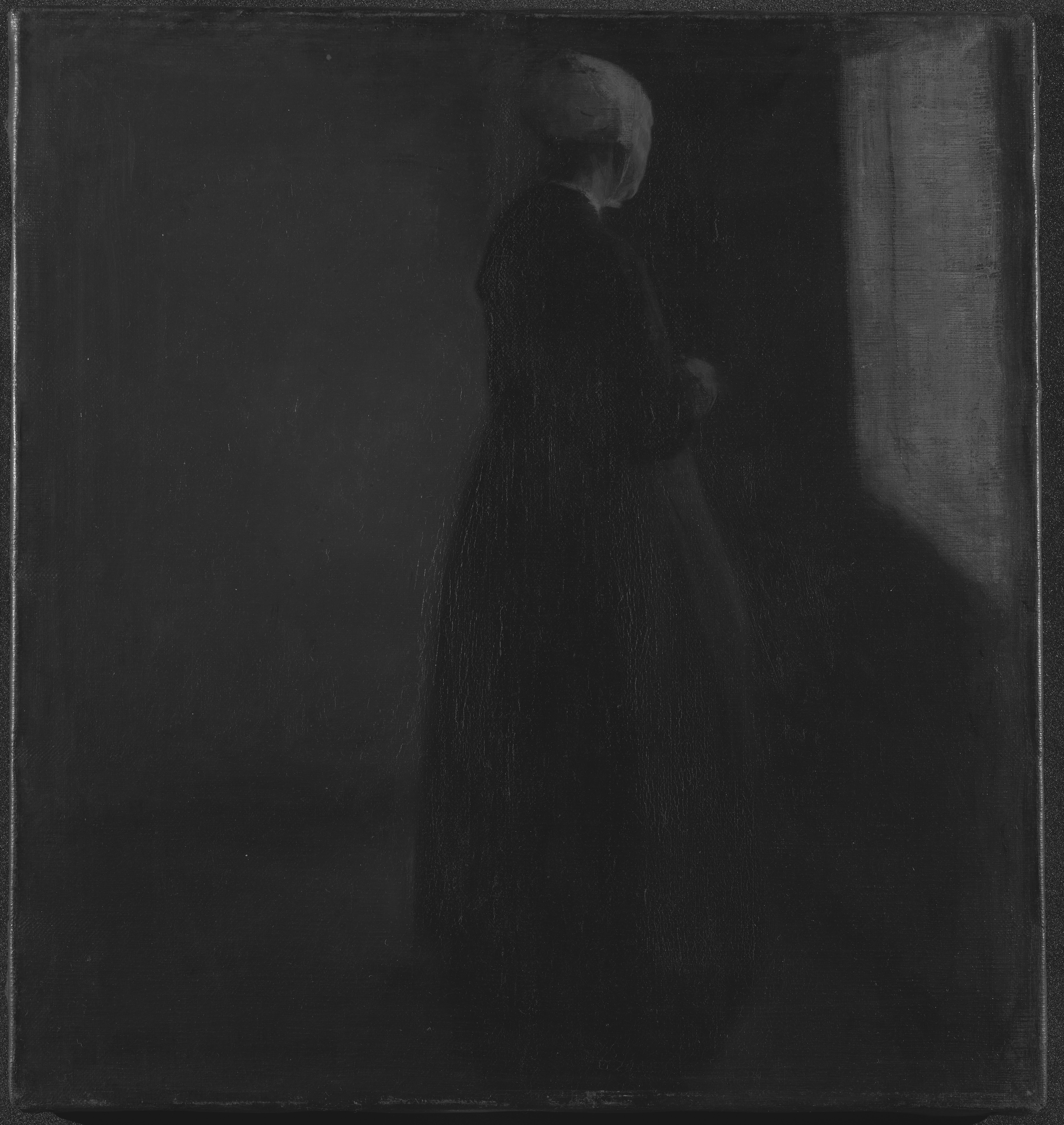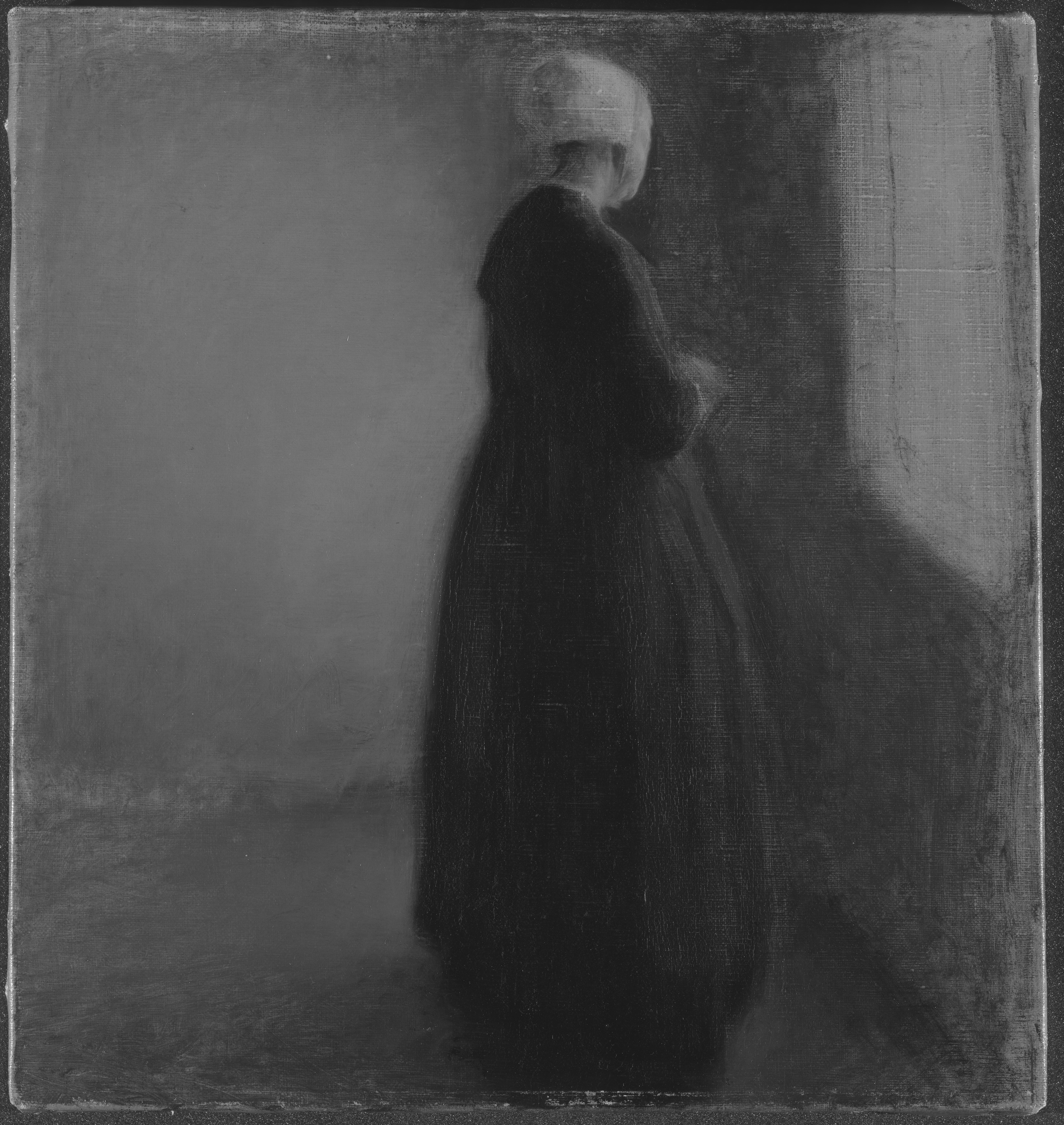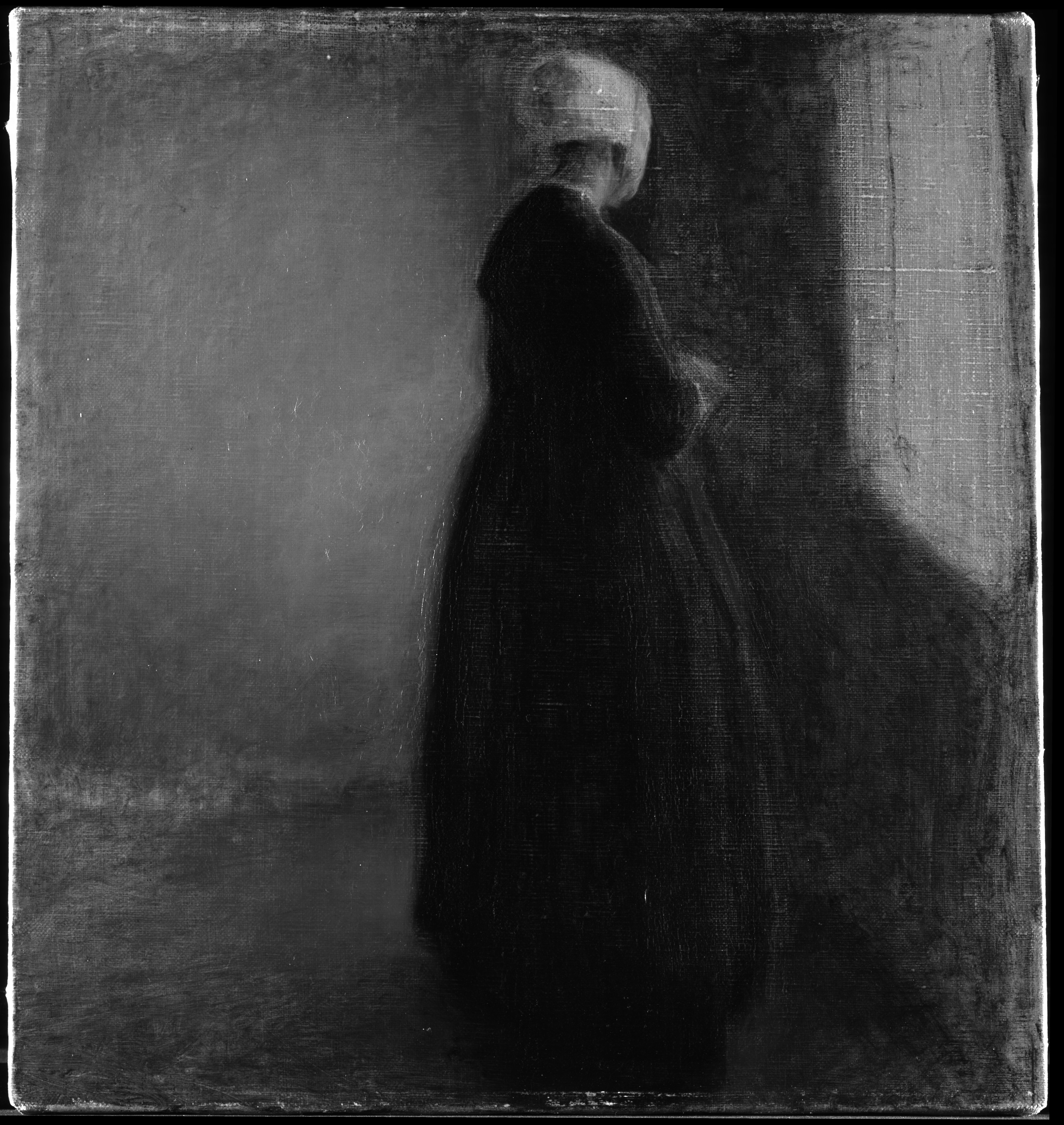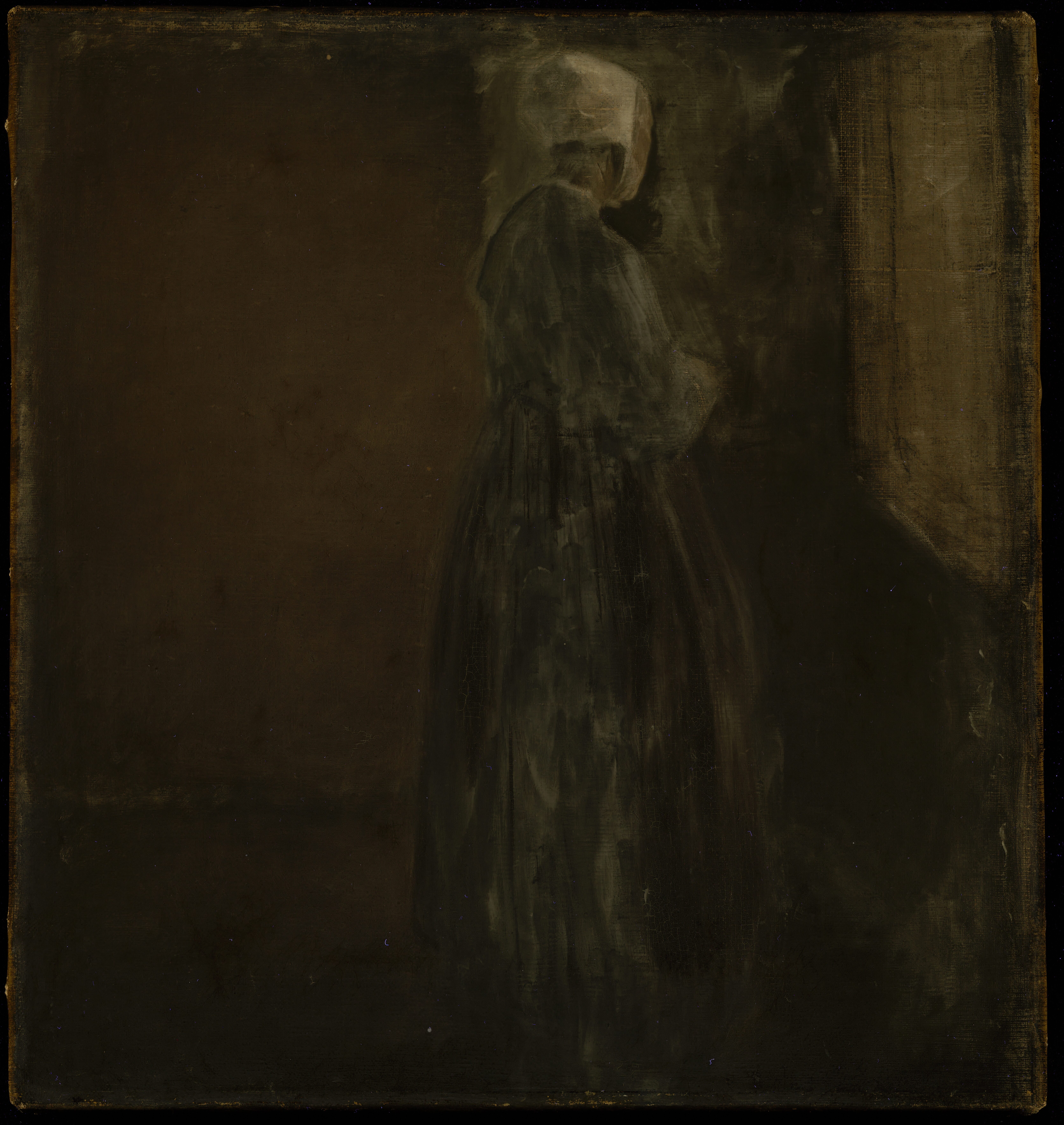 I Bramsen (1918) beskrevet som følger: ‘EN GAMMEL KONE. Studie. Konen staar ved et Vindu tilhøjre i Billedet. Hel Figur. Sort Dragt m. hvid Kappe. Bortvendt Profil mod Højre’.