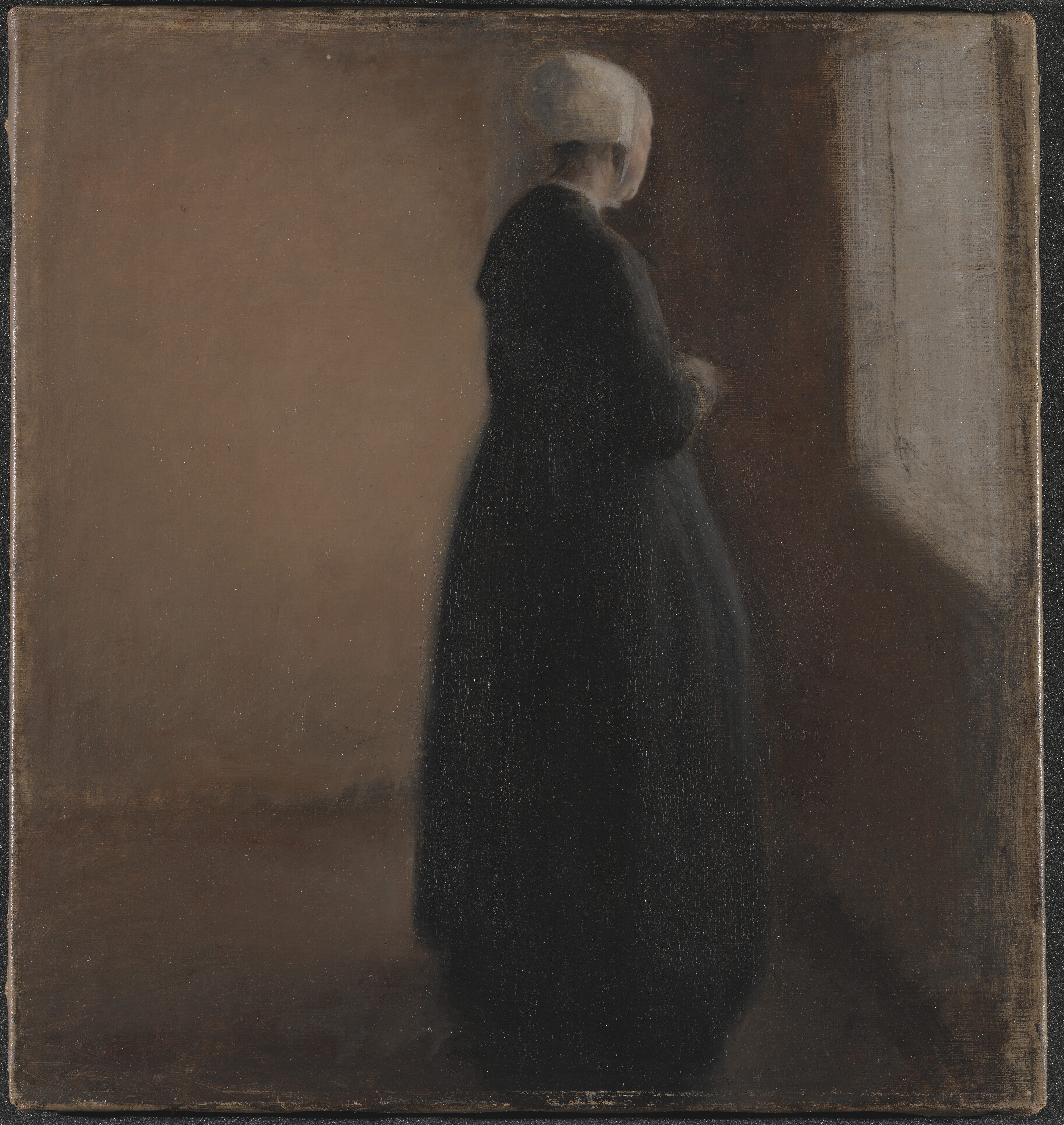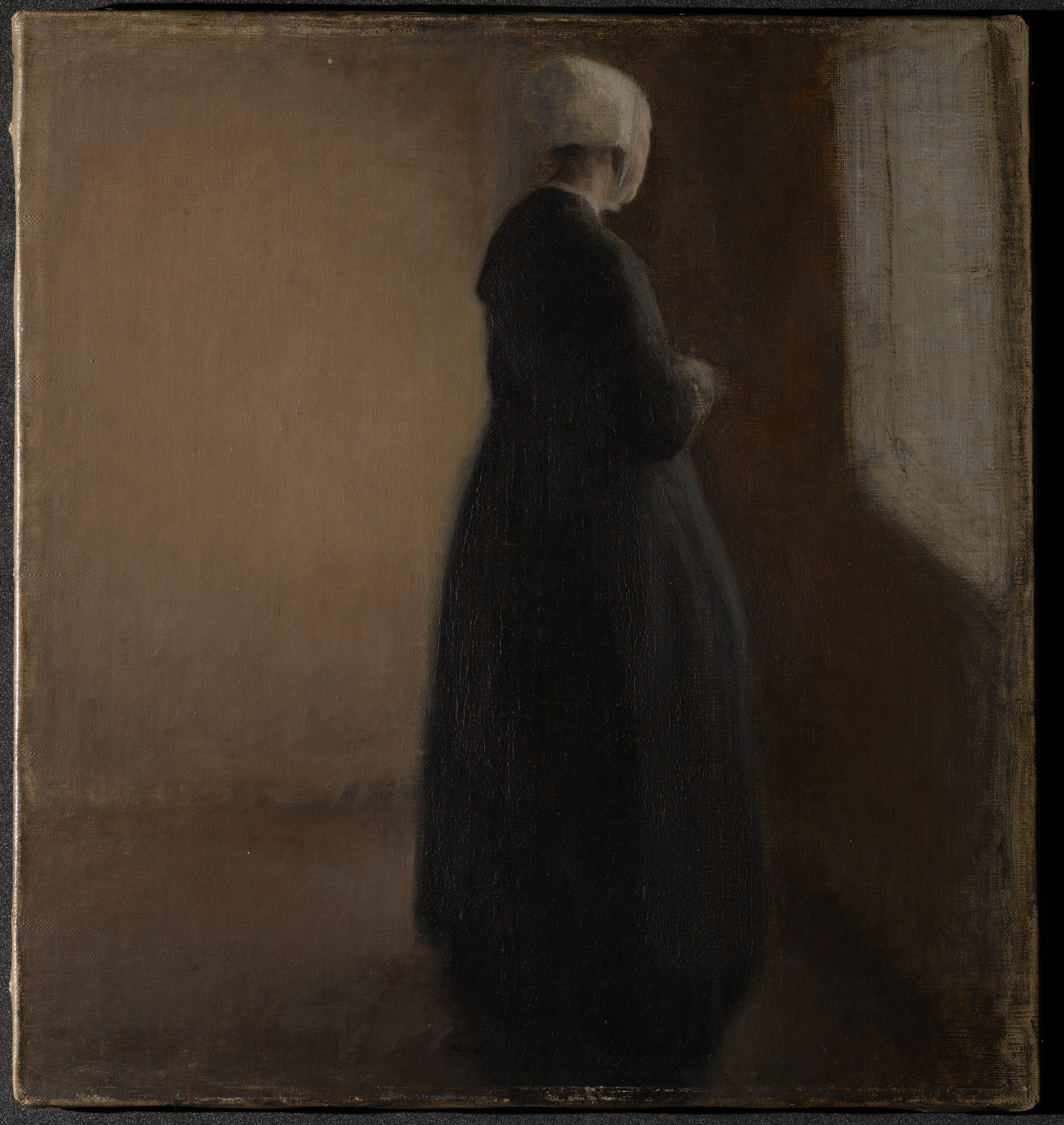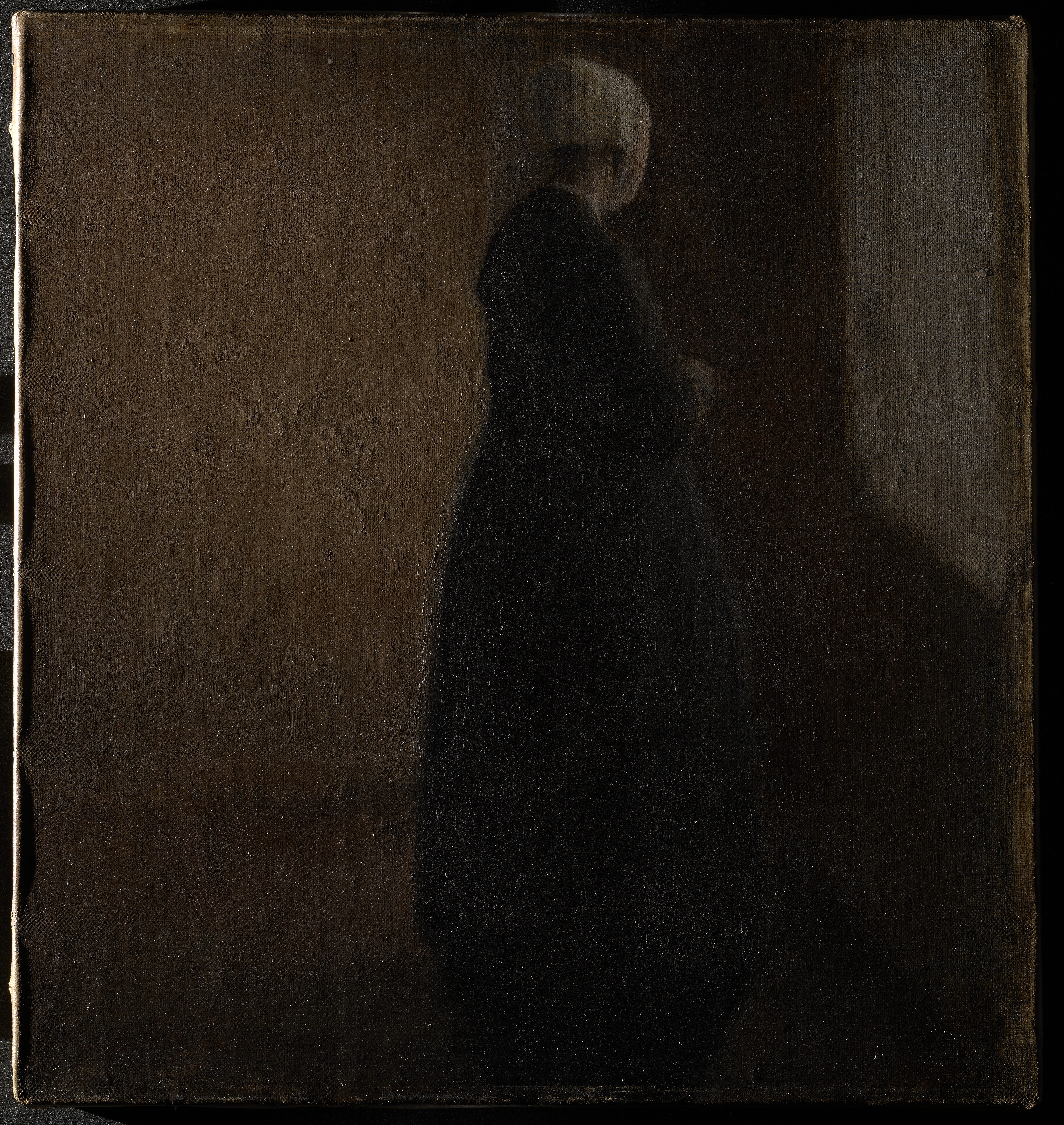 Udstillet på Den Frie Udstilling i 1891. Maleriet er beslægtet med andre værker fra perioden (blandt andre survey nr. 23 og nr. 24), hvor Hammershøi udforsker, hvordan man kan skildre rygvendte figurer placeret i forskellige interiører og set op mod vægge i lidt akavede nærbilleder. I dette tilfælde skaber figurens placering i hjørnet en intens – og noget klaustrofobisk – stemning , der synes at trække figuren ind i maleriets dybder og nærmest opsluge den. Til sammenligning viser Bramsen nr. 38 en næsten identisk komposition, men i en mere brunlig tone og med en skitseagtig udførelse (nu i samlingen på Schleswig-Holsteinische Landesmuseum, Schloss Gottorf, illustreret i Hvidt og Oelsner, 2018, s. 110). I et andet beslægtet maleri, survey nr. 42, ser det ud til at Hammershøi undersøger effekten af at placere en lignende figur i en anden komposition, hvor kvinden sidder ned og vender sig mod beskueren – dog stadig i en noget akavet position. Det er uvist, om Hammershøi brugte den samme model til de forskellige malerier.