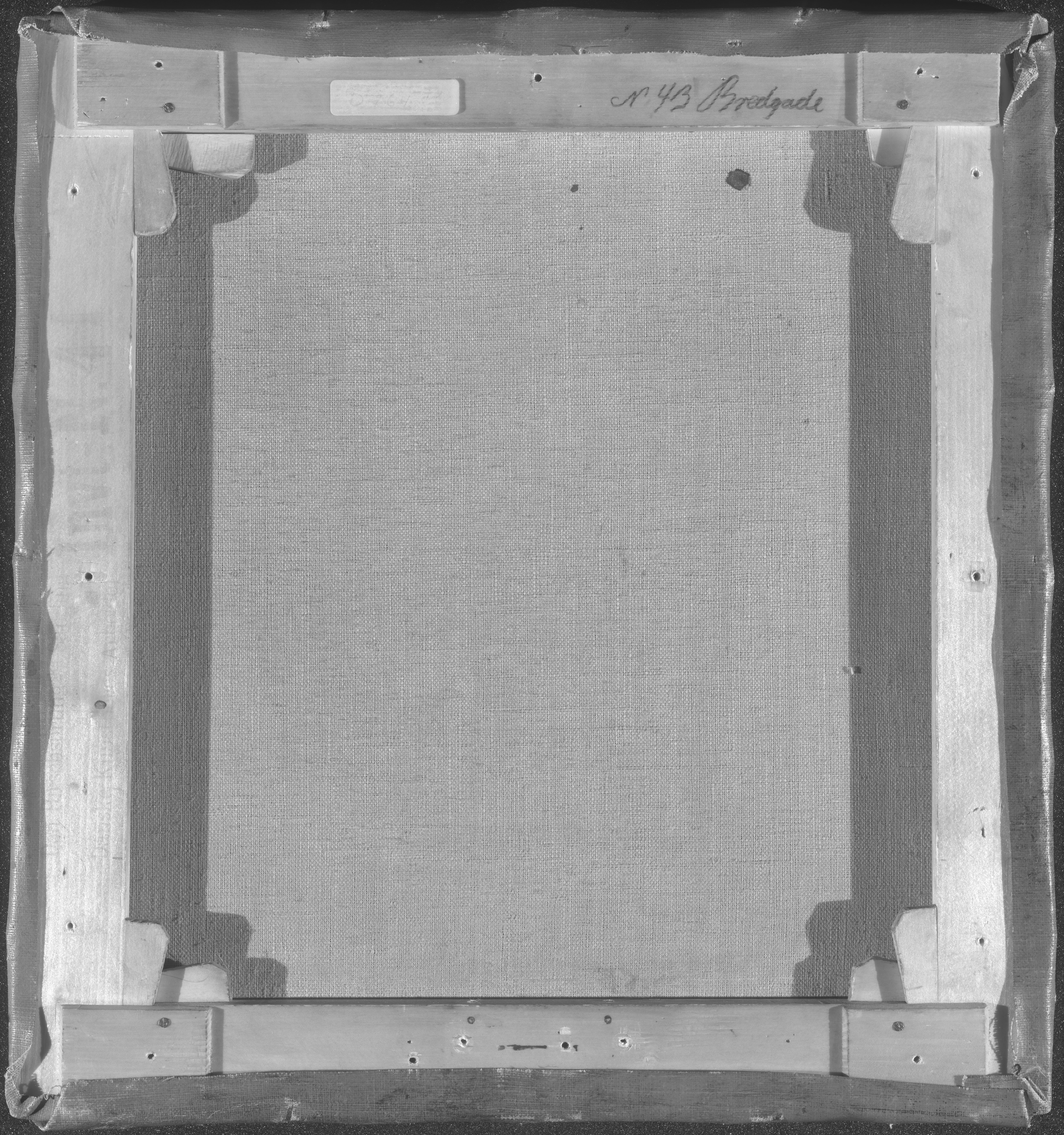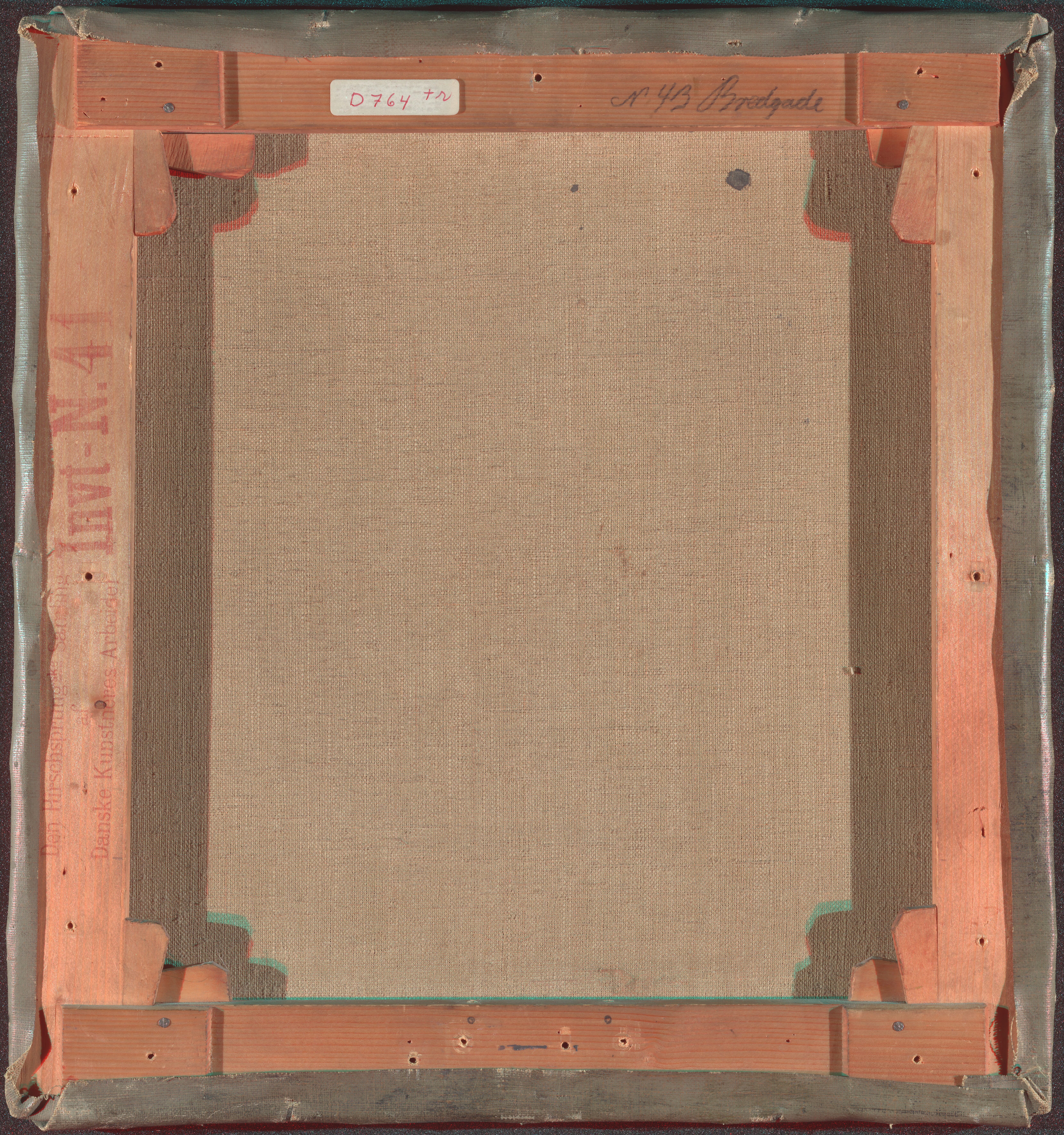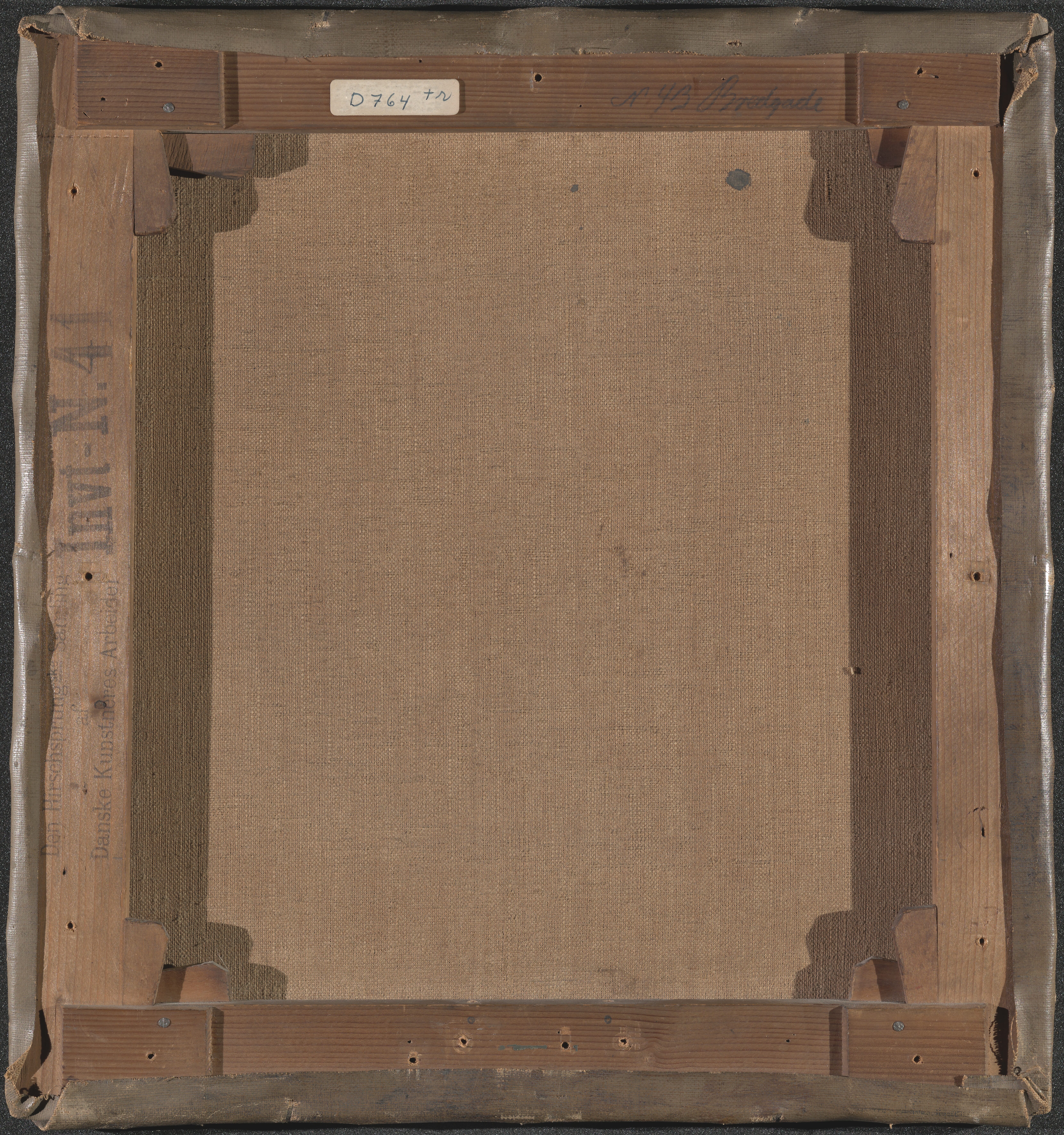 På venstre rammedel er der et stempel med teksten: ’Den Hirschsprungske Samling af Danske Kunstneres Arbejder INVT-N. 41’. En inskription med blyant på den øverste rammedel lyder: 'Nr. 43 Bredgade’. På et mærkat på den øverste rammedel står: 'D764 +r'.