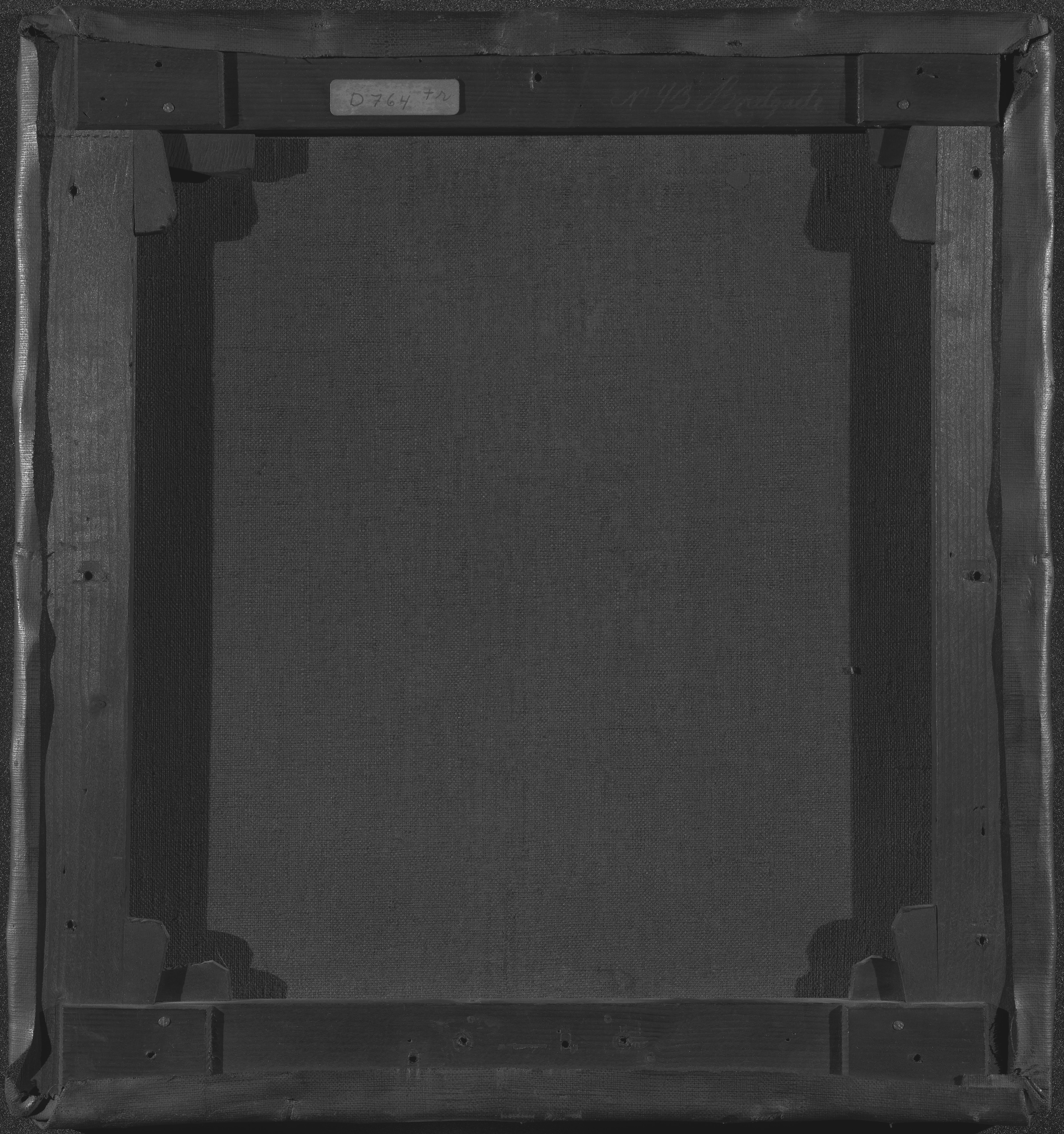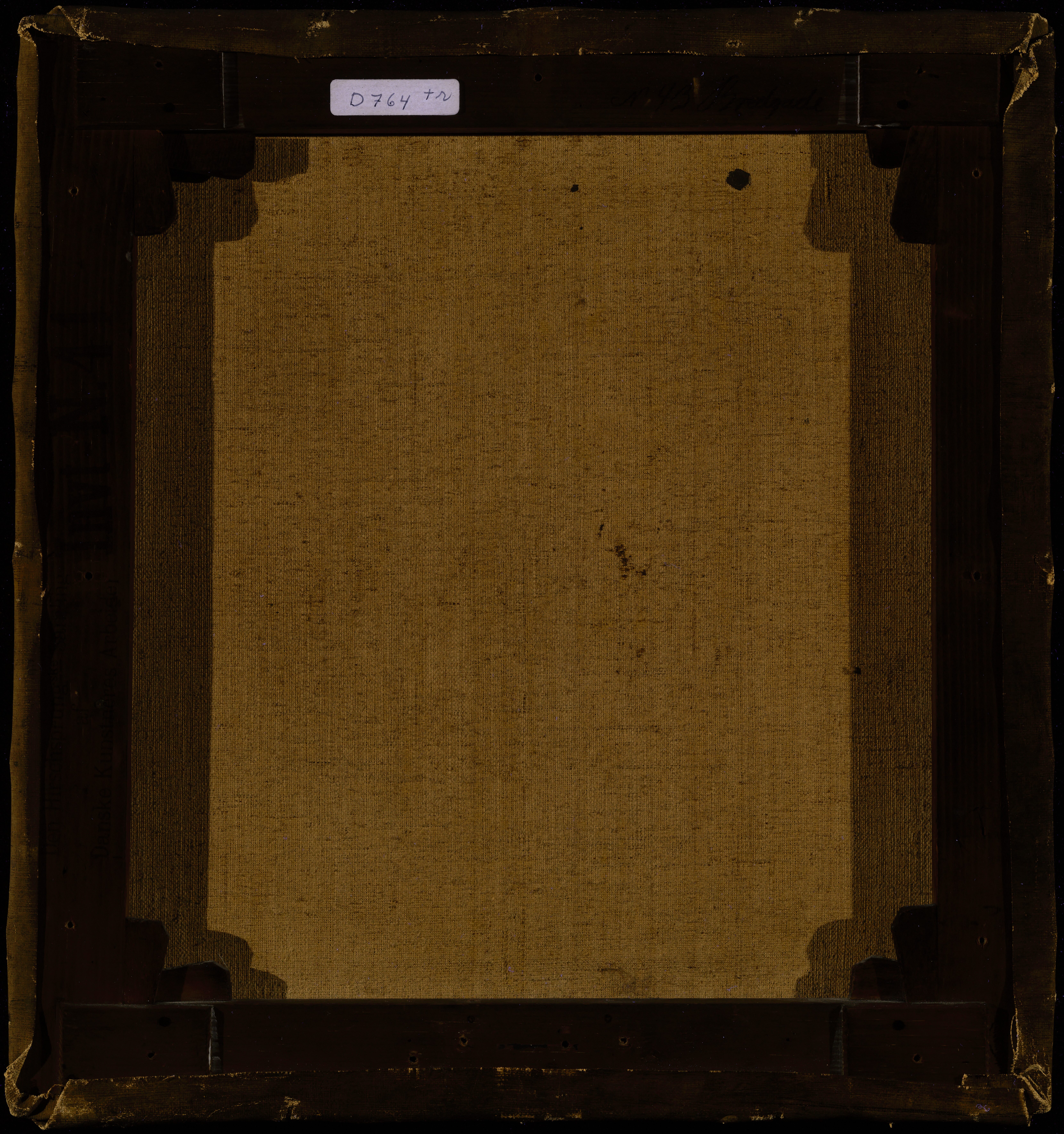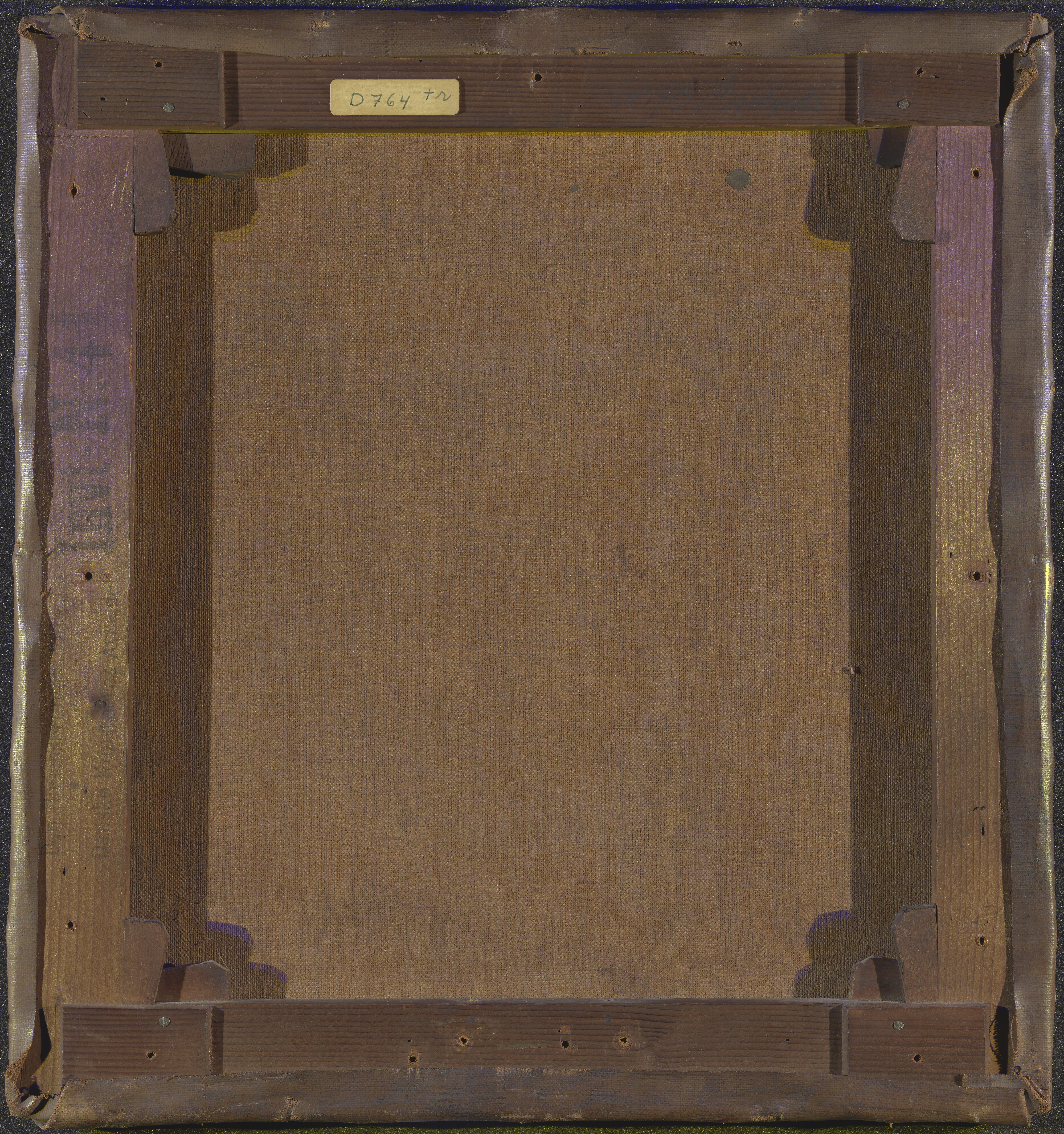 På venstre rammedel er der et stempel med teksten: ’Den Hirschsprungske Samling af Danske Kunstneres Arbejder INVT-N. 41’. En inskription med blyant på den øverste rammedel lyder: 'Nr. 43 Bredgade’. På et mærkat på den øverste rammedel står: 'D764 +r'.