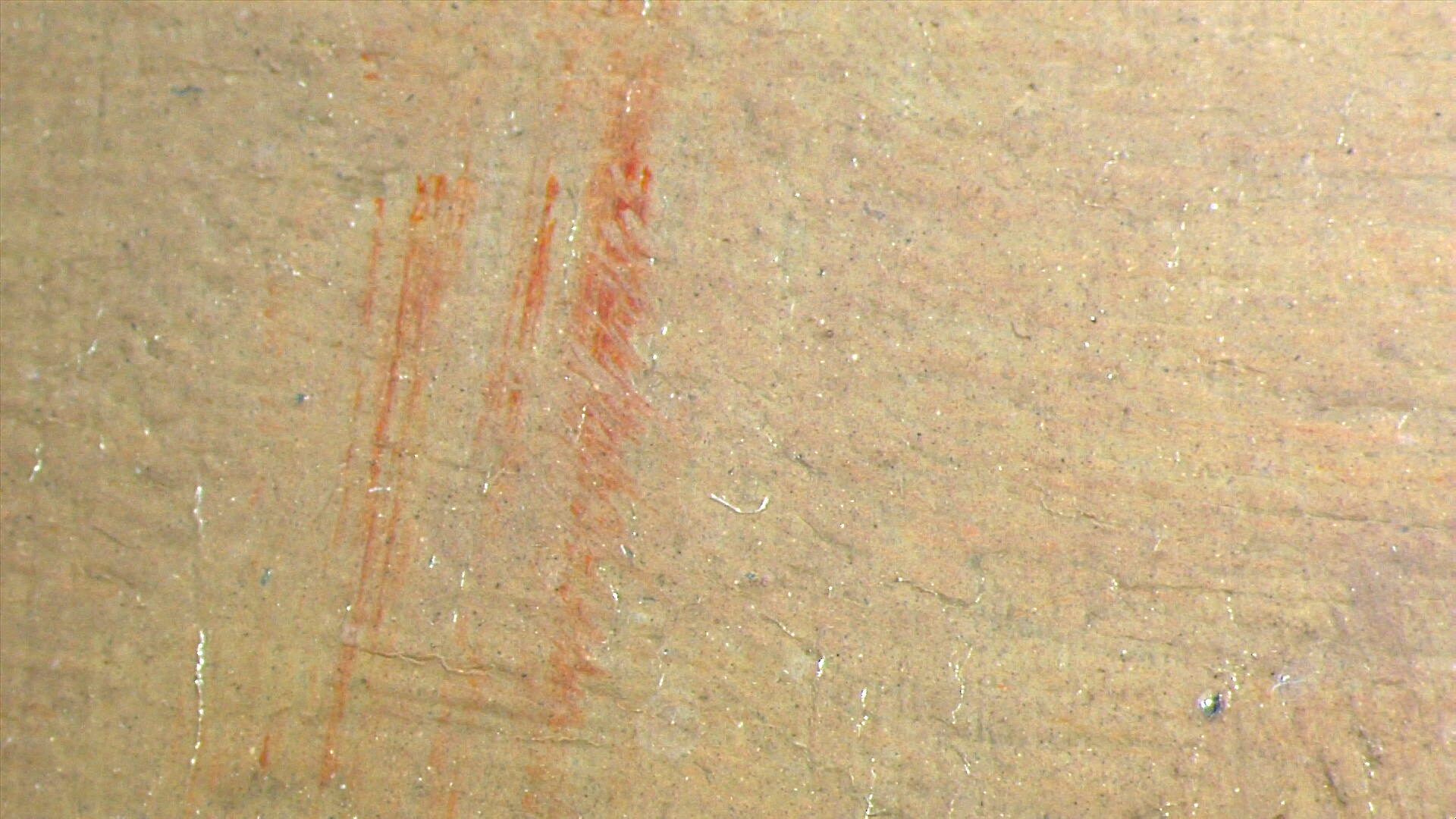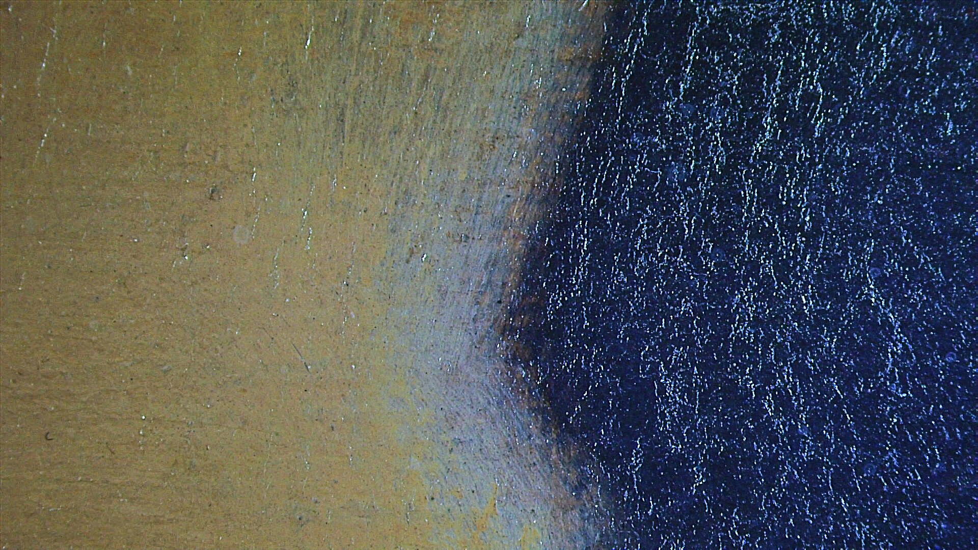 Den hvide grunderng er fuldstændig dækket af et gråt uigennemsigtigt farvelag eller imprimatura og er kun synlig i revner og ved farvetab.