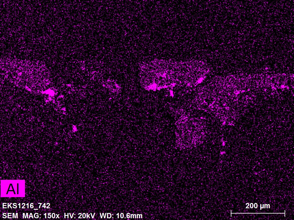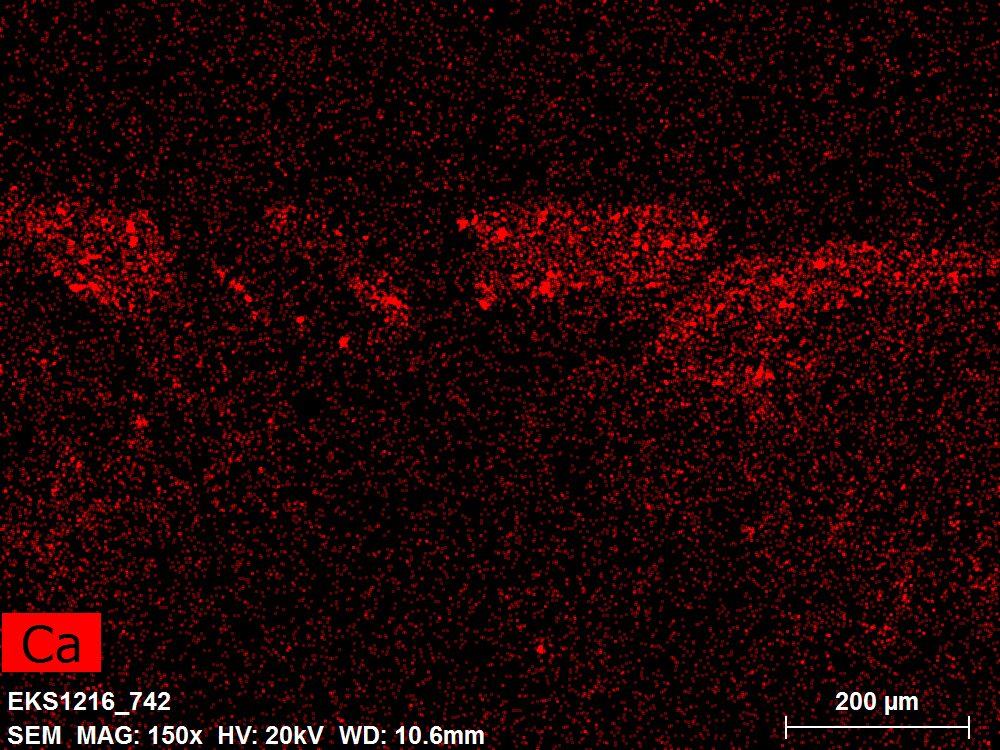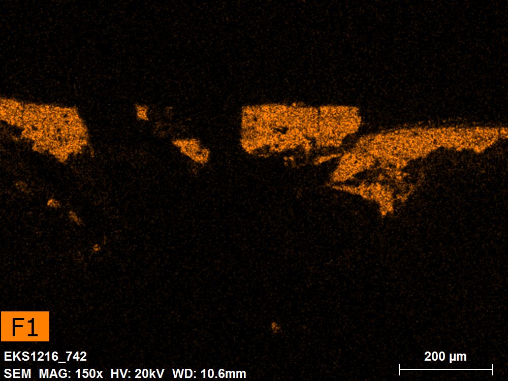 SEM-EDXS er en analysemetode, der giver meget detaljerede billeder på mikroskopisk niveau samtidig med, at den bestemmer sammensætningen af grundstoffer i en prøve. Metoden bruges især til at studere stratigrafien i farvesnit i meget lille skala, til at identificere den kemiske opbygning af pigmenter, fyldstoffer og nedbrydningsprodukter, samt til at påvise sporelementer, der kan indikere bestemte materialer. Nedenfor henviser grundstofferne angivet i parentes til grundstoffer, hvis relative forekomst er under 10 % af det samlede signal. Grundstofbilledet F1 herunder repræsenterer Pb M-linjen. Læs mere om dette under SEM-EDXS i ordlisten.