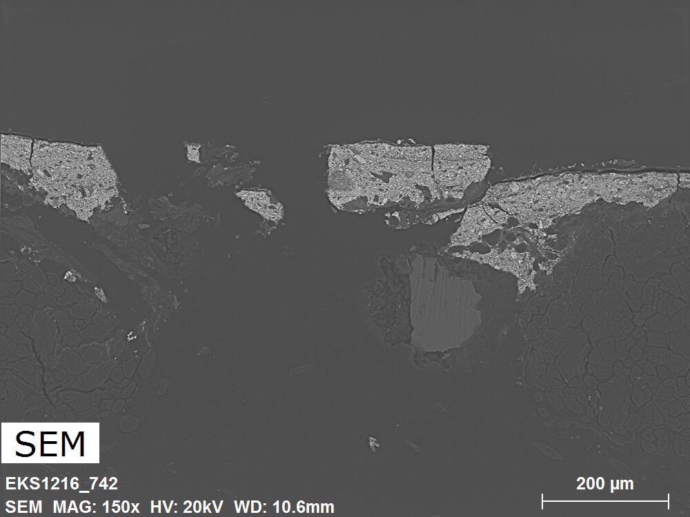 Grunderingen er lokalt synlig på bagsiden, set under mikroskop.