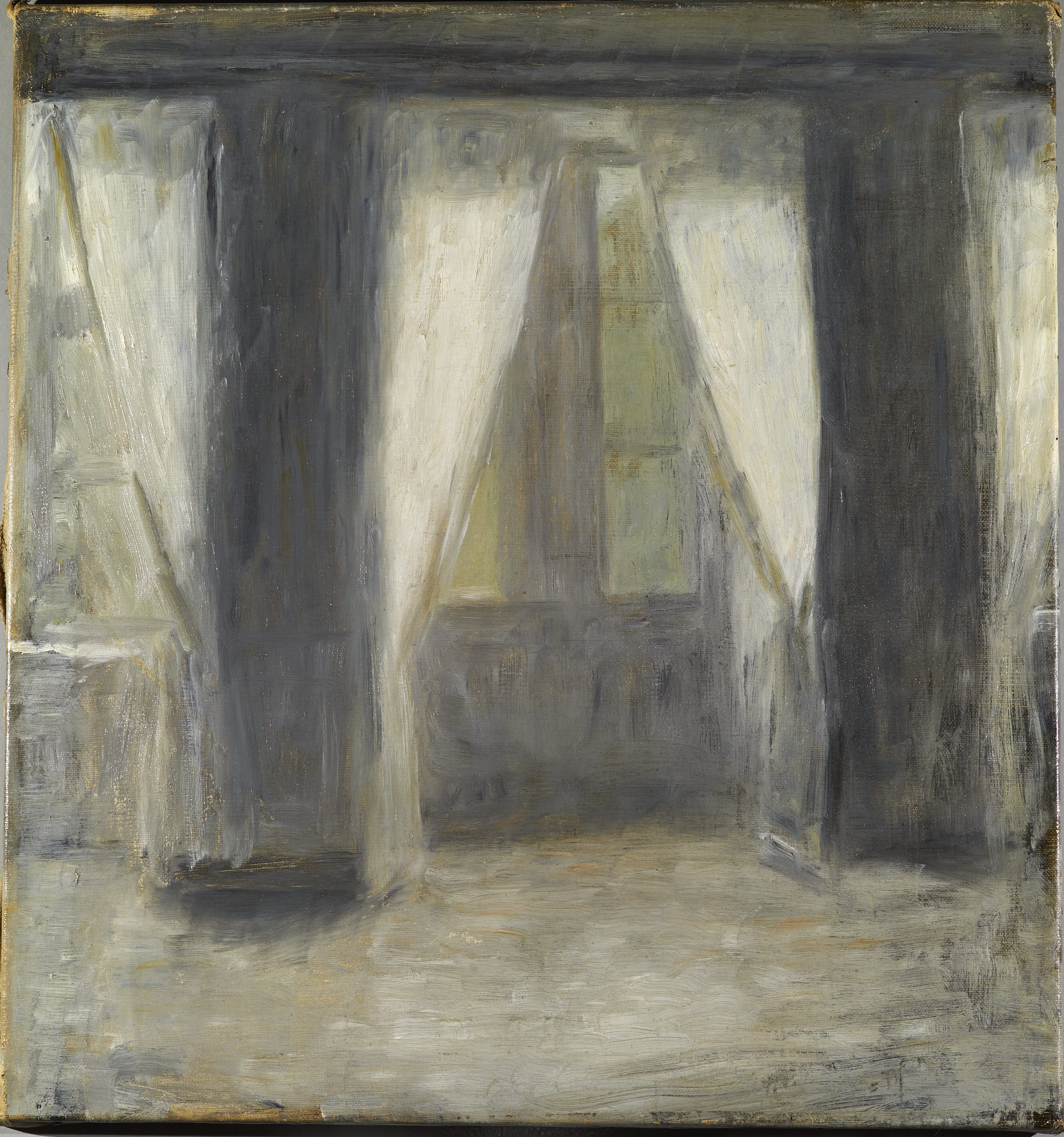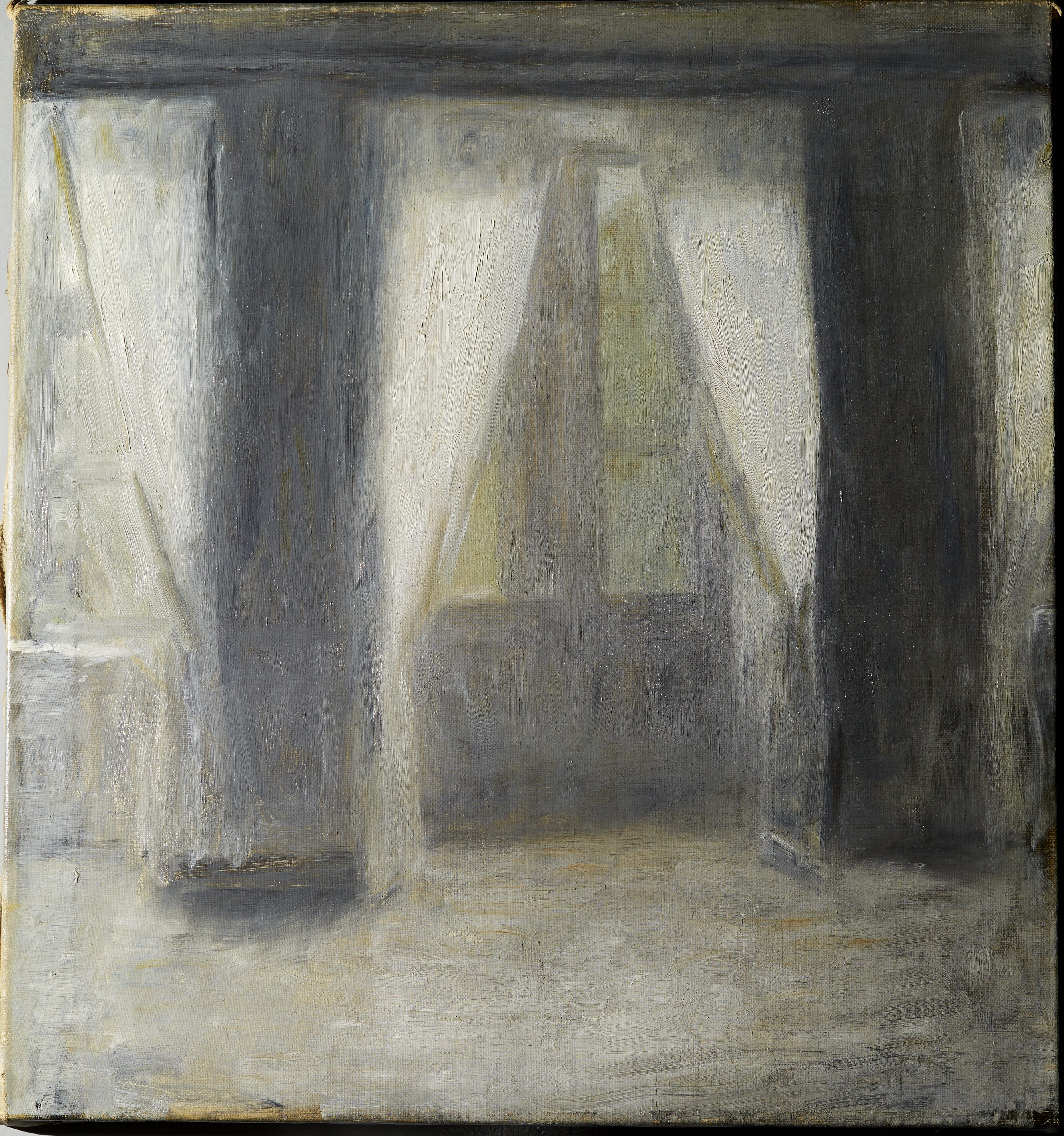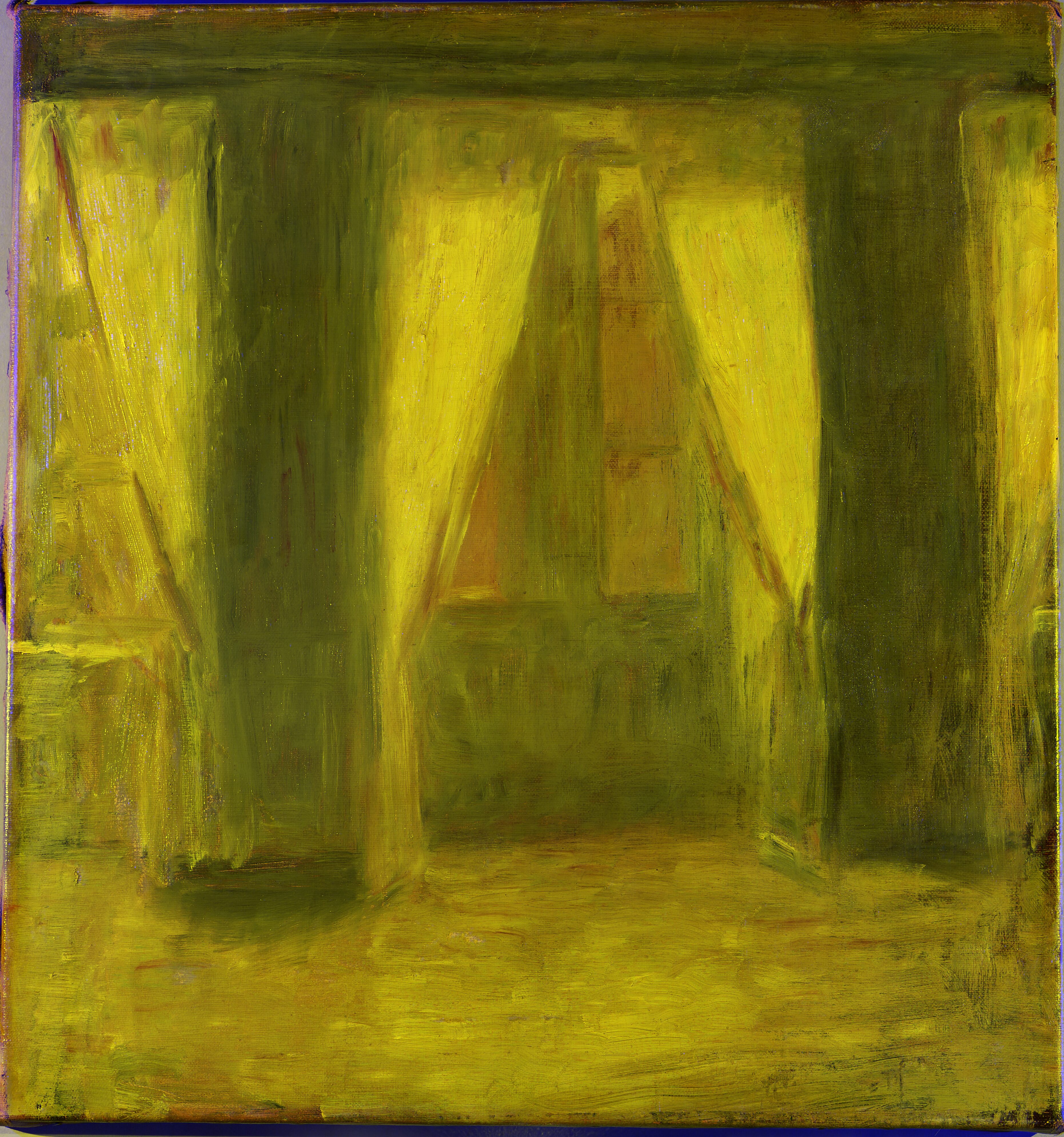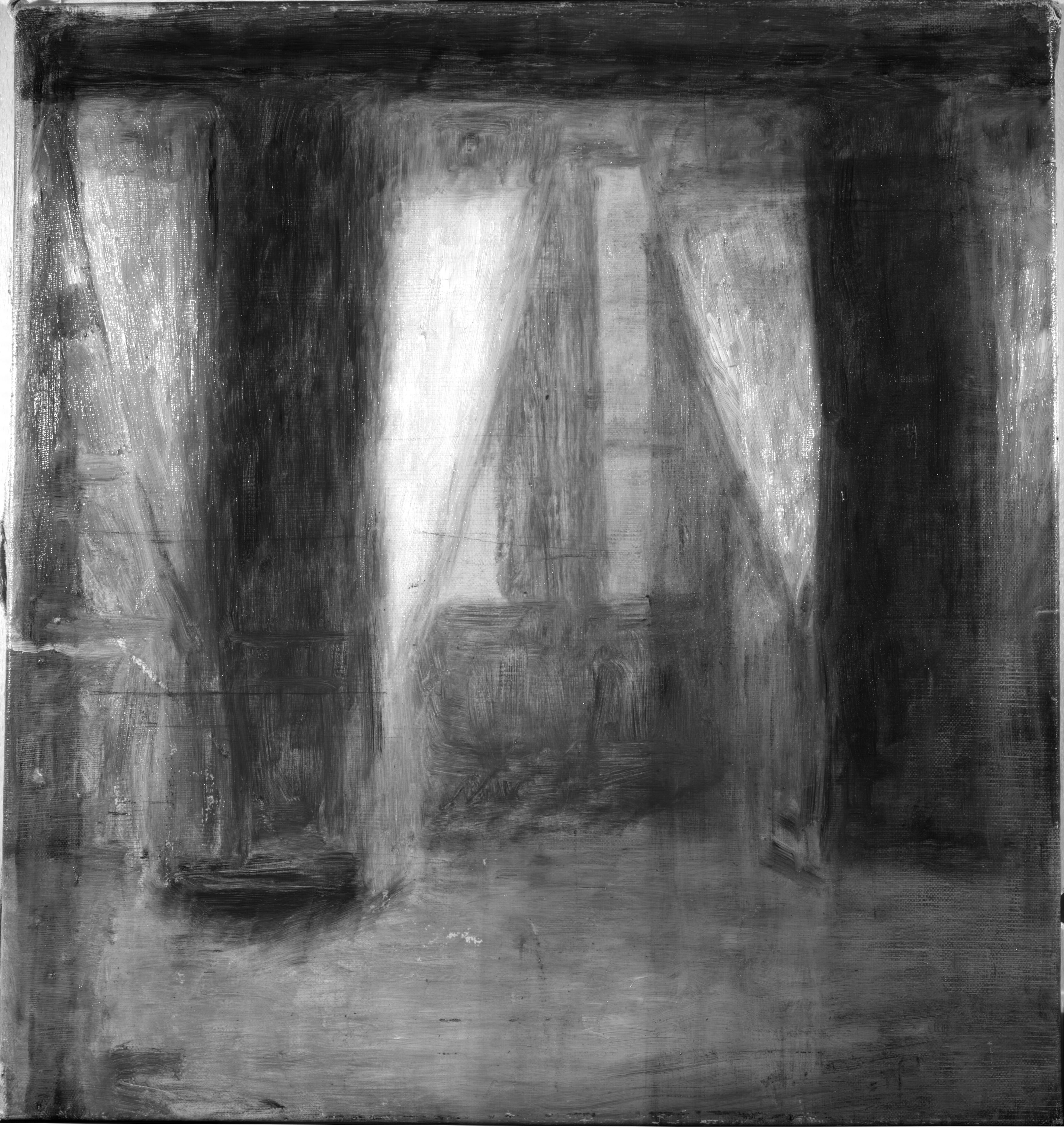 Ingen tydelig rækkefølge - højst sandsynligt malet i én omgang. Gardinernes hvide farve blev påført på et sent tidspunkt i maleprocessen.