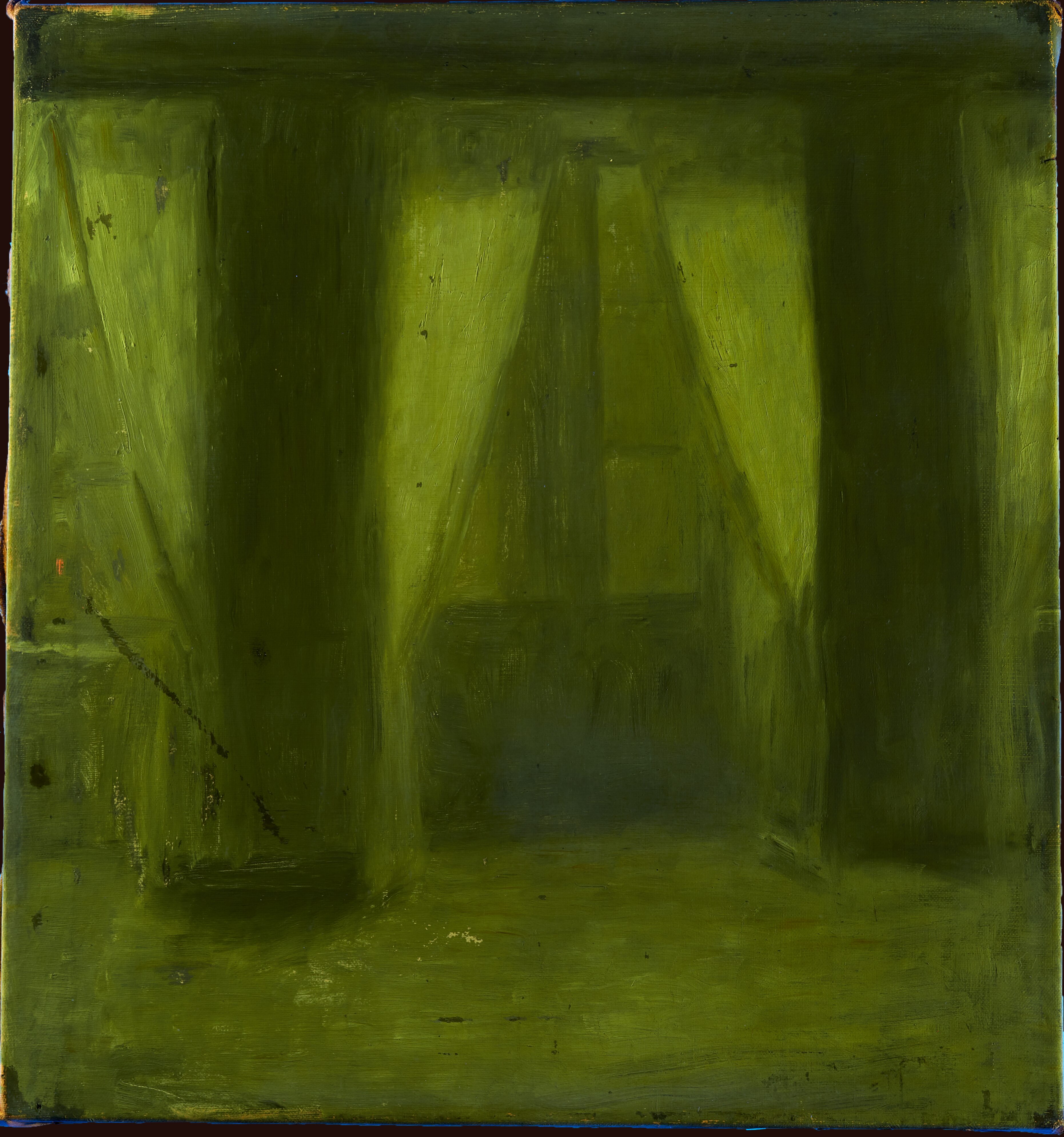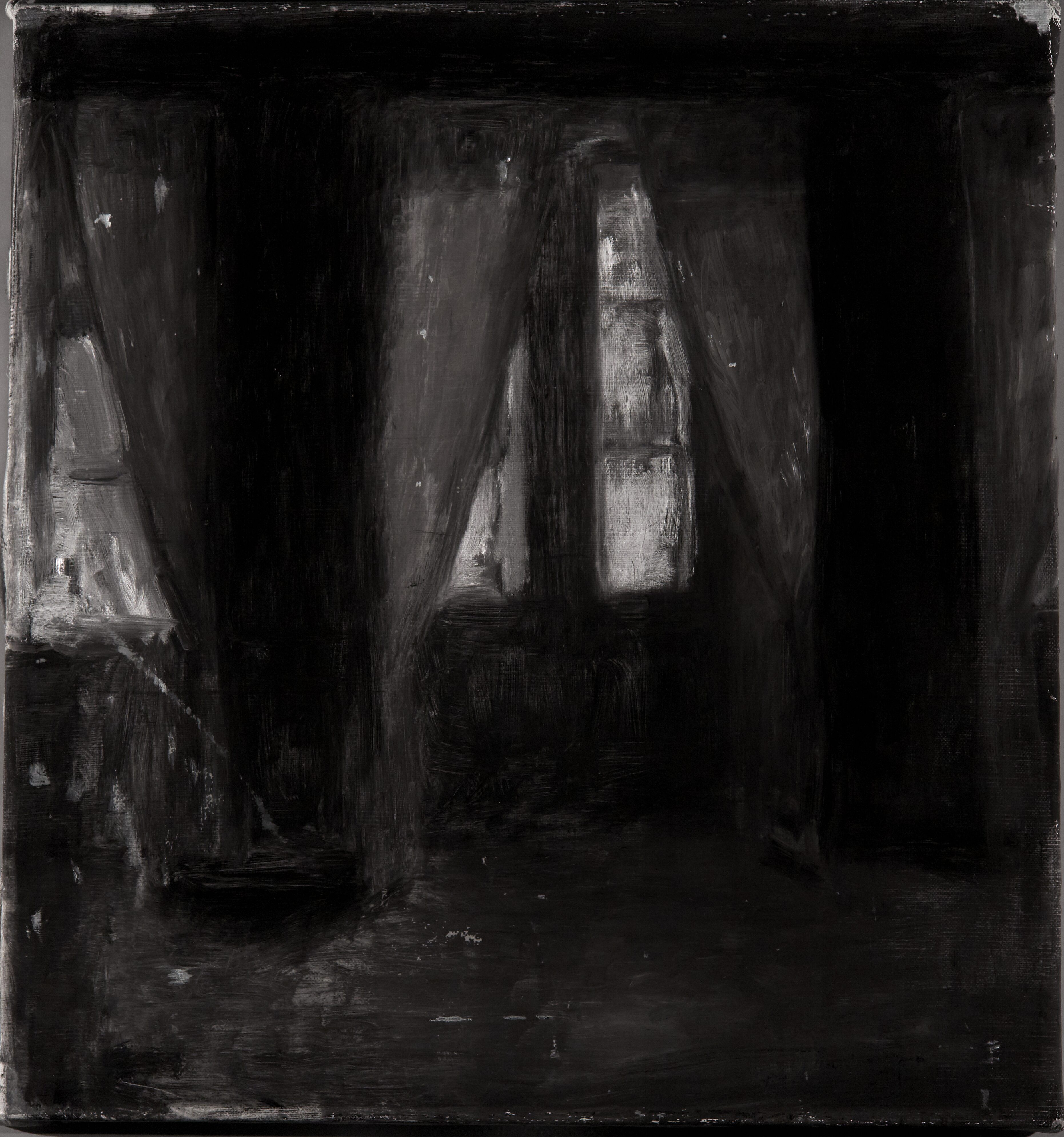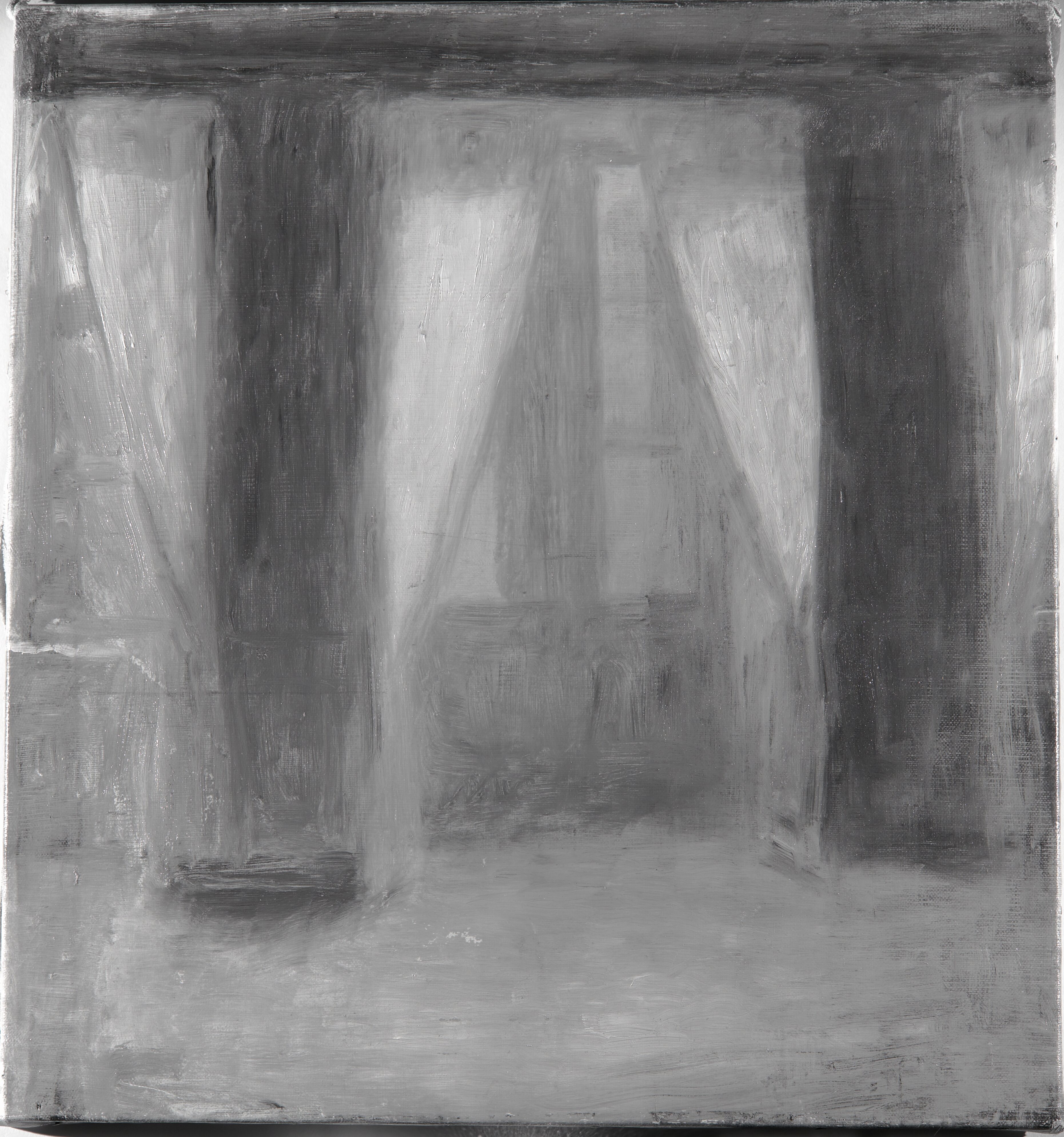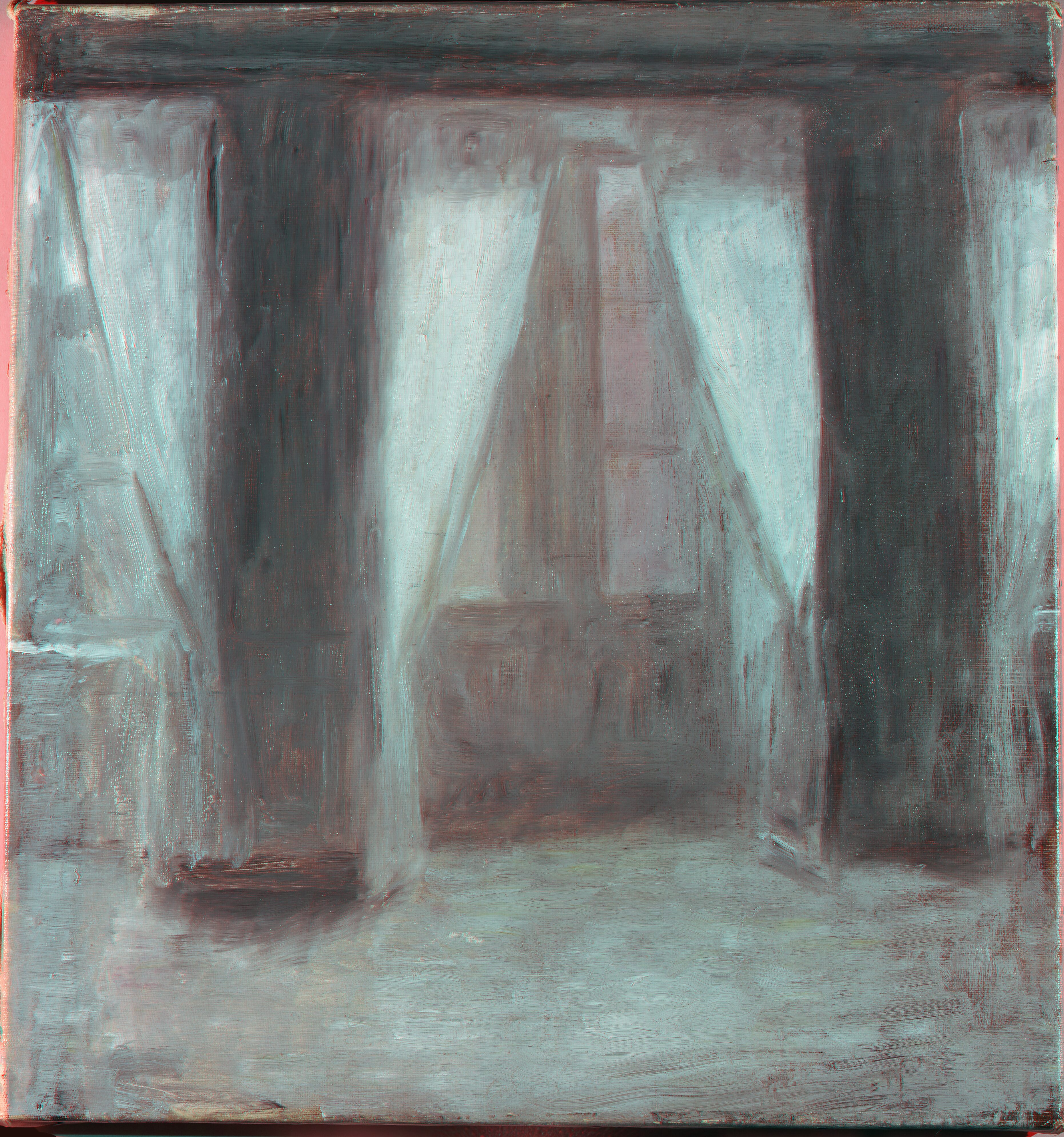 Ingen tydelig rækkefølge - højst sandsynligt malet i én omgang. Gardinernes hvide farve blev påført på et sent tidspunkt i maleprocessen.