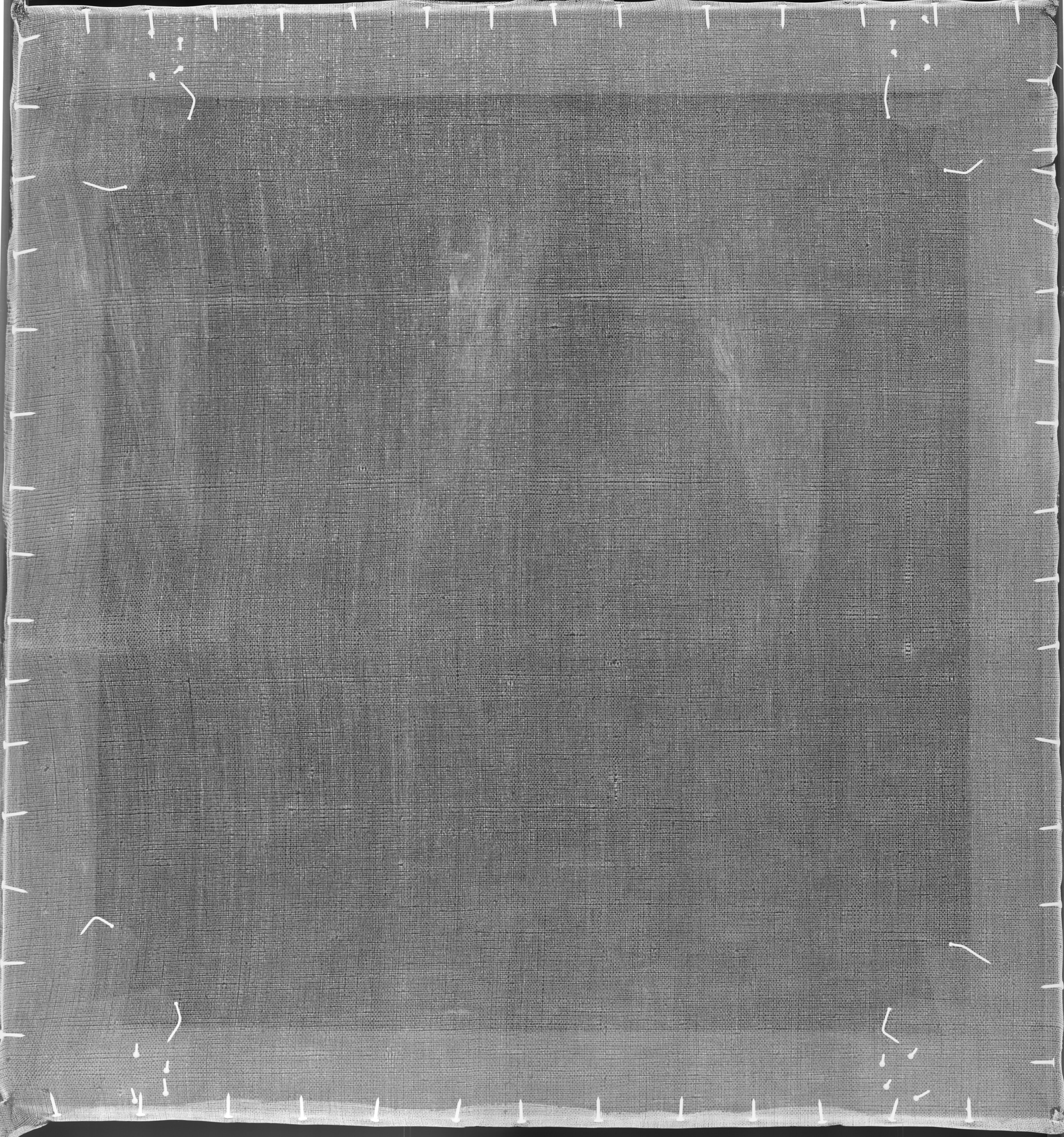 På hele lærredet. I venstre side er der dog smalle områder af ugrunderet lærred tæt på den afskårne ægkant.