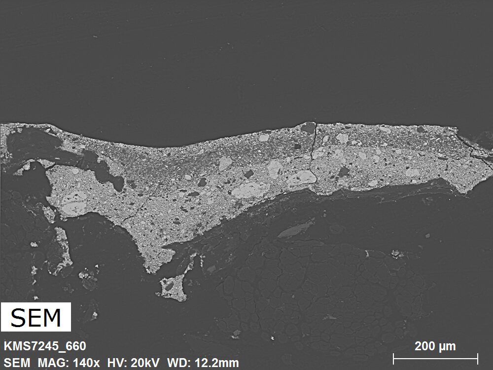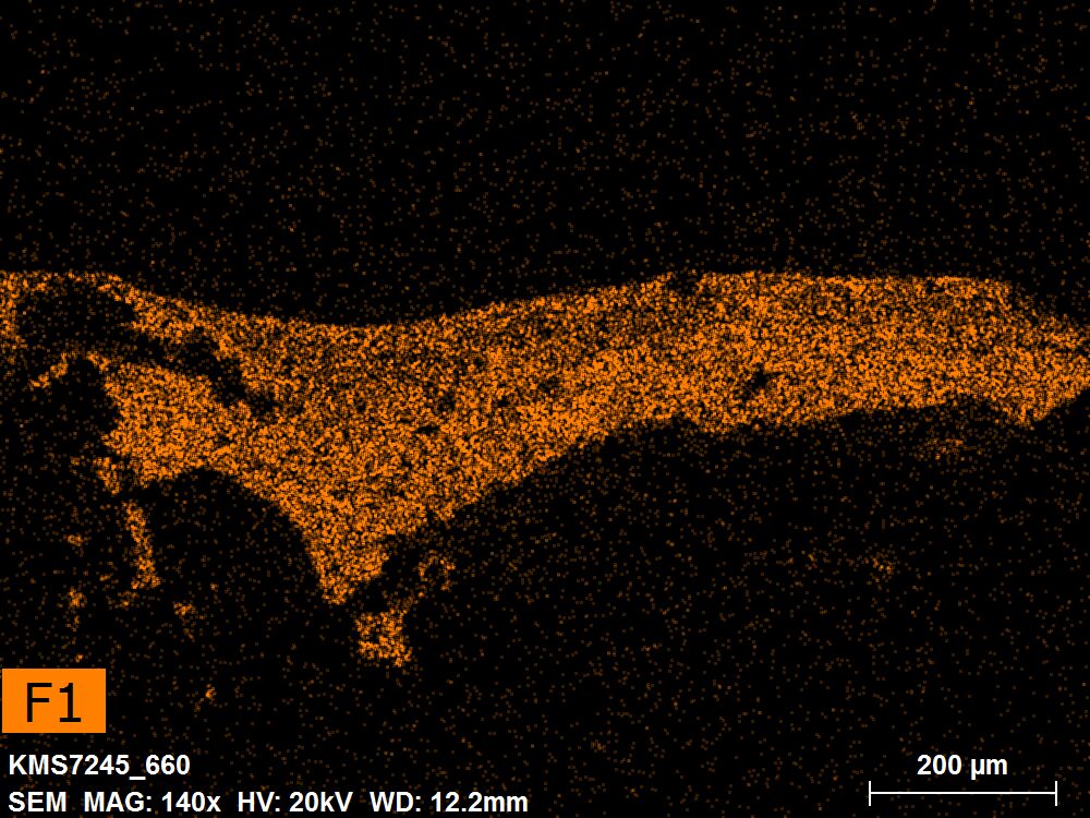 SEM-EDXS er en analysemetode, der giver meget detaljerede billeder på mikroskopisk niveau samtidig med, at den bestemmer sammensætningen af grundstoffer i en prøve. Metoden bruges især til at studere stratigrafien i farvesnit i meget lille skala, til at identificere den kemiske opbygning af pigmenter, fyldstoffer og nedbrydningsprodukter, samt til at påvise sporelementer, der kan indikere bestemte materialer. Nedenfor henviser grundstofferne angivet i parentes til grundstoffer, hvis relative forekomst er under 10 % af det samlede signal. Grundstofbilledet F1 herunder repræsenterer Pb M-linjen. Læs mere om dette under SEM-EDXS i ordlisten.