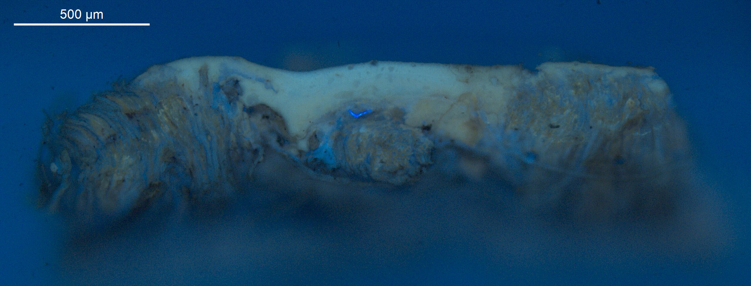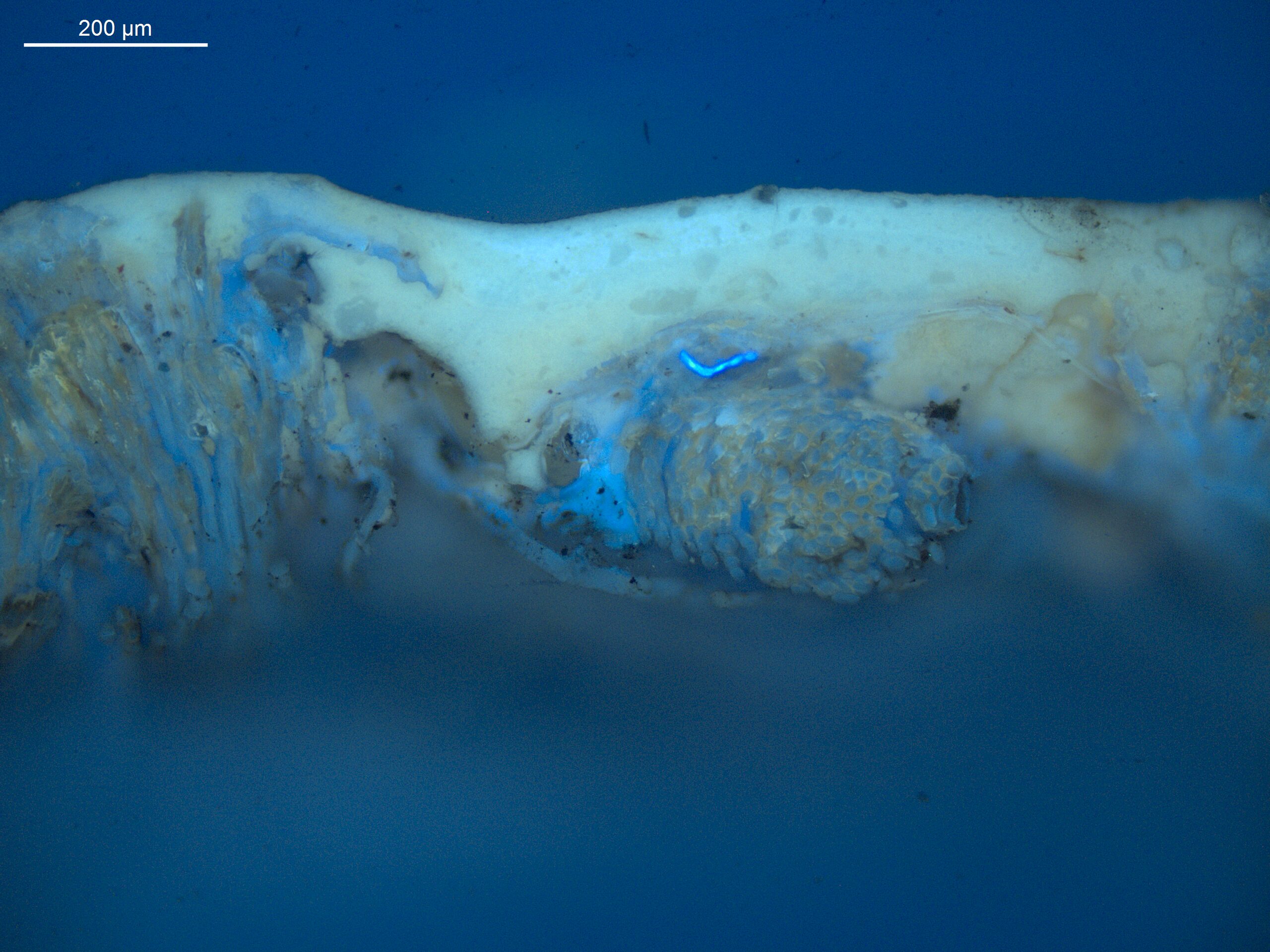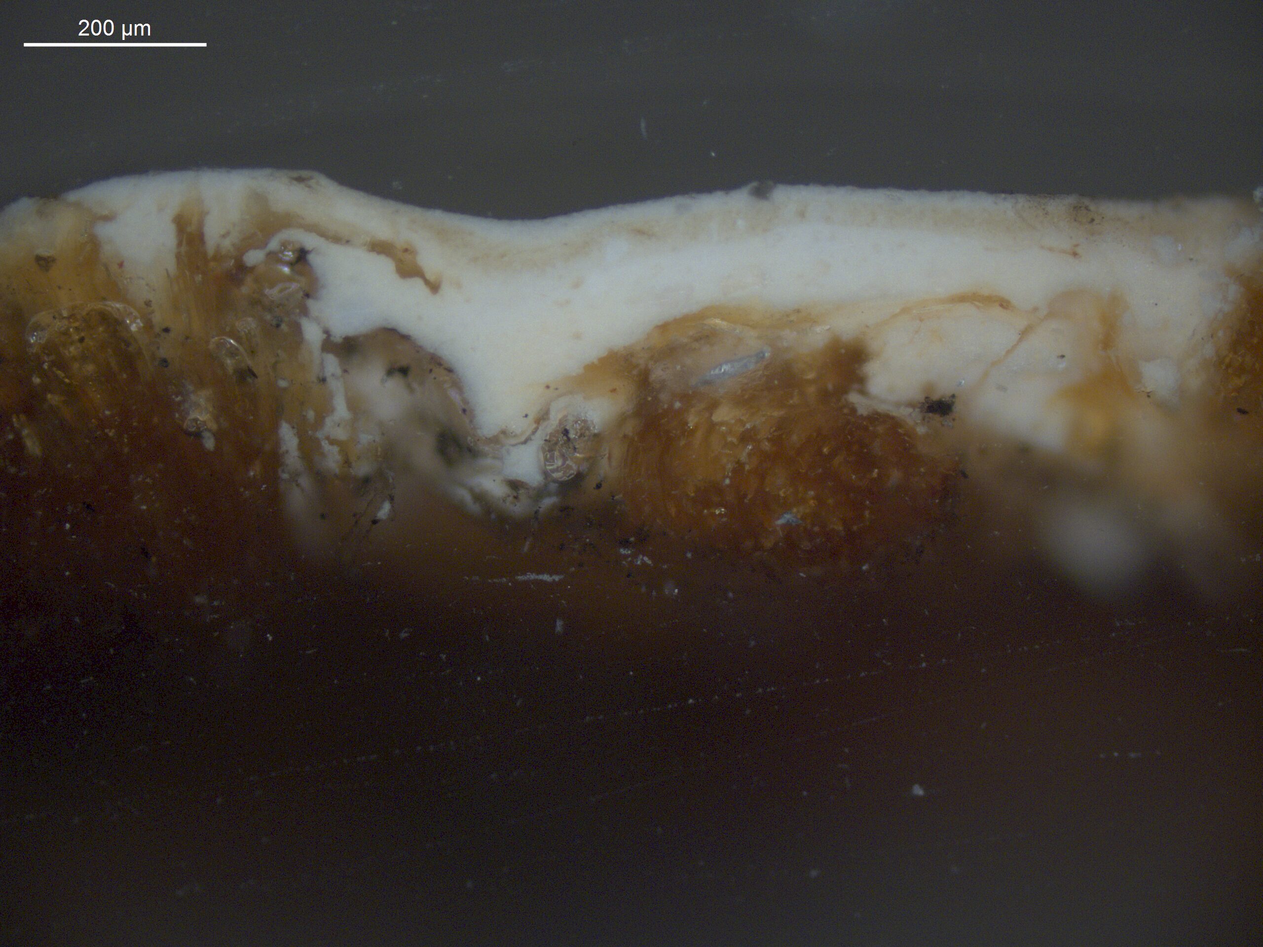 Optisk mikroskopi anvender synligt lys og linser til at forstørre og undersøge maleriets overflade og strukturer. Når teknikken bruges til at undersøge tværsnit af farveprøver gør optisk mikroskopi det muligt at nærstudere maleriets stratigrafi (lagstruktur) og pigmentpartikler. Teknikken anvendes ofte sammen med forskellige belysningstyper, såsom mørkefelt og UV-fluorescens, for at forbedre analysen. Lag nummer 1 under resultater nedenfor henviser til det nederste lag i farvesnittet.
